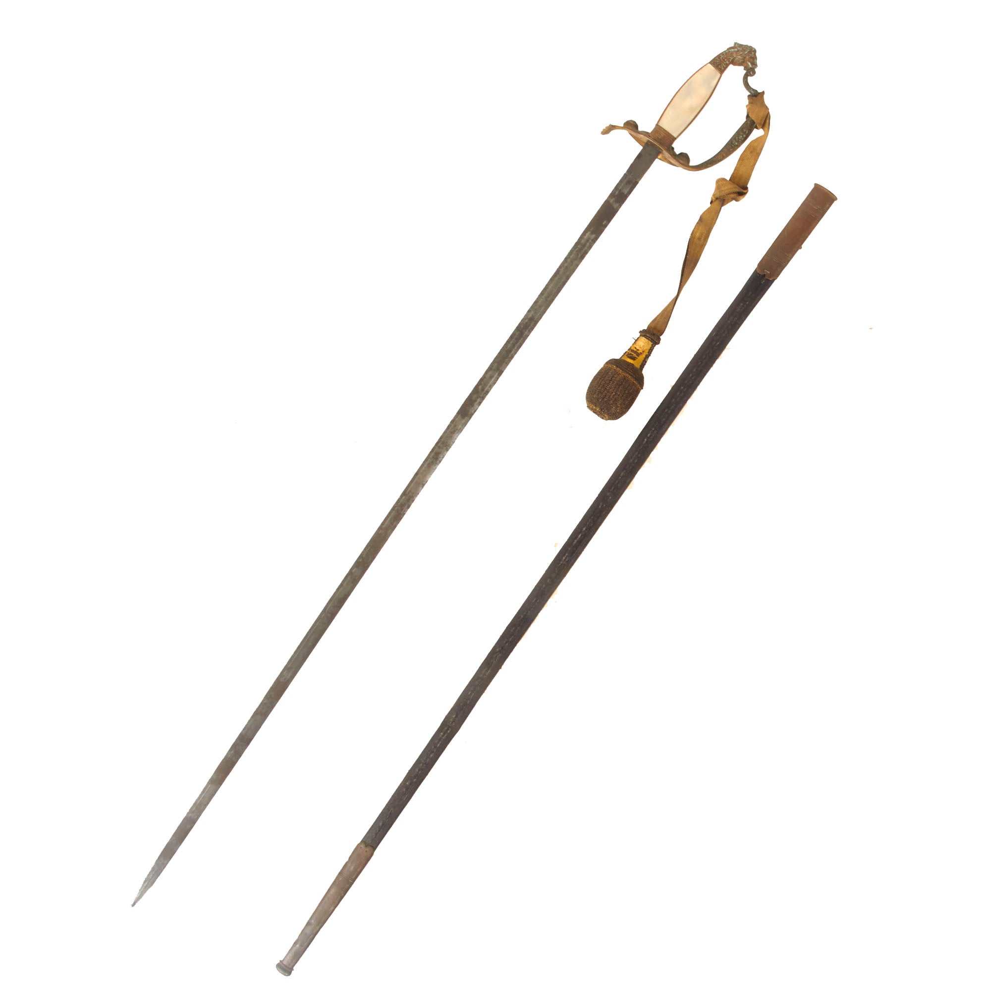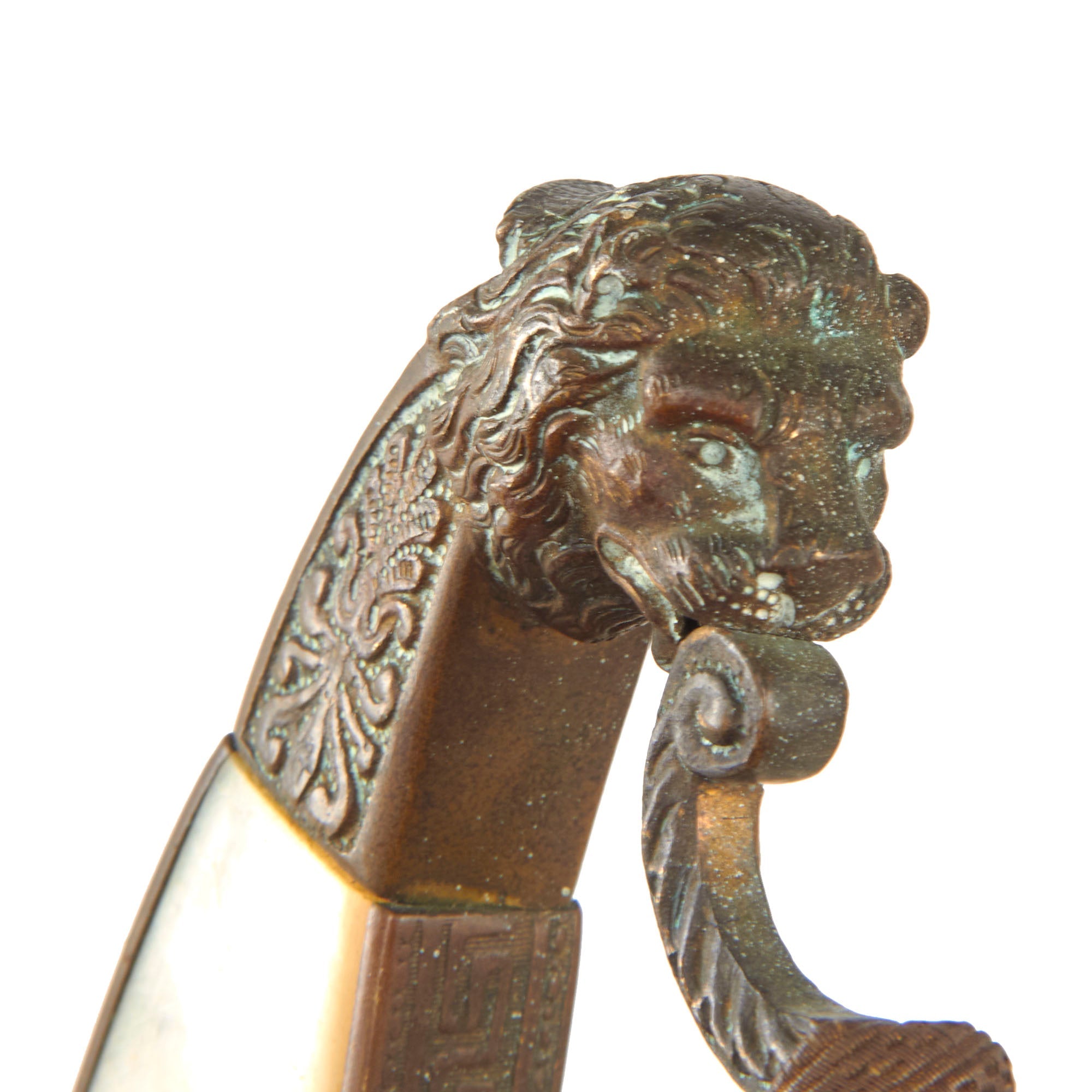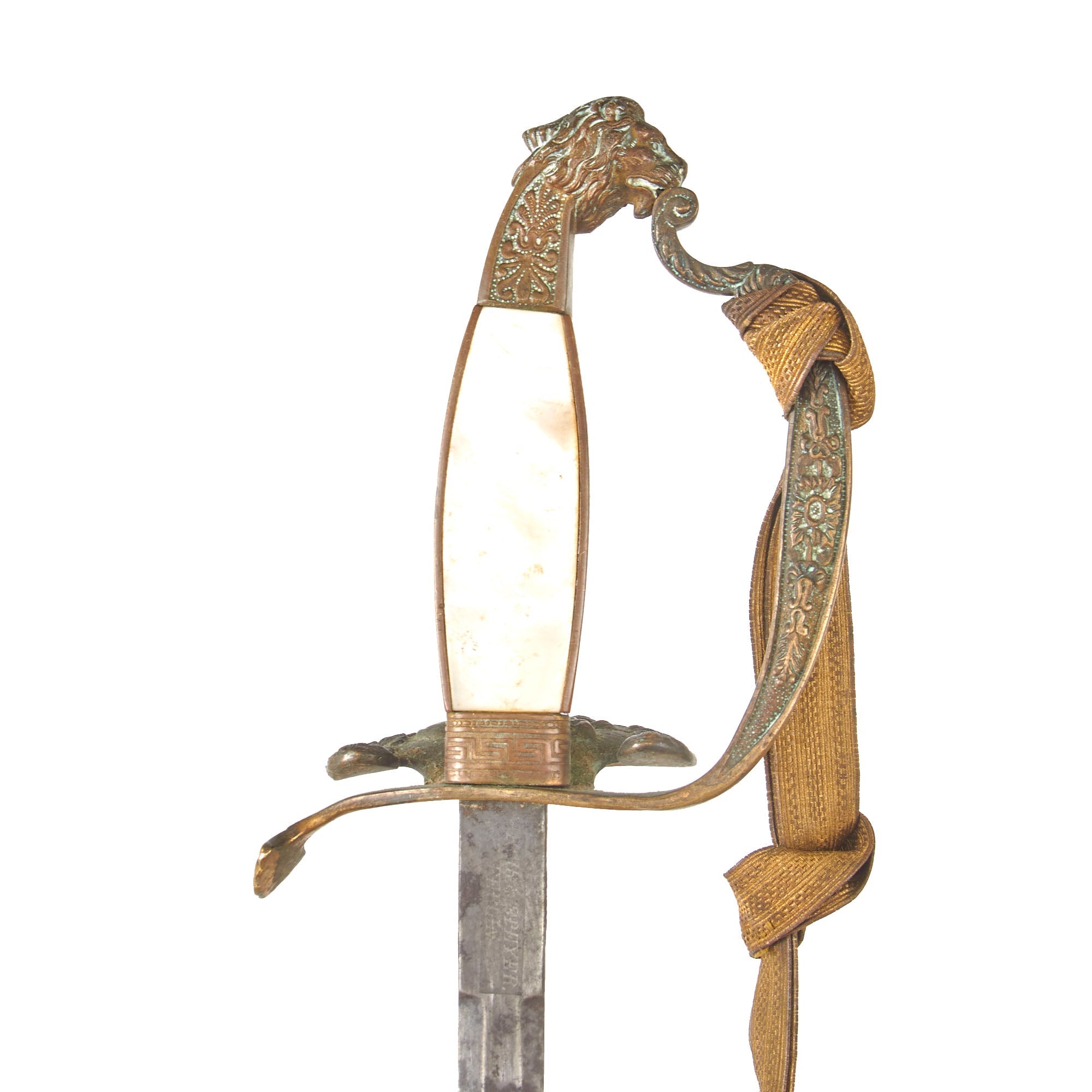 Original Item. Only One Available. This is a rather lovely Bavarian officer’s court sword manufactured by the prestigious firm of Mohr & Speyer of Berlin, suppliers of the Berlin Court. The sword has heavy verdigris across the hilt with a brass lion’s head pommel and mother of pearl grip inlaid with a Bavarian crown motif to one side.