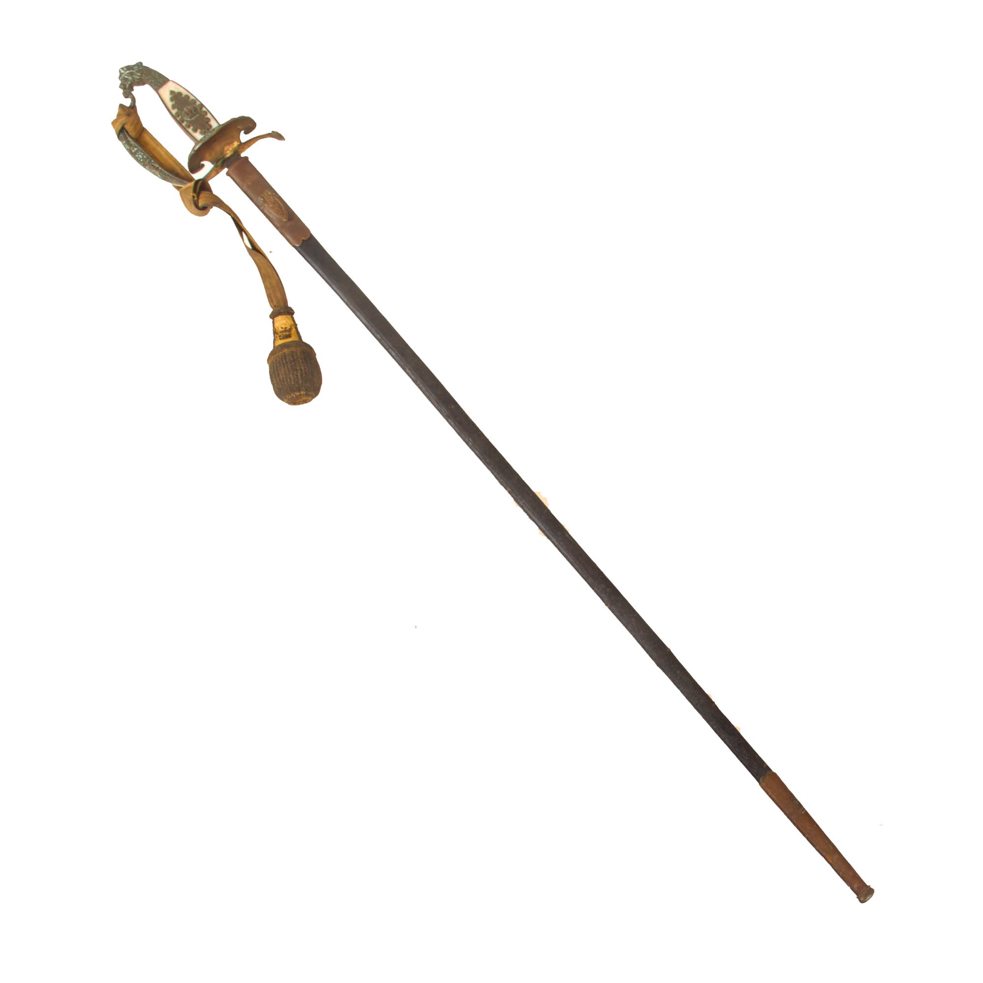 The original troddel knot is still attached with bullion crowns stitched onto both sides of the throat, though about half of this bullion is now gone. The blade is etched with the Bavarian motto “In Treue Fest” surrounded by decorative border and foliage. The blade has very heavy oxidation and wear with the etching now very faint. The original brass-bound leather scabbard is in good order with some bending.