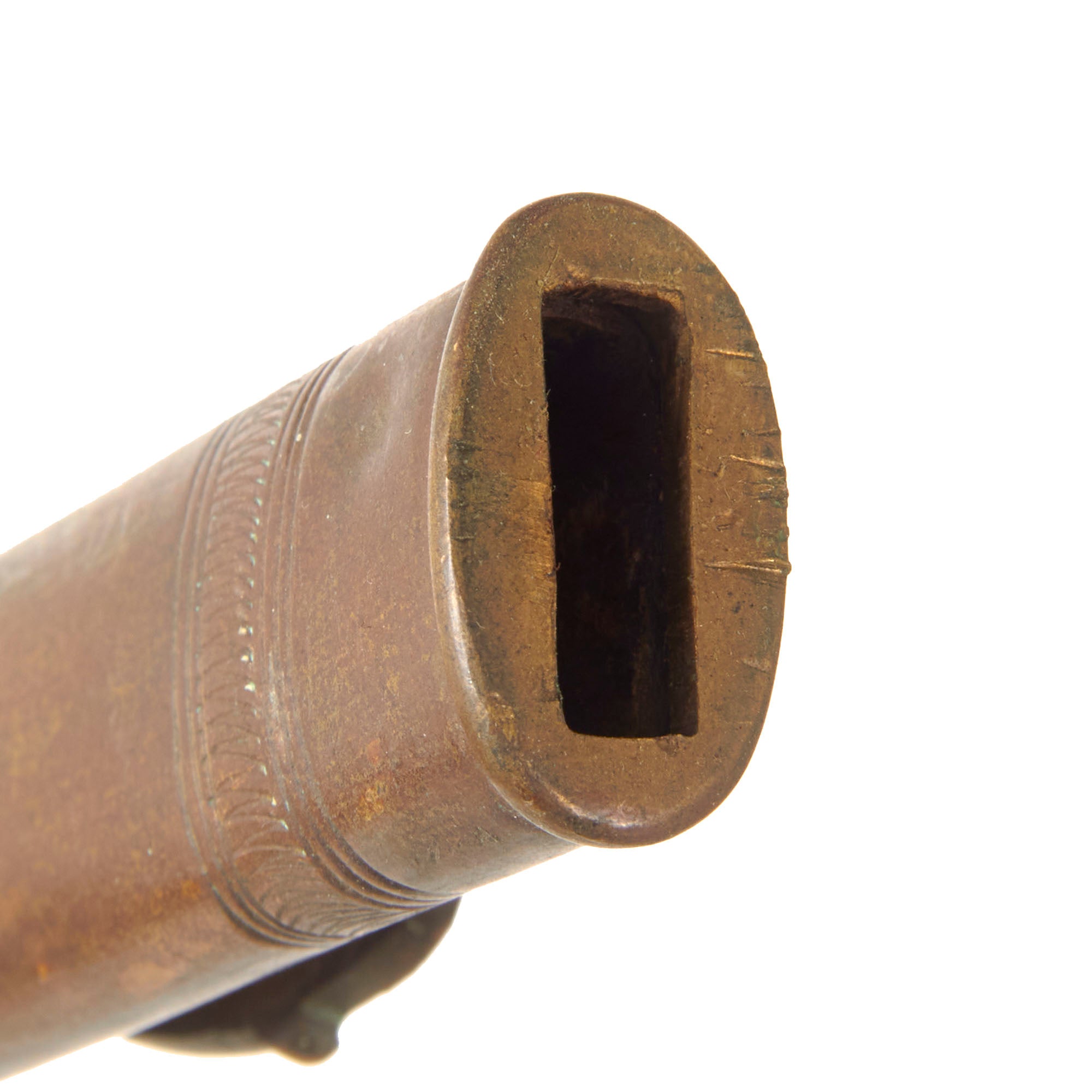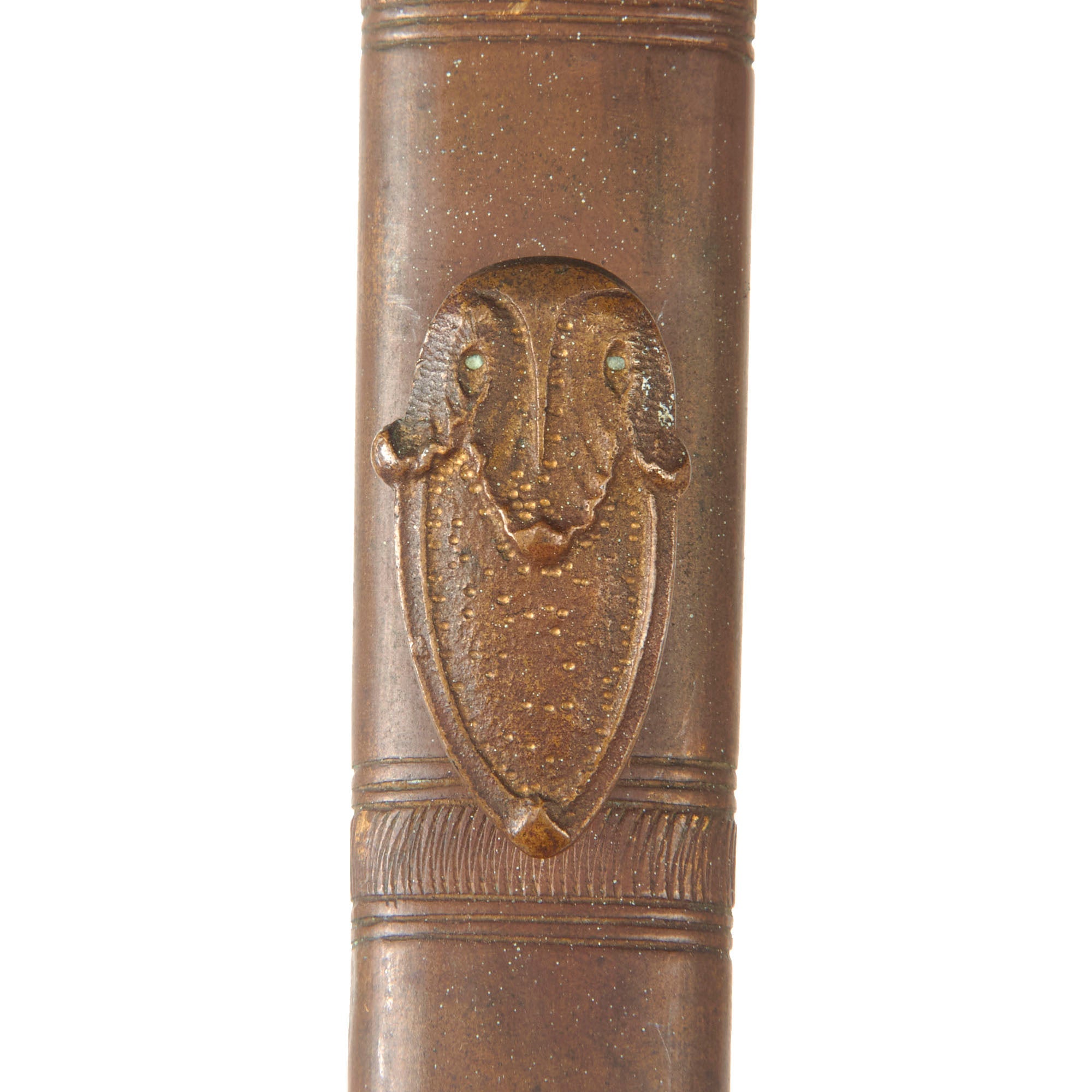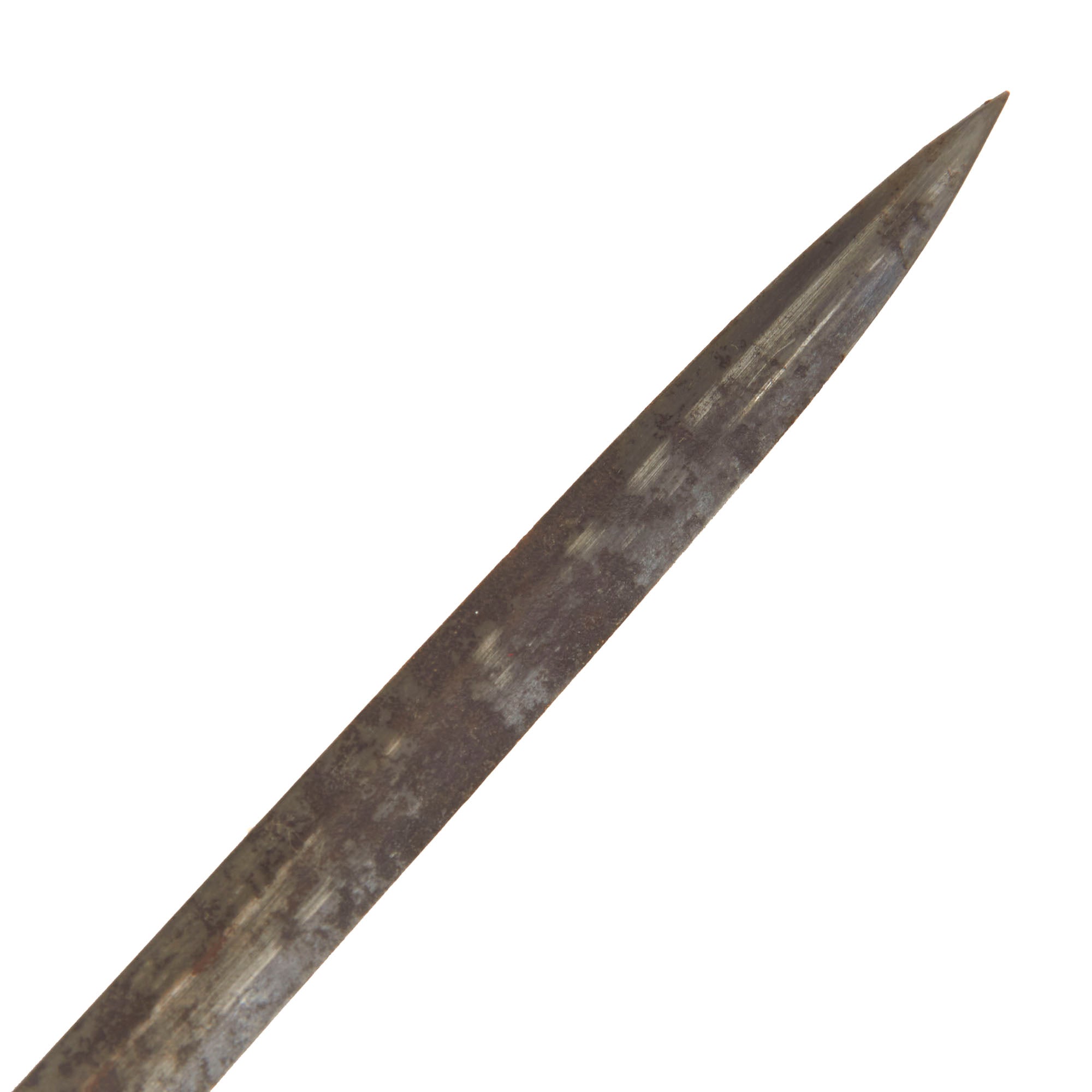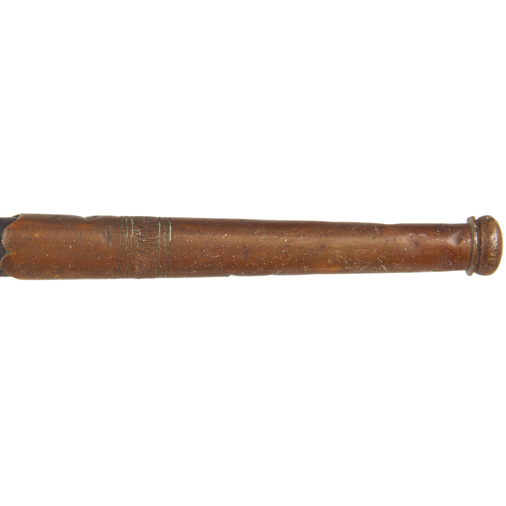 The 31” scabbard is in good condition with heavy wear and minor bending to the leather. The leather has shrunken a bit so it doesn’t completely fit over the ricasso. The brass drag and throat are well-retained though the frog button is a bit bent.