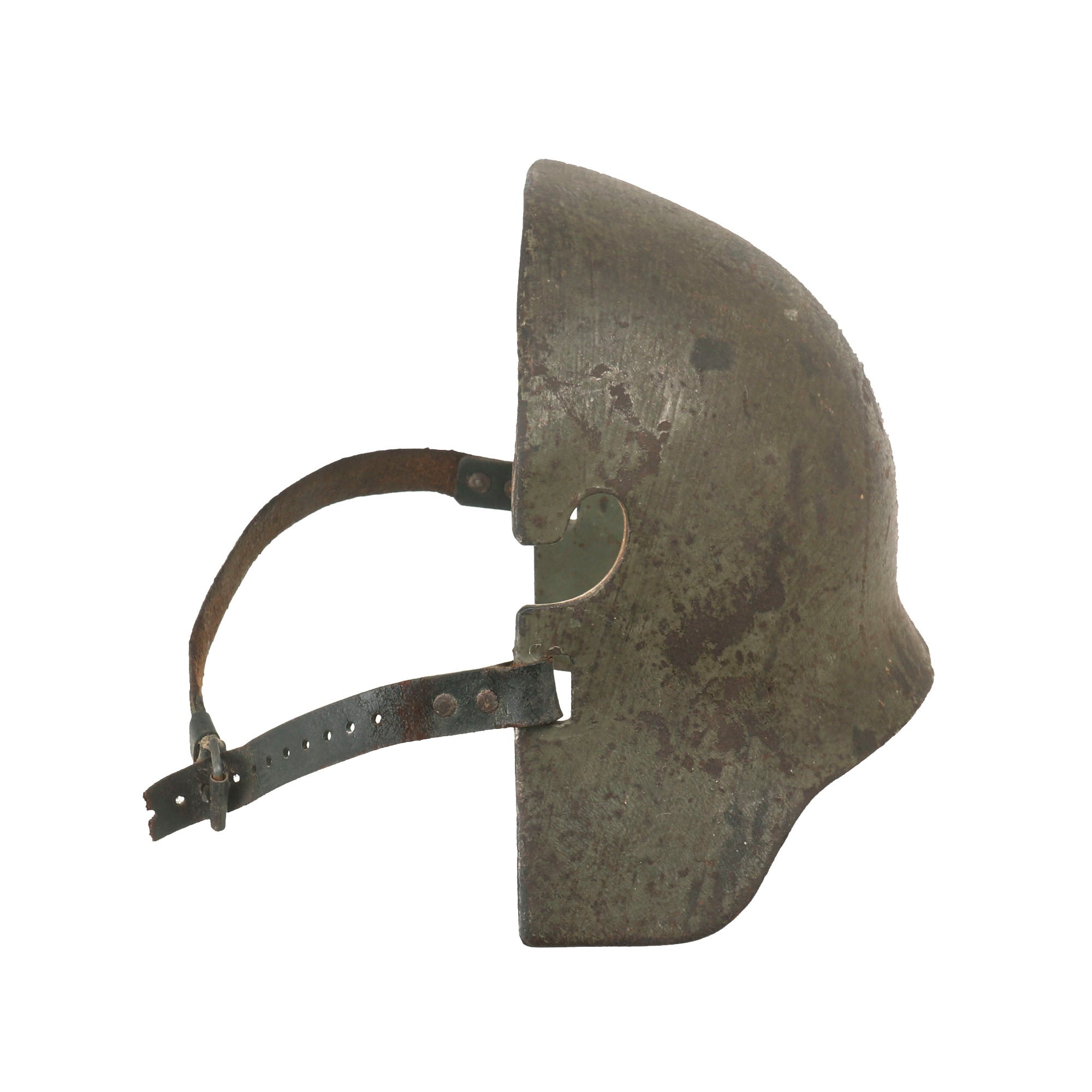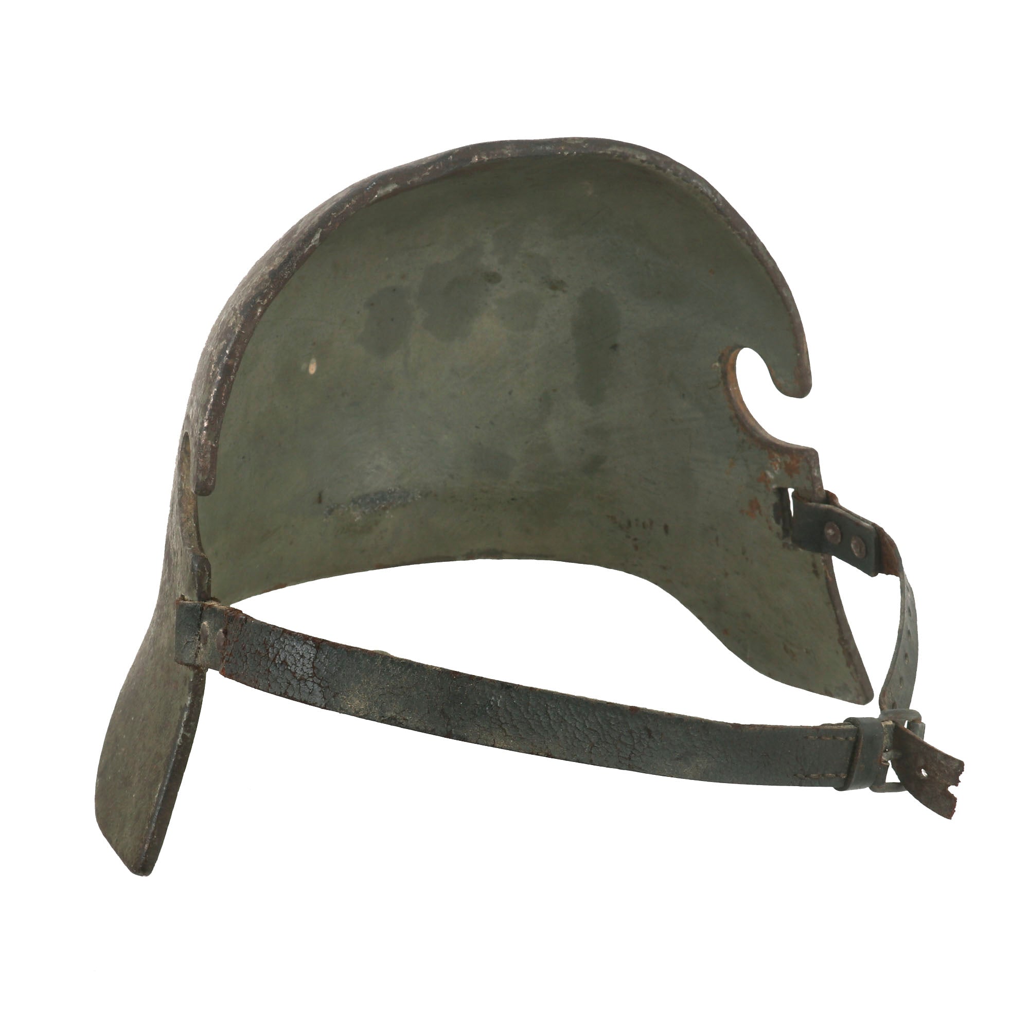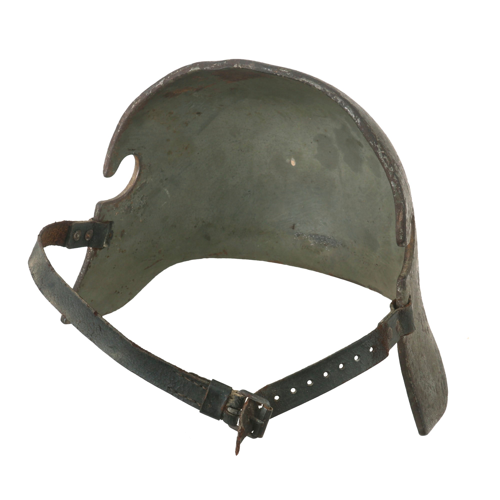 Original Item. Only One Available. One piece of Imperial German militaria which has become increasingly difficult to authenticate in recent years is the Stirnpanzer, or Brow Plate. The Stirnpanzer has received many nicknames over the years including the Machine Gunner’s Plate, Sniper’s Plate, and Sentry Plate. Due to the high price these plates have brought, they have become increasingly reproduced over the years, and people have, of course, made attempts to artificially age & sell them as originals. This example is what many would refer to as a hen’s tooth, a completely genuine example that retains its “Bell” marking, indicating manufacture by R. Lindenberg A.G. of Remscheid-Hasten, and most of its original strap.