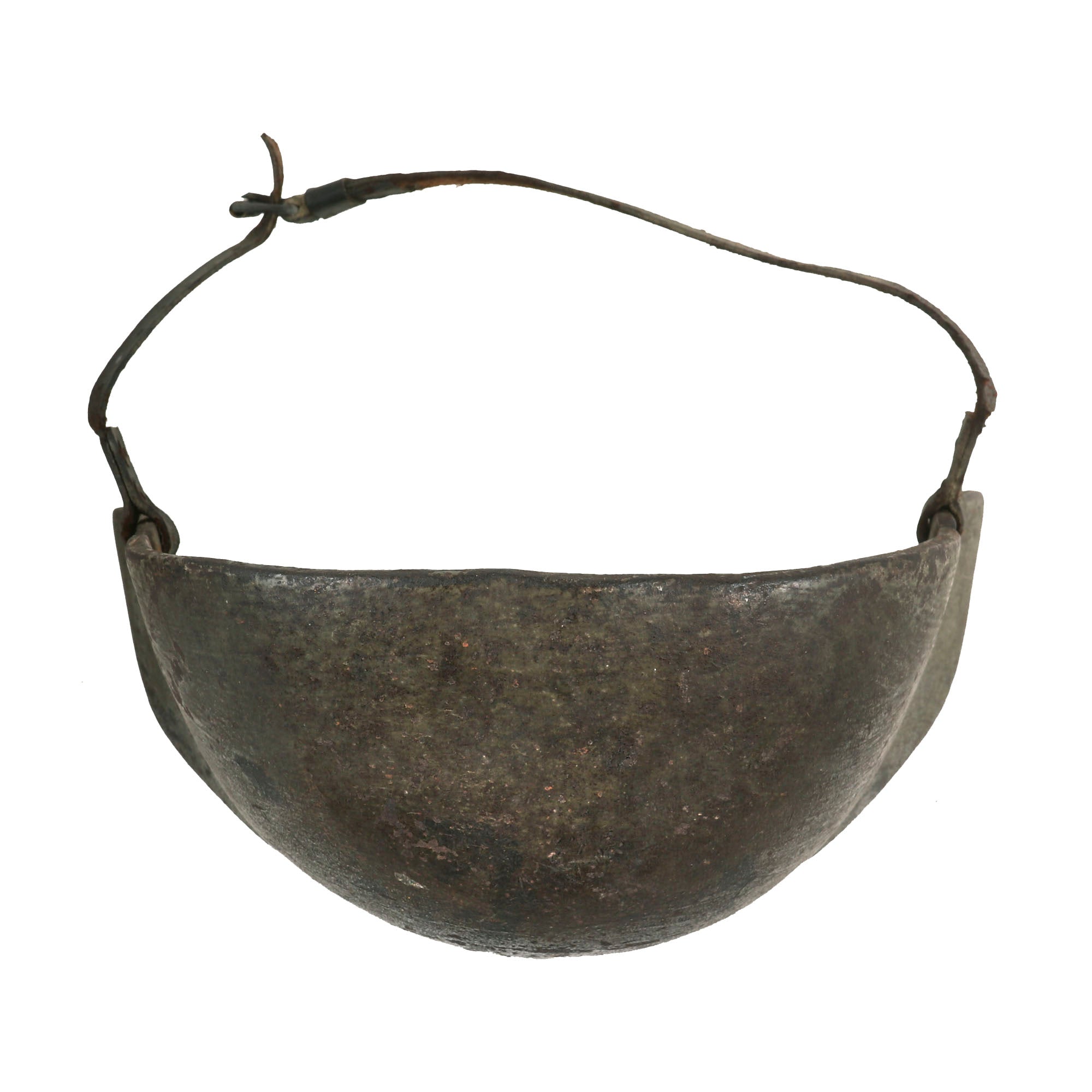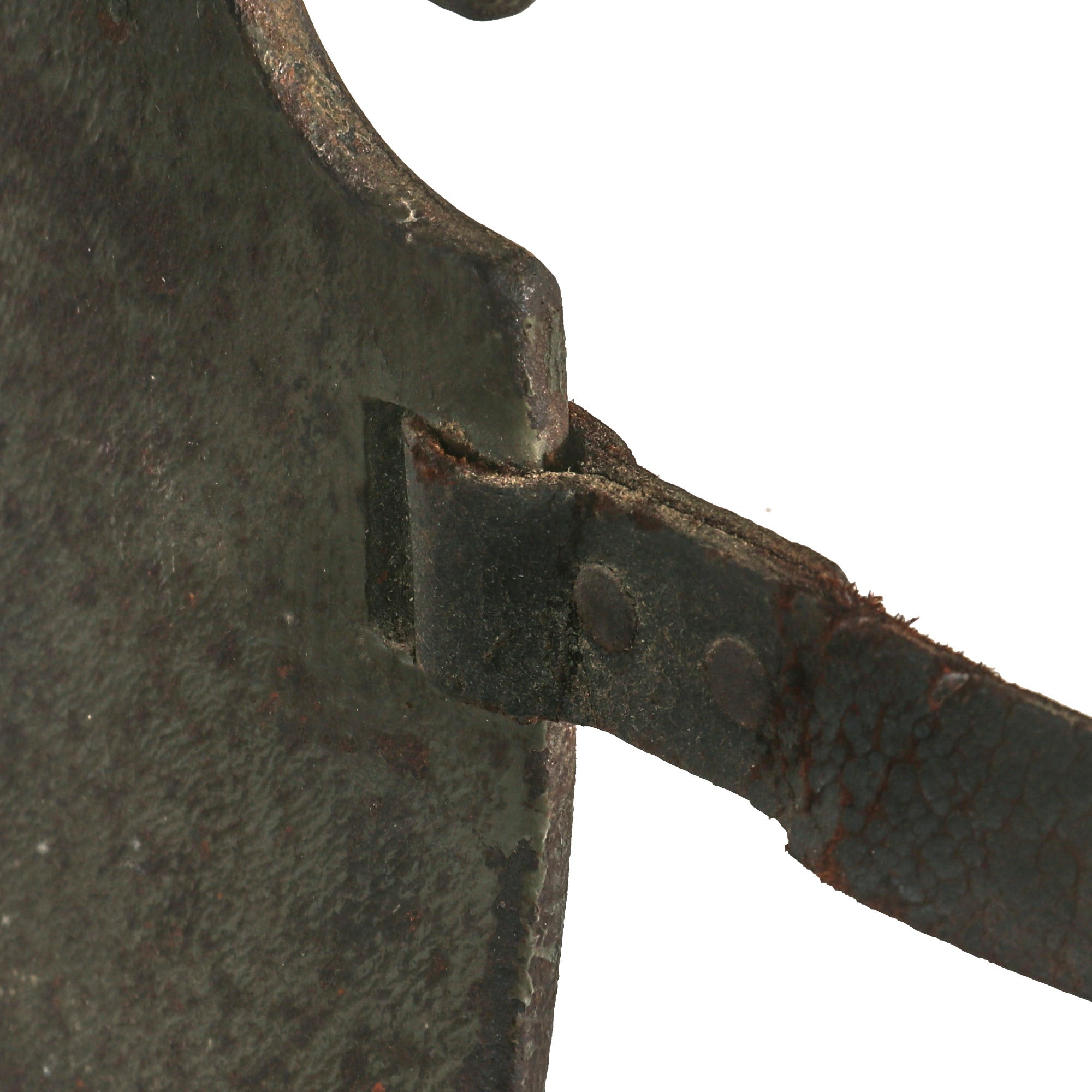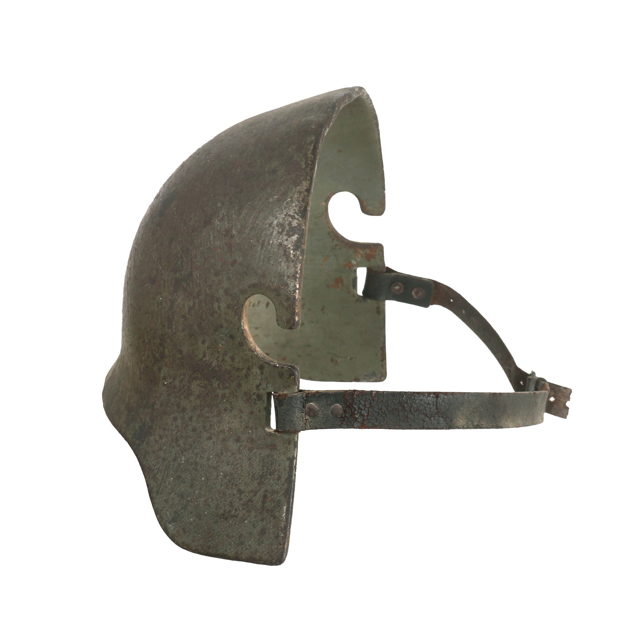 Original Item. Only One Available. One piece of Imperial German militaria which has become increasingly difficult to authenticate in recent years is the Stirnpanzer, or Brow Plate. The Stirnpanzer has received many nicknames over the years including the Machine Gunner’s Plate, Sniper’s Plate, and Sentry Plate. Due to the high price these plates have brought, they have become increasingly reproduced over the years, and people have, of course, made attempts to artificially age & sell them as originals. This example is what many would refer to as a hen’s tooth, a completely genuine example that retains its “Bell” marking, indicating manufacture by R. Lindenberg A.G. of Remscheid-Hasten, and most of its original strap.