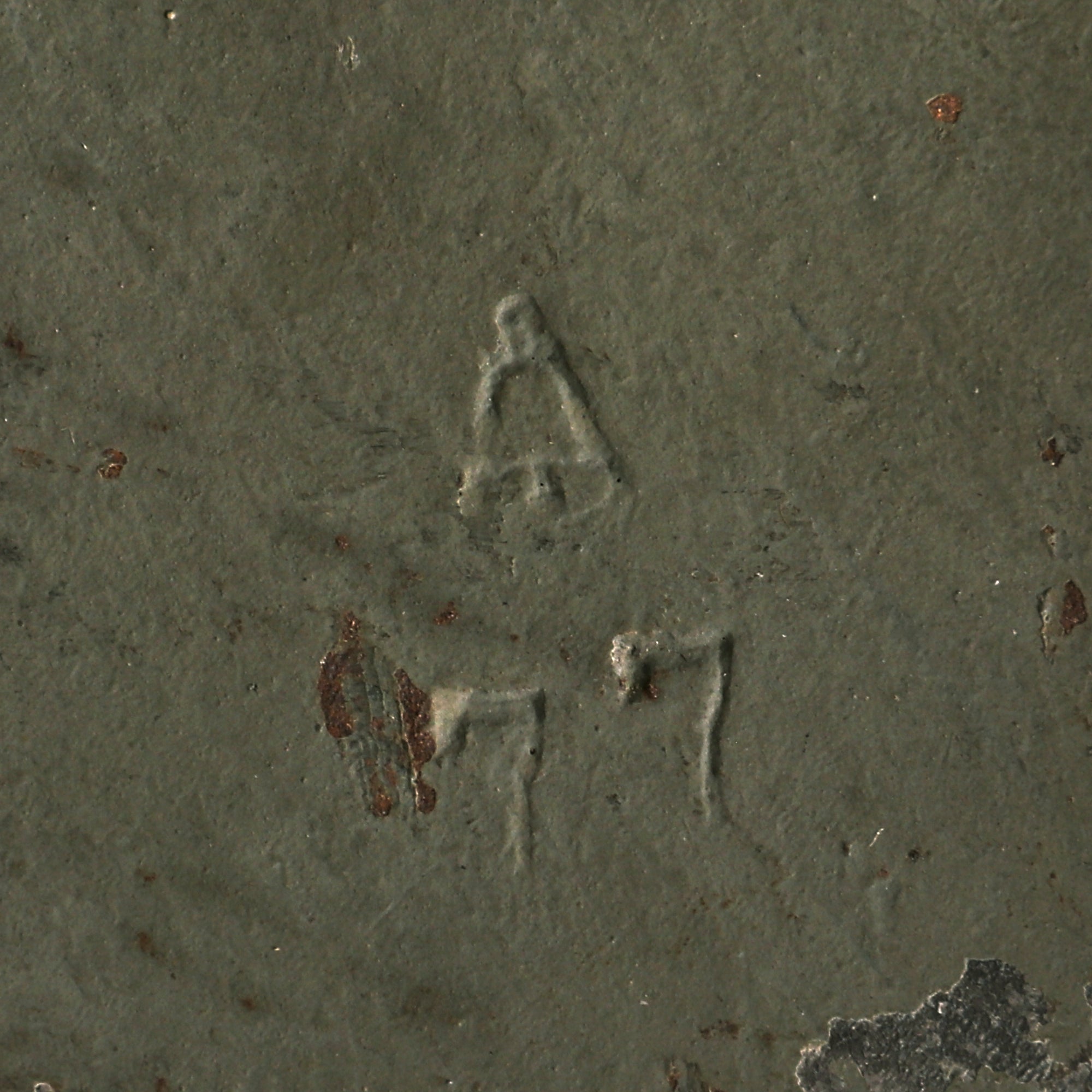 The Stirnpanzer is in fantastic shape overall with the front retaining roughly 80% of its original paint with a heavy amount of darkening and grime. The interior retains roughly 95% of its paint with some wear near the top. The interior right side bears the Bell marking of R. Lindenberg A.G. of Remscheid-Hasten, with 77 stamped beneath it, most likely the lot number.