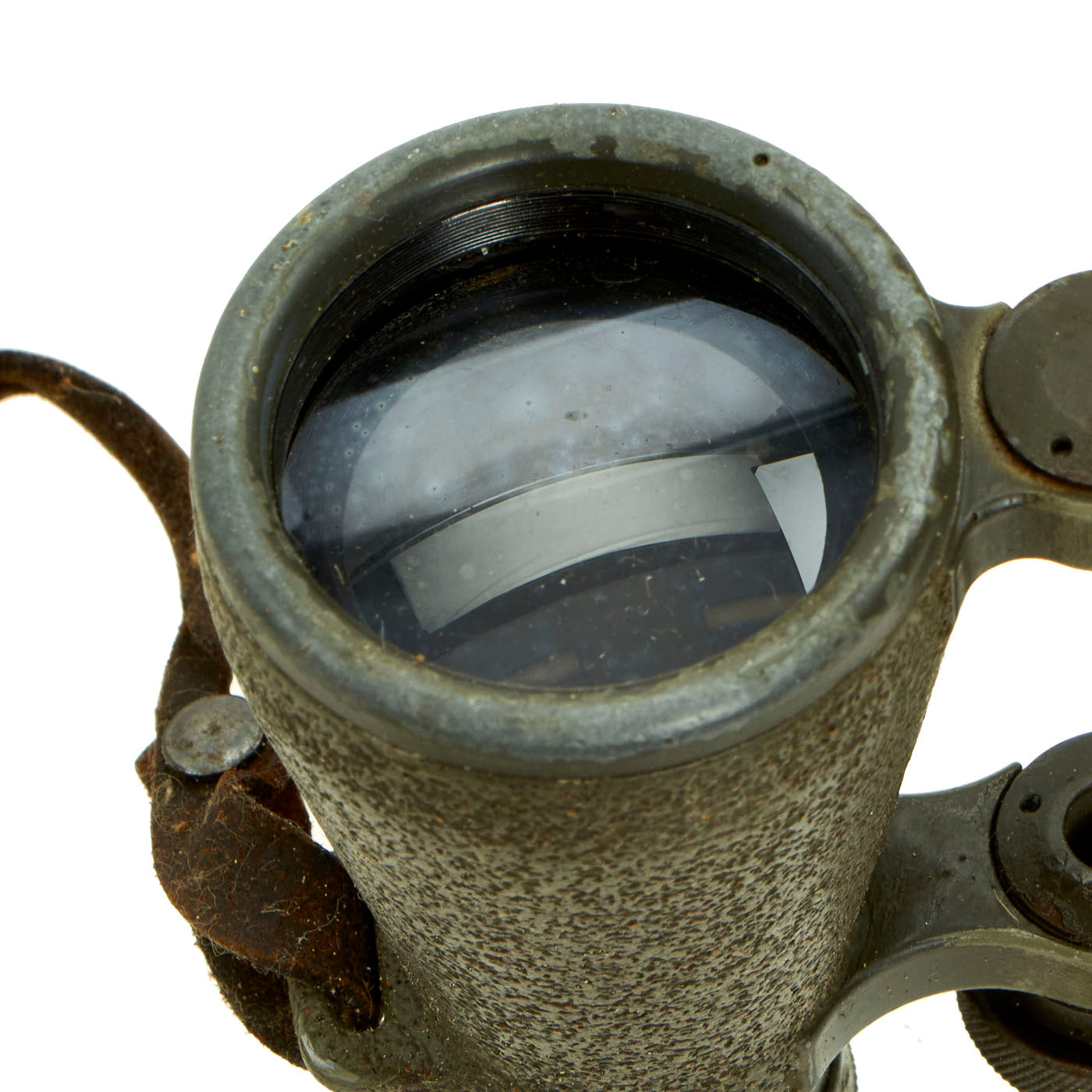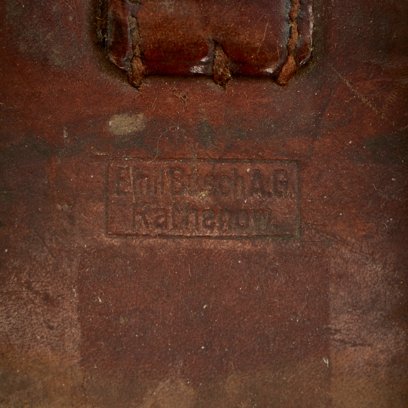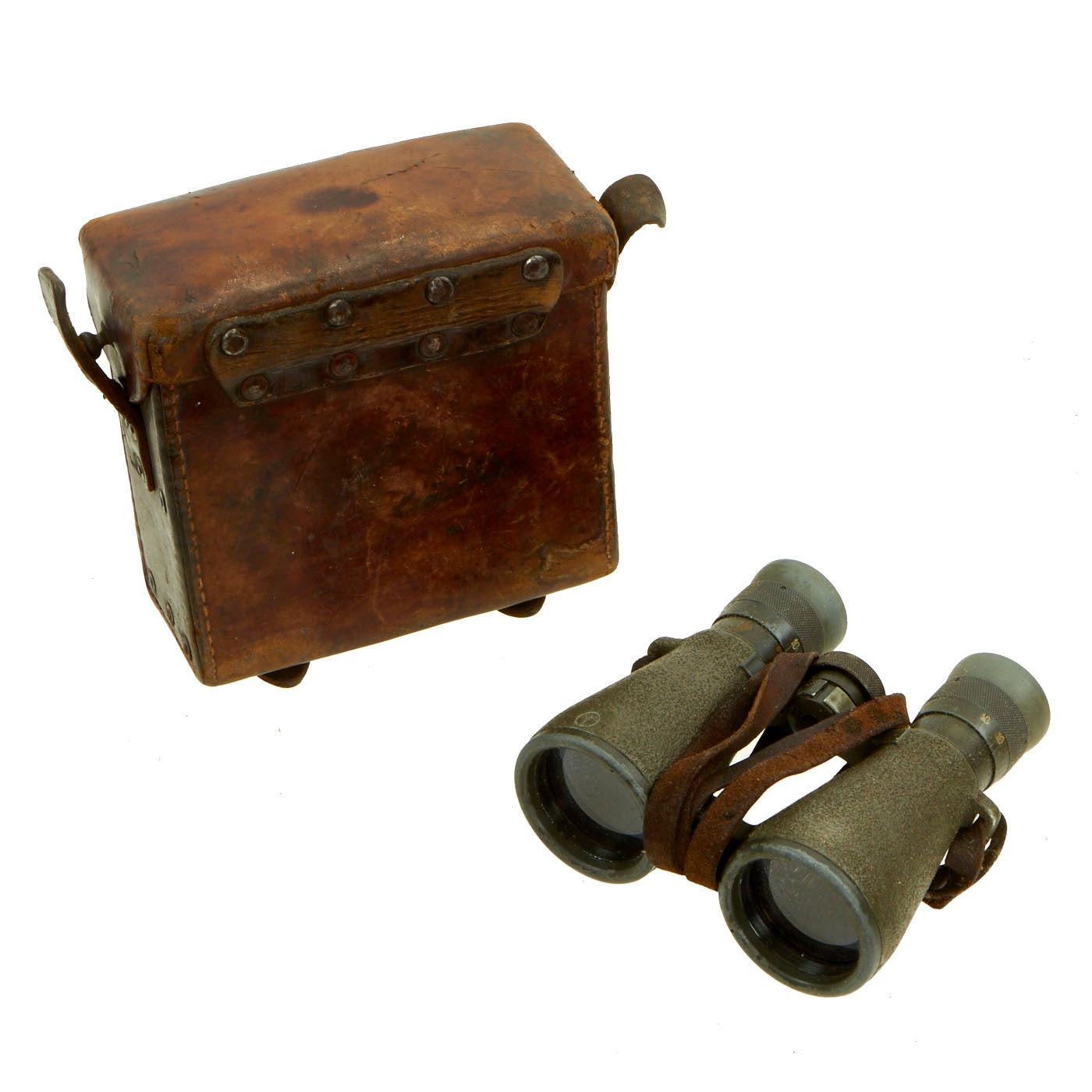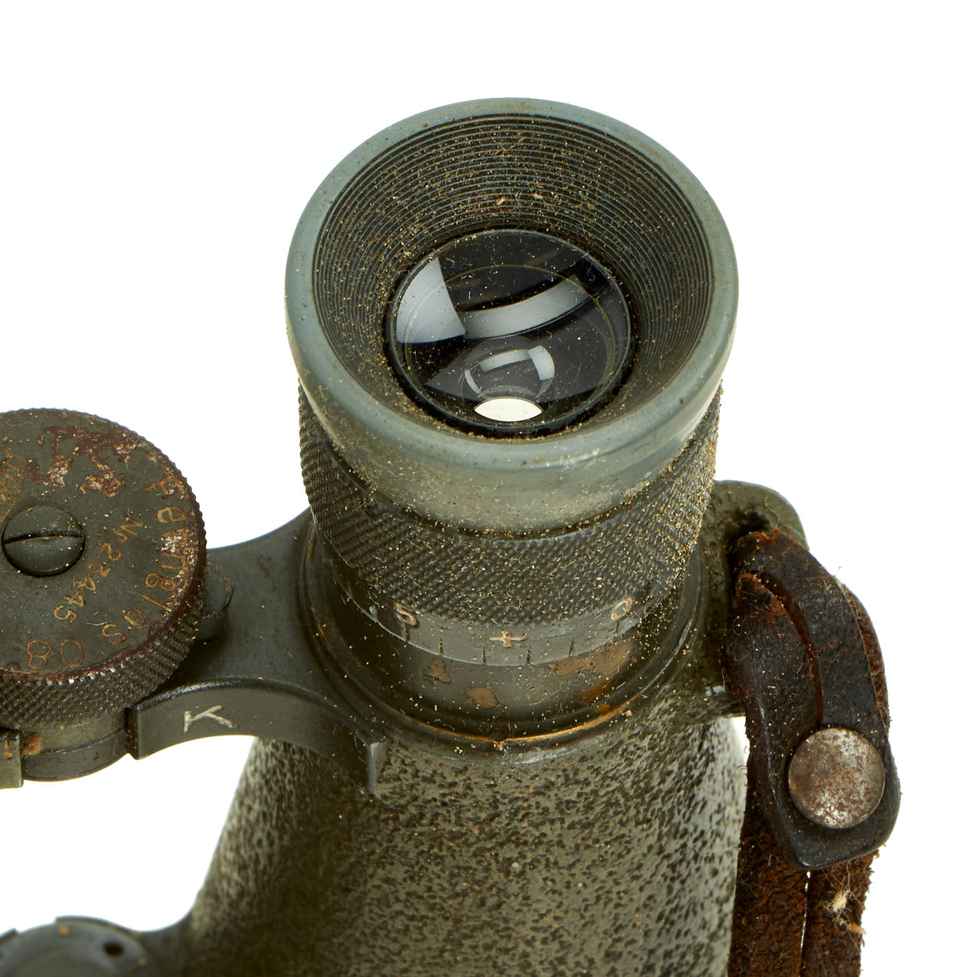 The included leather case is designed to strap to the waist belt and combat suspenders, and was made by EMIL BUSCH AG of RATHENOW. It still has the original Gebrauchsanweisung für das Fernglas 08 (Instructions for use for the binoculars 08) attached to the inside of the top cover. The leather is in good shape, though the top closure straps have degraded slightly.