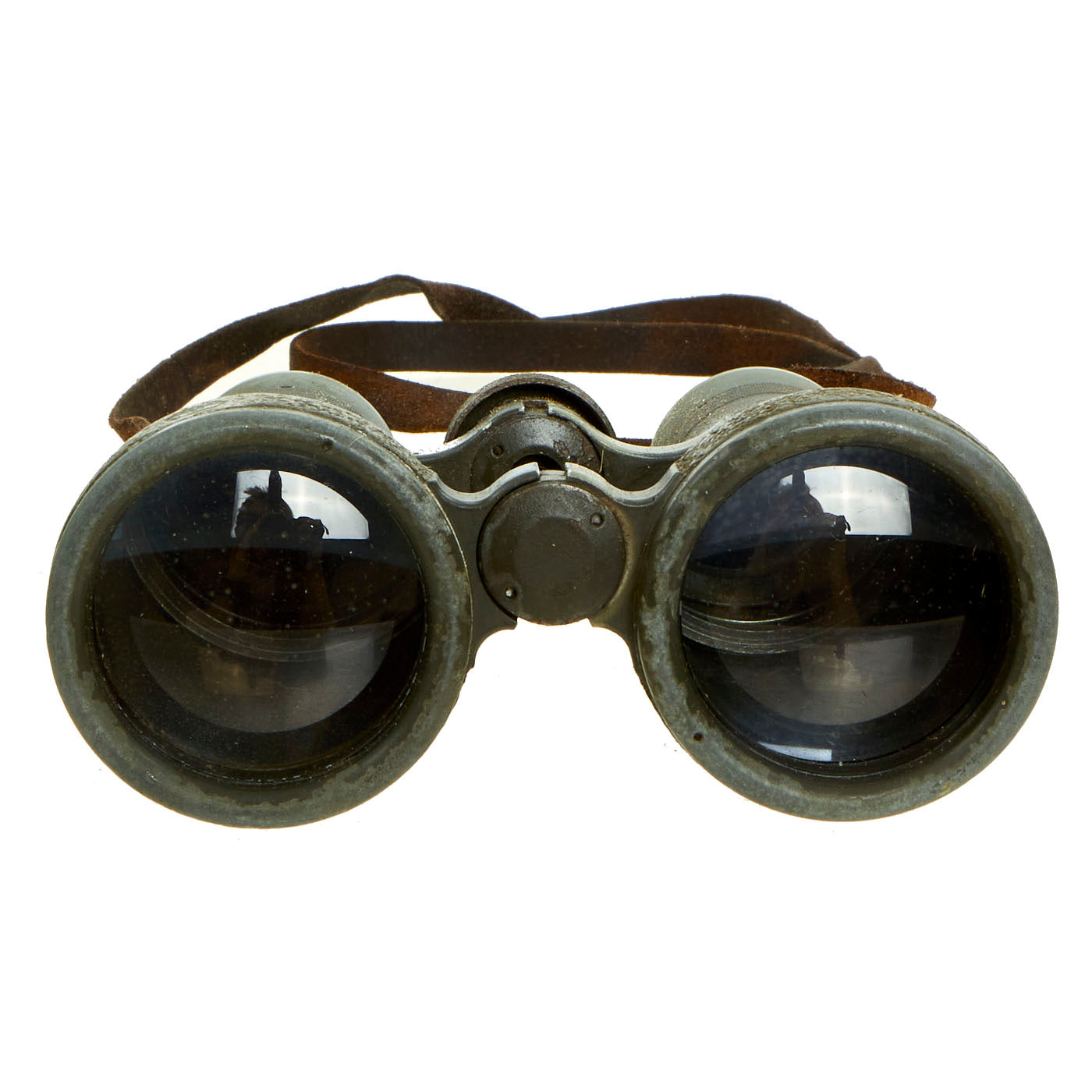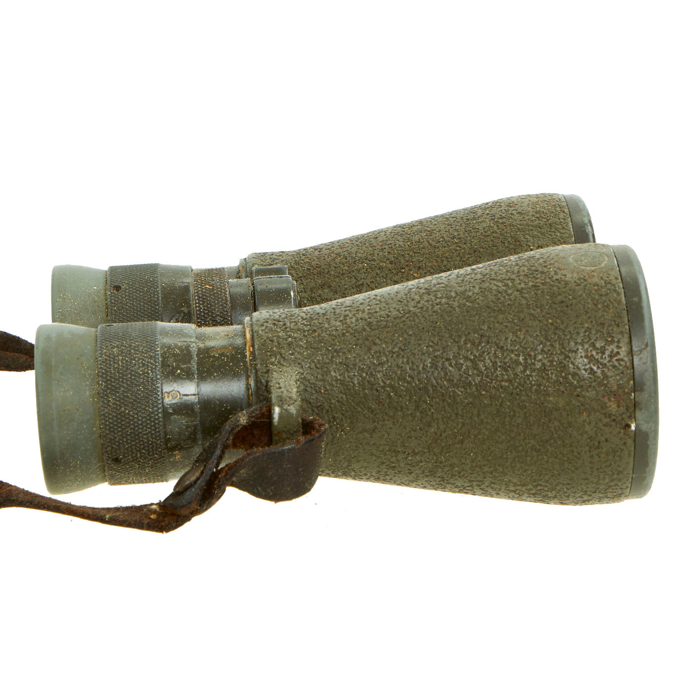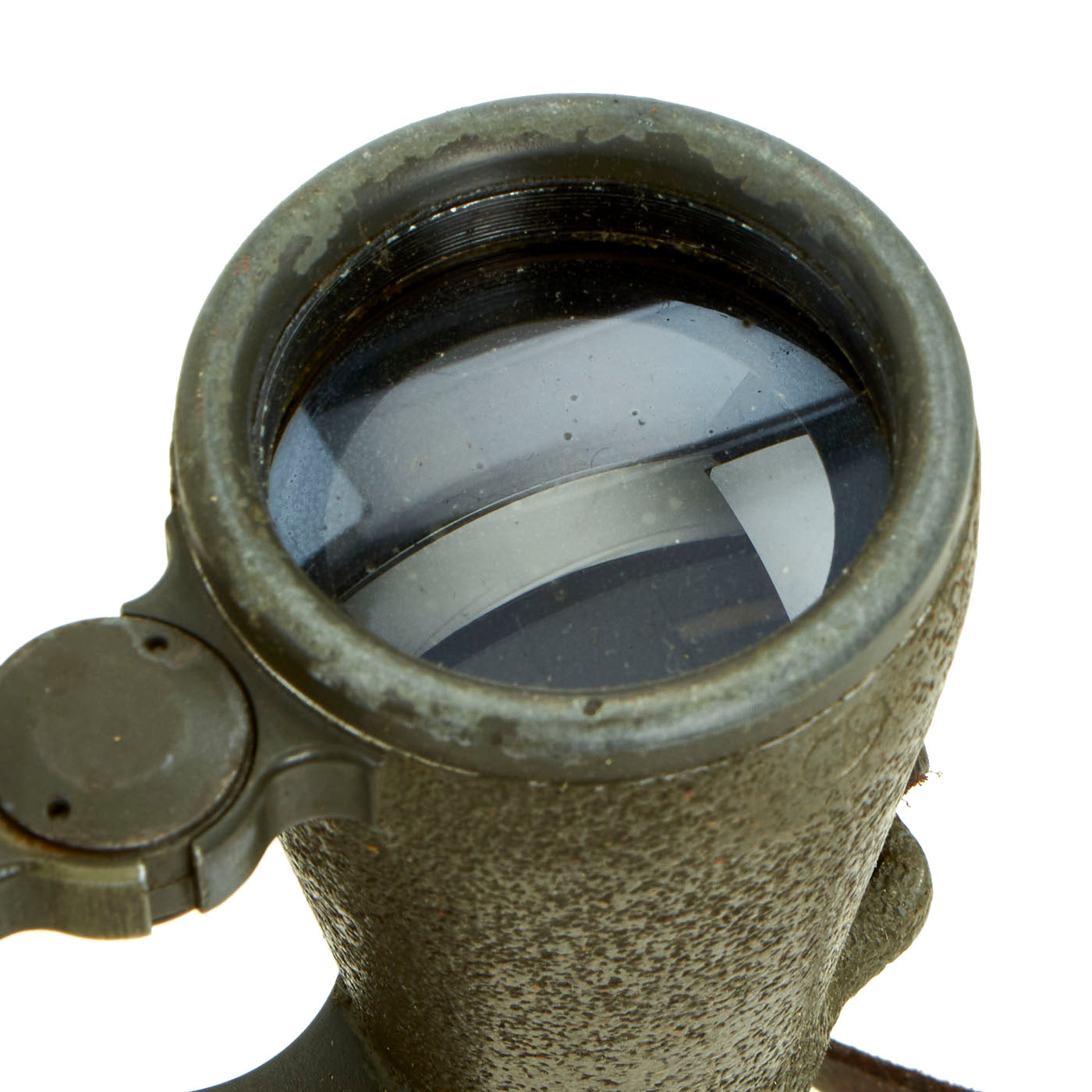 The included leather case is designed to strap to the waist belt and combat suspenders, and was made by EMIL BUSCH AG of RATHENOW. It still has the original Gebrauchsanweisung für das Fernglas 08 (Instructions for use for the binoculars 08) attached to the inside of the top cover. The leather is in good shape, though the top closure straps have degraded slightly.
