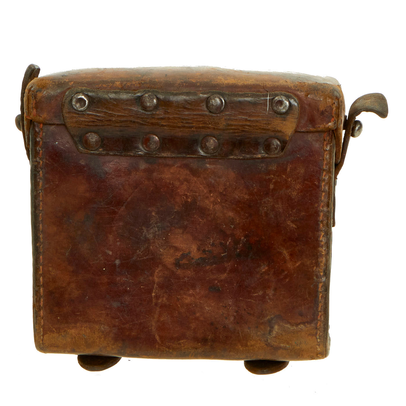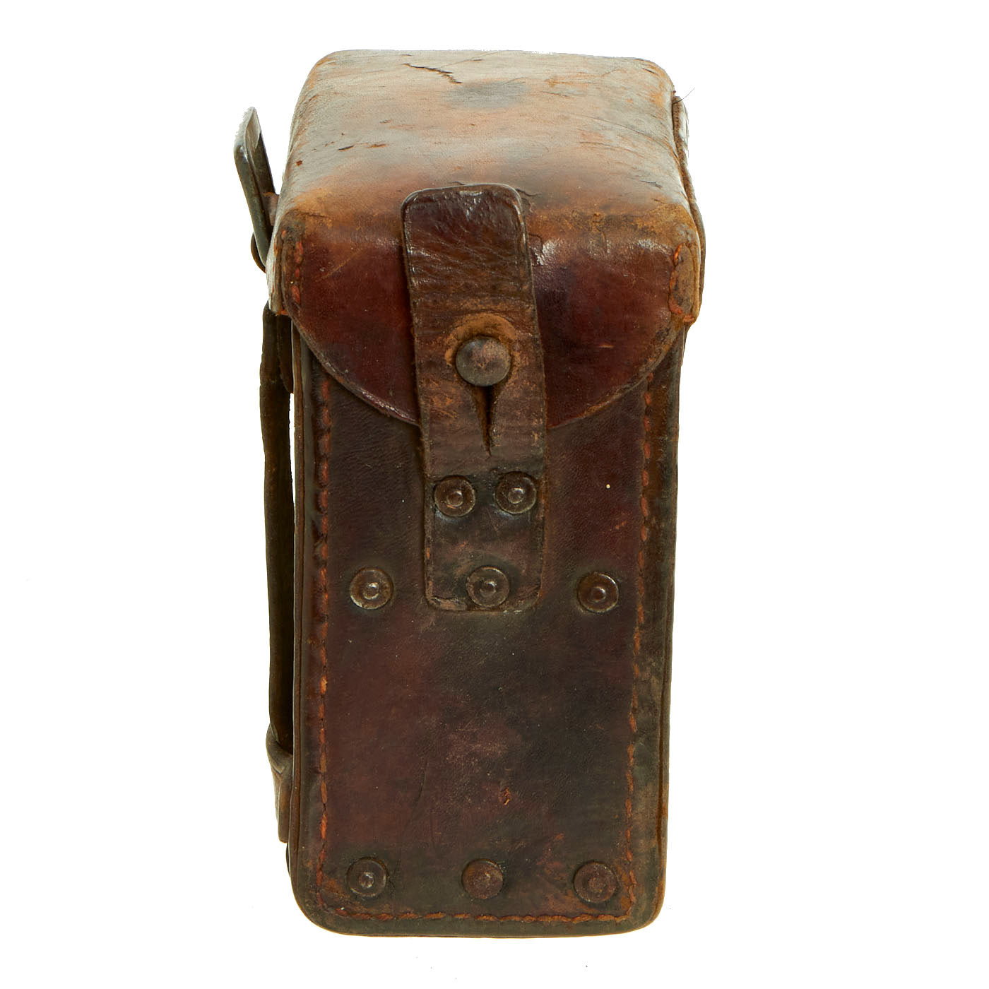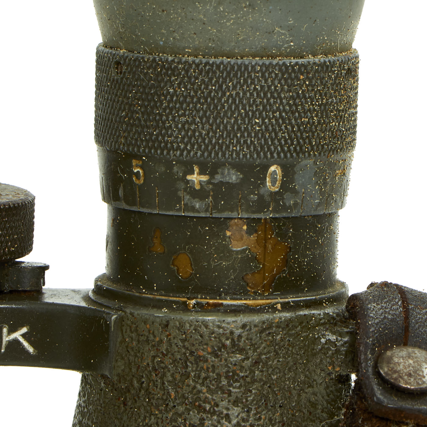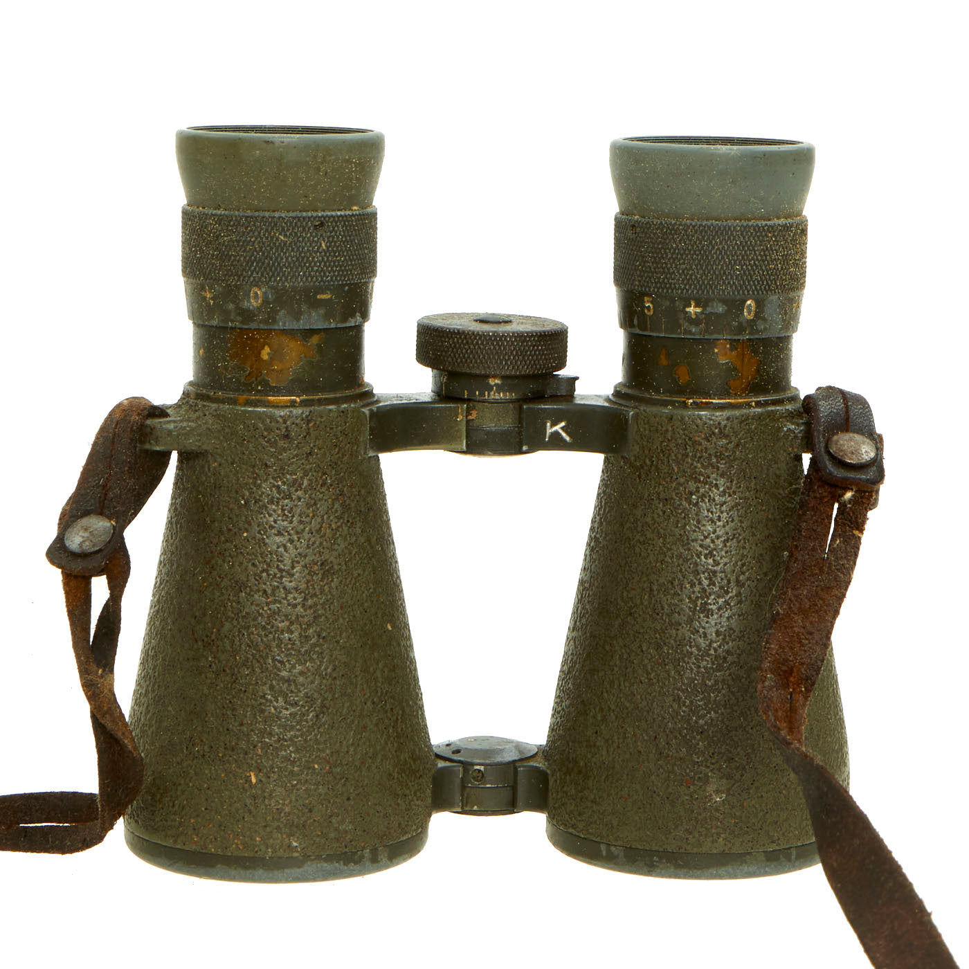 The included leather case is designed to strap to the waist belt and combat suspenders, and was made by EMIL BUSCH AG of RATHENOW. It still has the original Gebrauchsanweisung für das Fernglas 08 (Instructions for use for the binoculars 08) attached to the inside of the top cover. The leather is in good shape, though the top closure straps have degraded slightly.