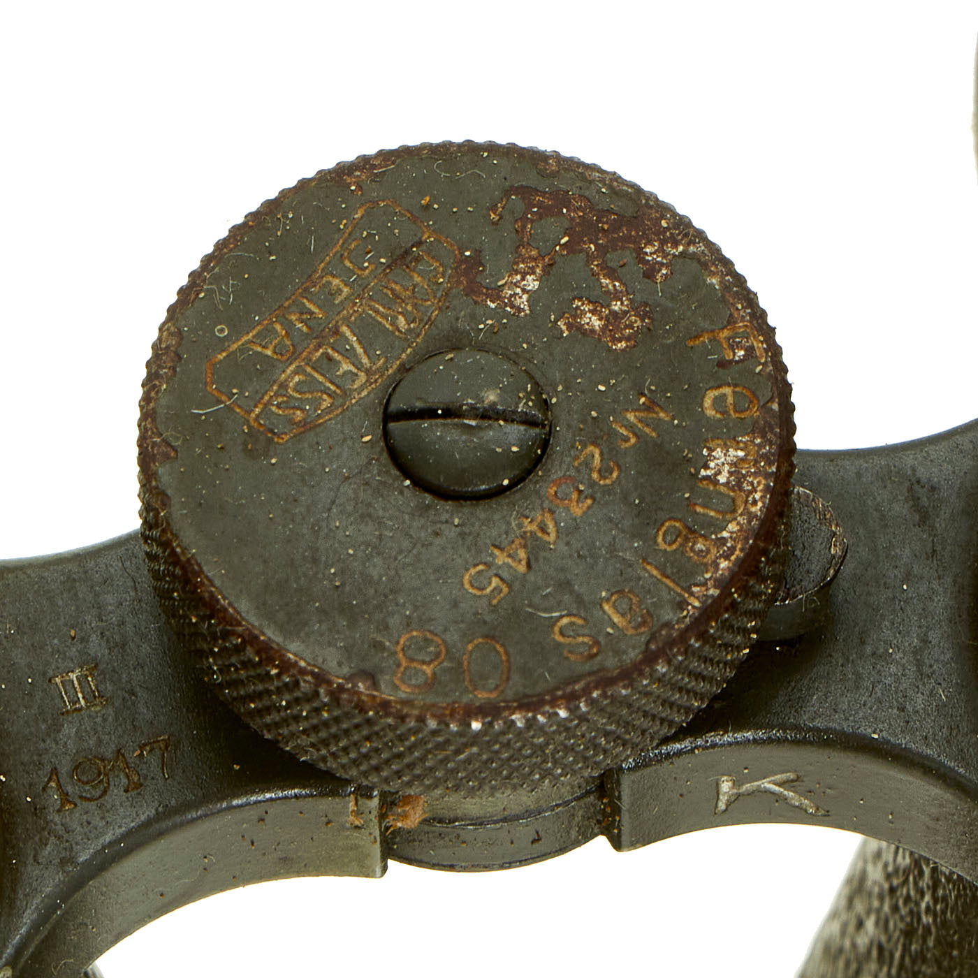 The left hinge is marked with the date 1917. Condition definitely shows wear, and the diopter adjustments are not currently functional.