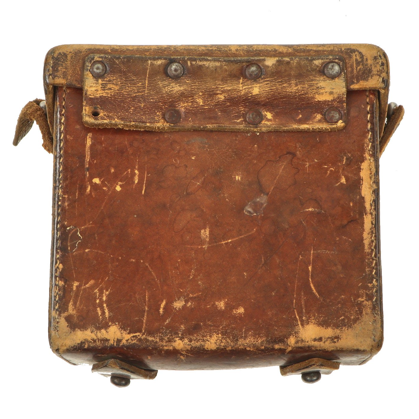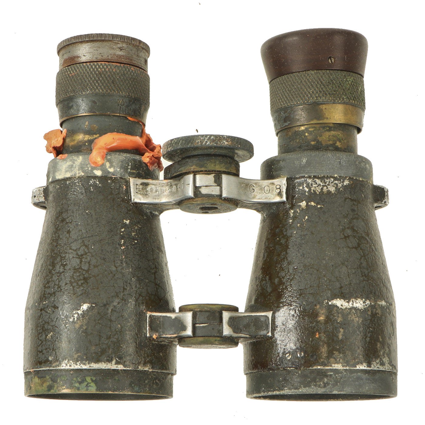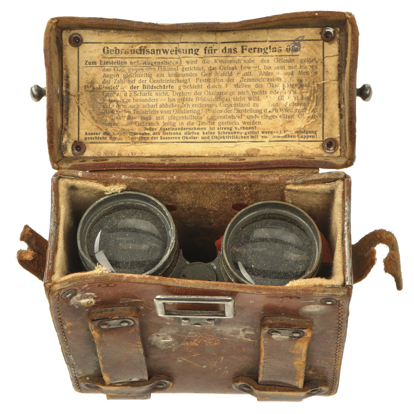 The included leather case is designed to strap to the waist belt and combat suspenders, and was made by SPINDLER & HOYER / ROTTINGEN. It still has the original Gebrauchsanweisung für das Fernglas 08 (Instructions for use for the binoculars 08) attached to the inside of the top cover. The leather is in good shape, though the top closure straps have degraded