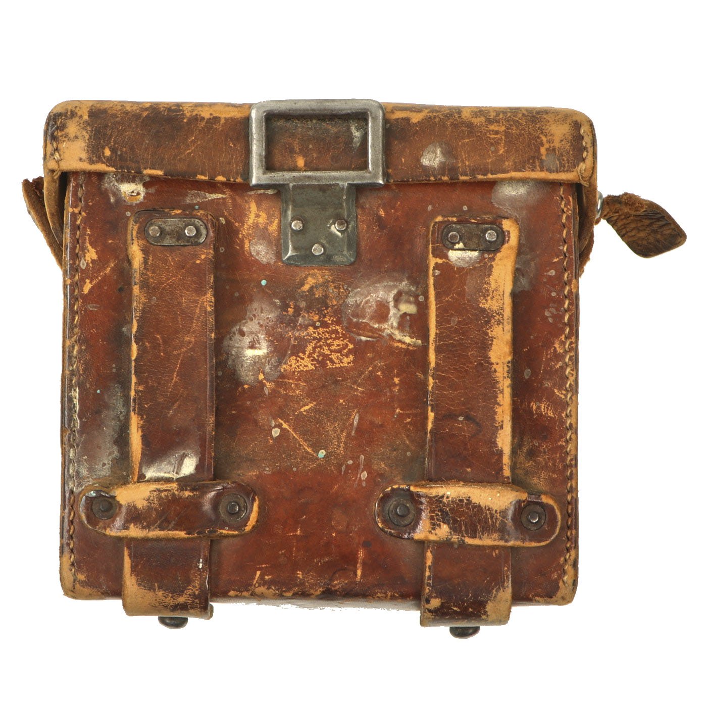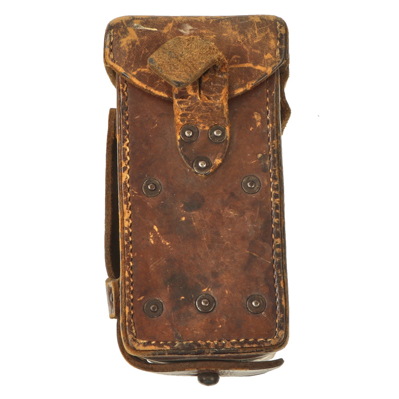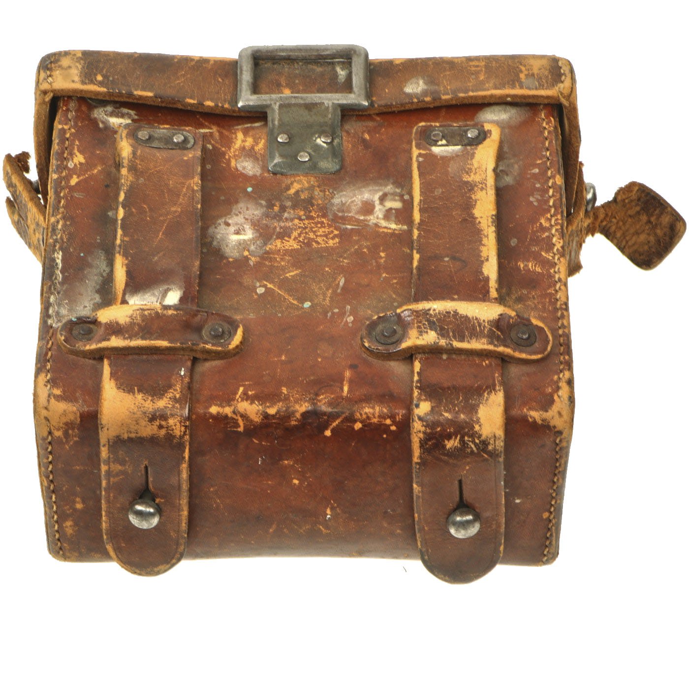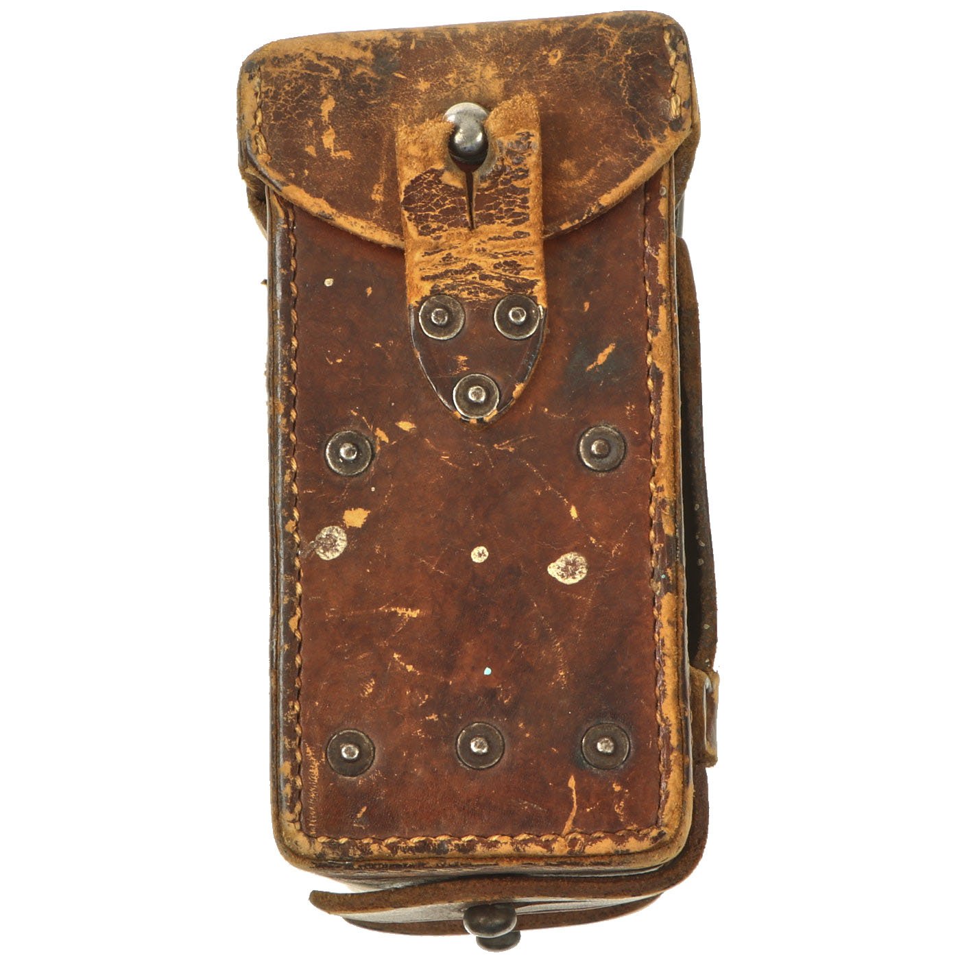 The included leather case is designed to strap to the waist belt and combat suspenders, and was made by SPINDLER & HOYER / ROTTINGEN. It still has the original Gebrauchsanweisung für das Fernglas 08 (Instructions for use for the binoculars 08) attached to the inside of the top cover. The leather is in good shape, though the top closure straps have degraded