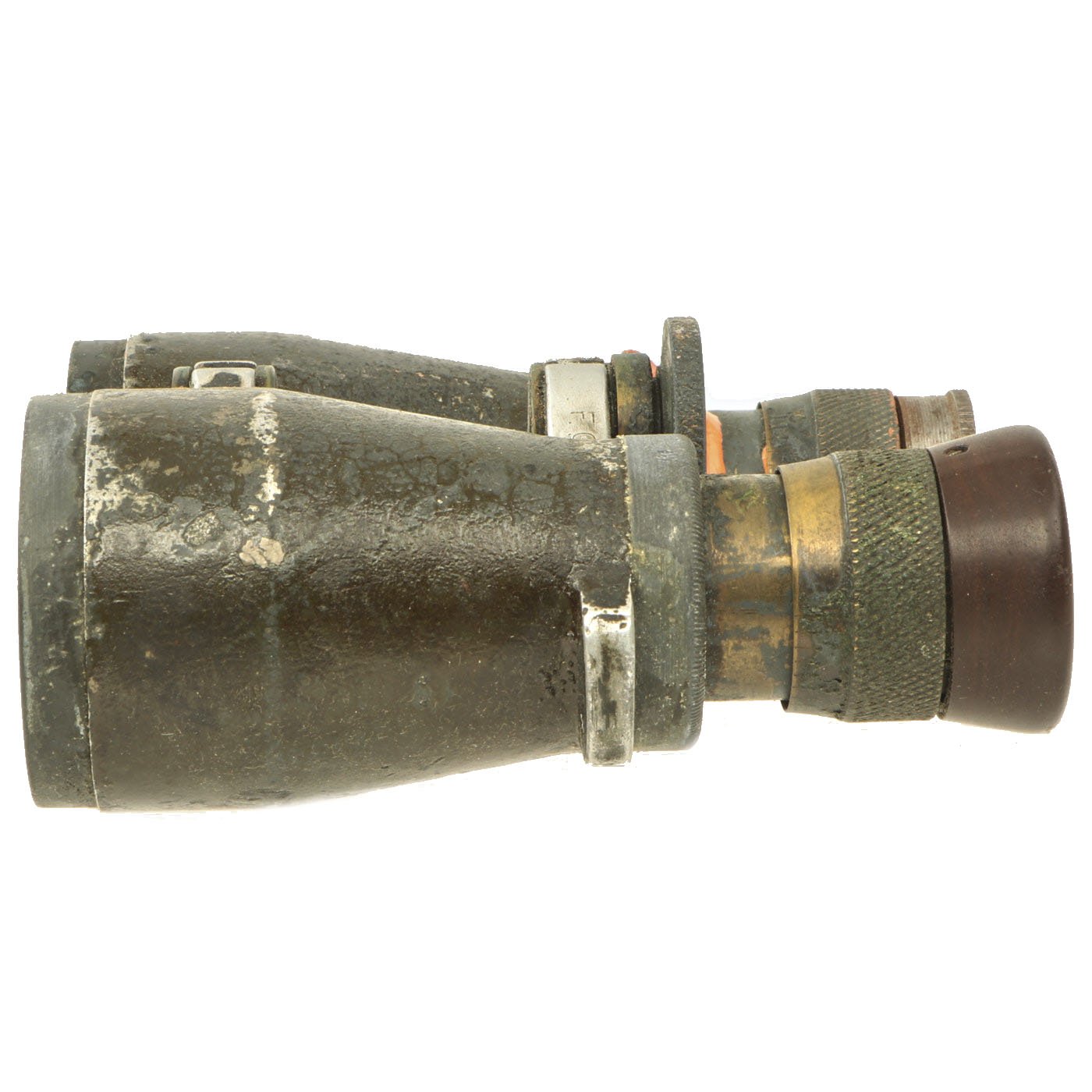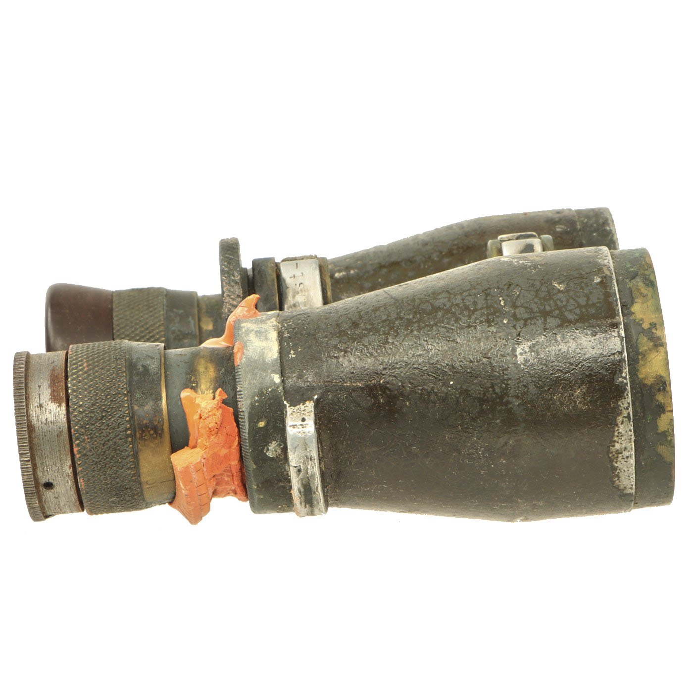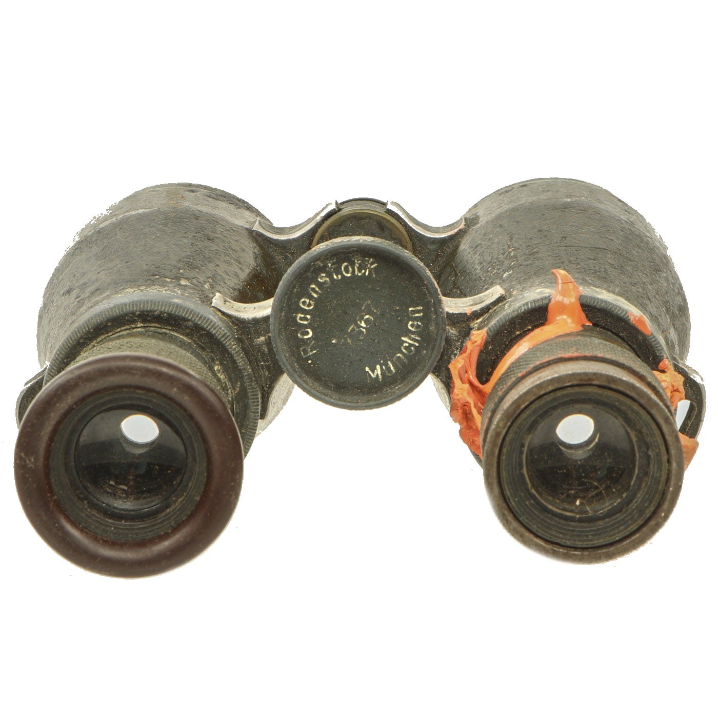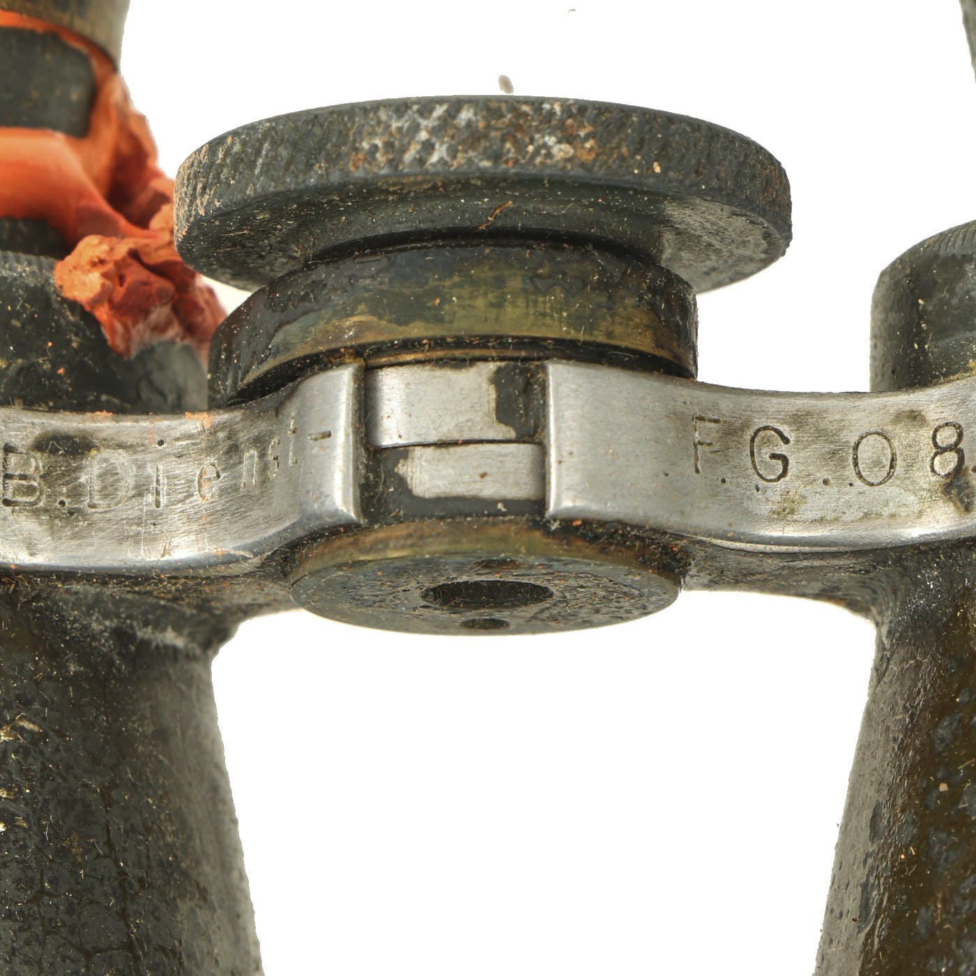 The adjacent hinge is marked with B. Dienst- F.G. 08, the abbreviated type and model number, which roughly means "Service Binoculars 08". Rodenstock of Munich is a rare and desirable maker of these binoculars. Condition definitely shows wear, and the diopter adjustments are not currently functional. One of the bakelite eyecups was replaced at some point with a rubber example, which over time degraded, melting onto the binoculars and case.