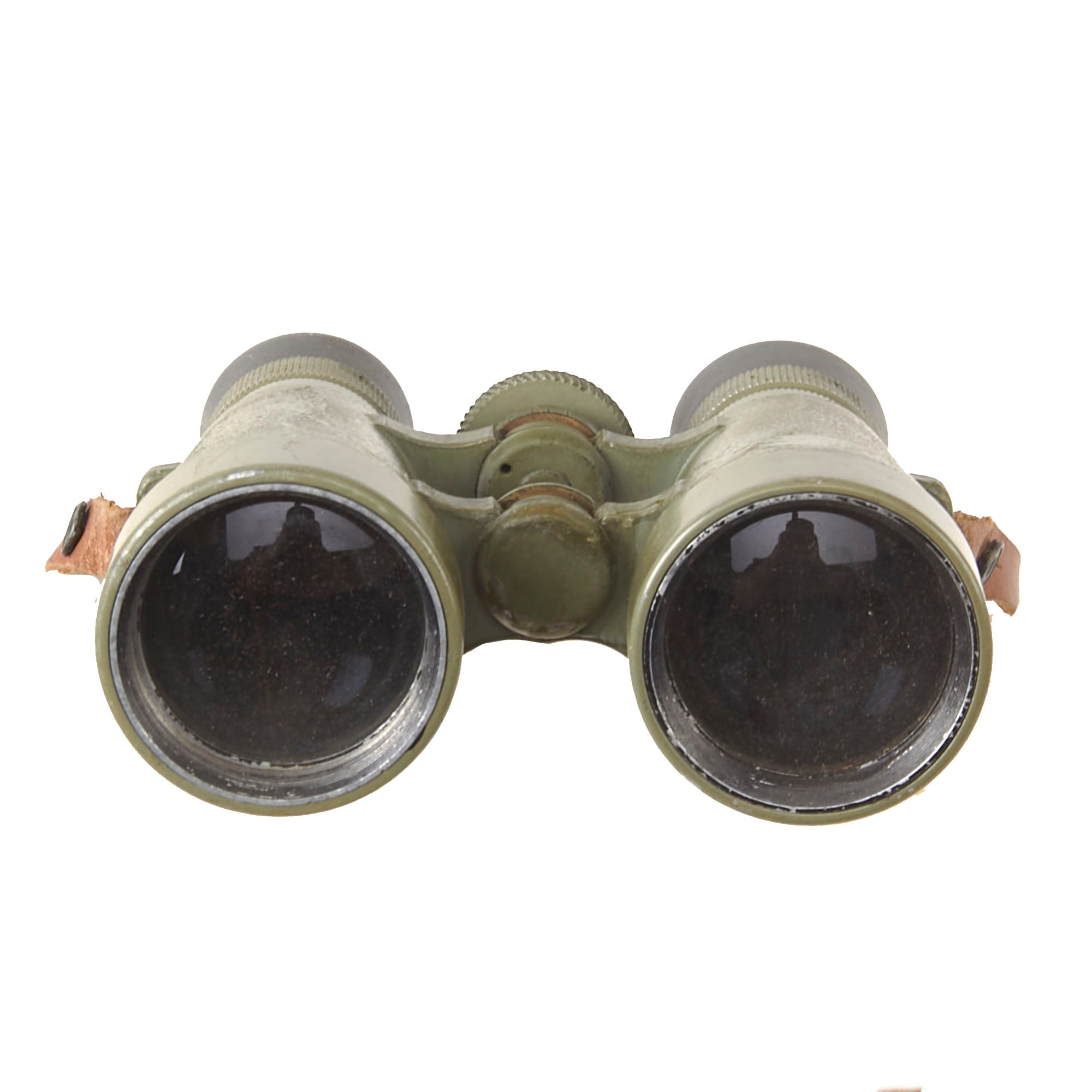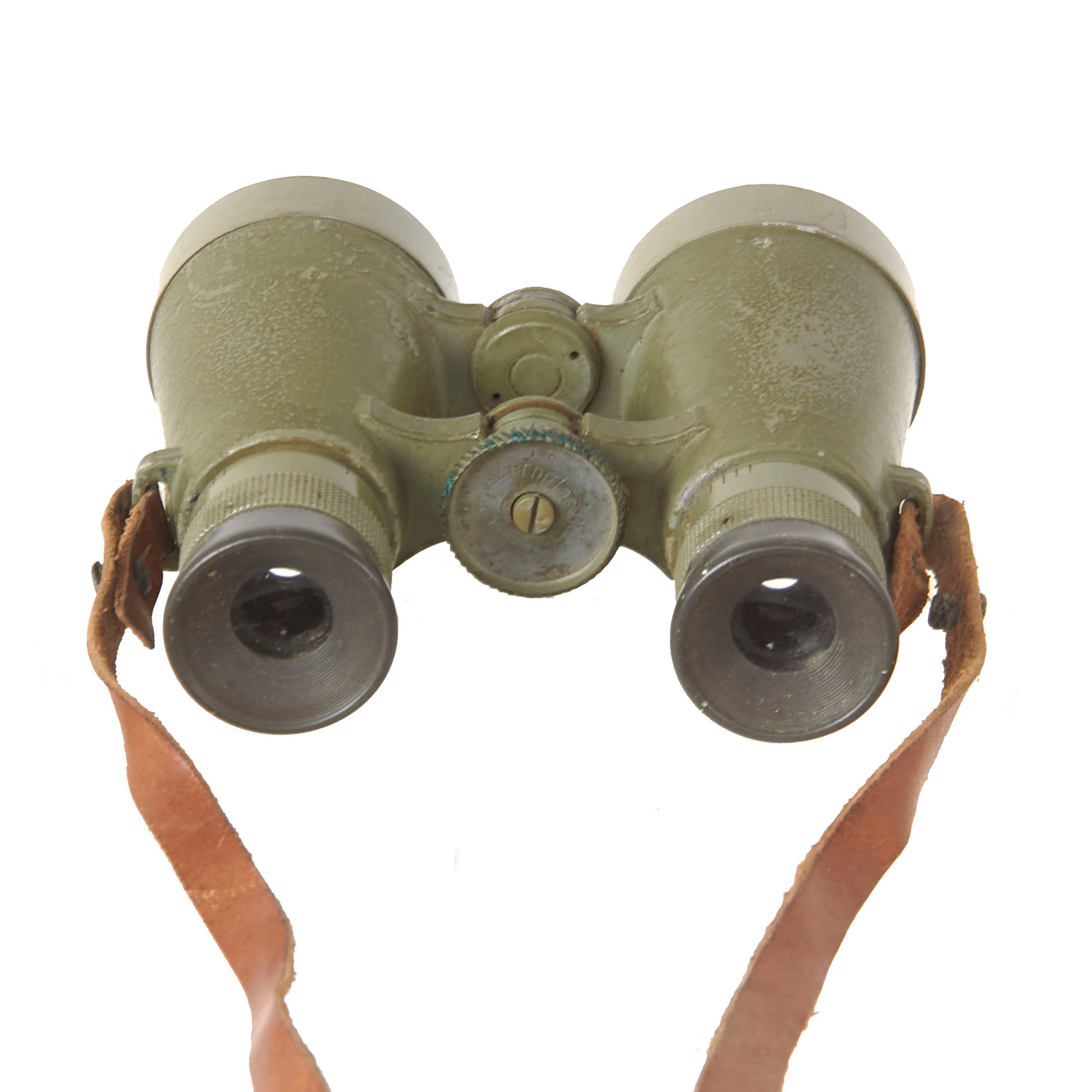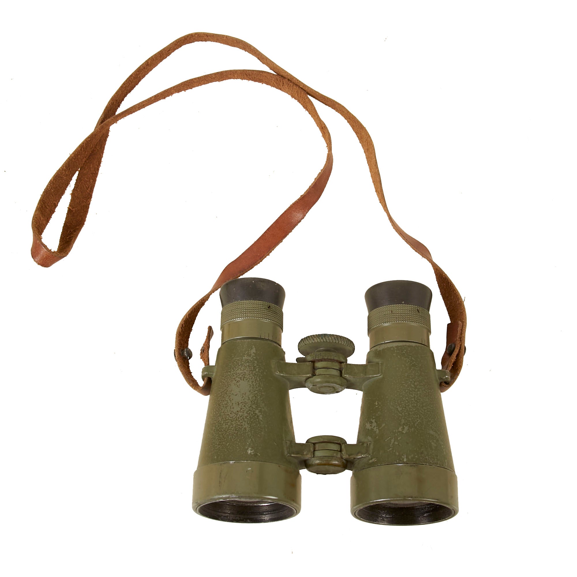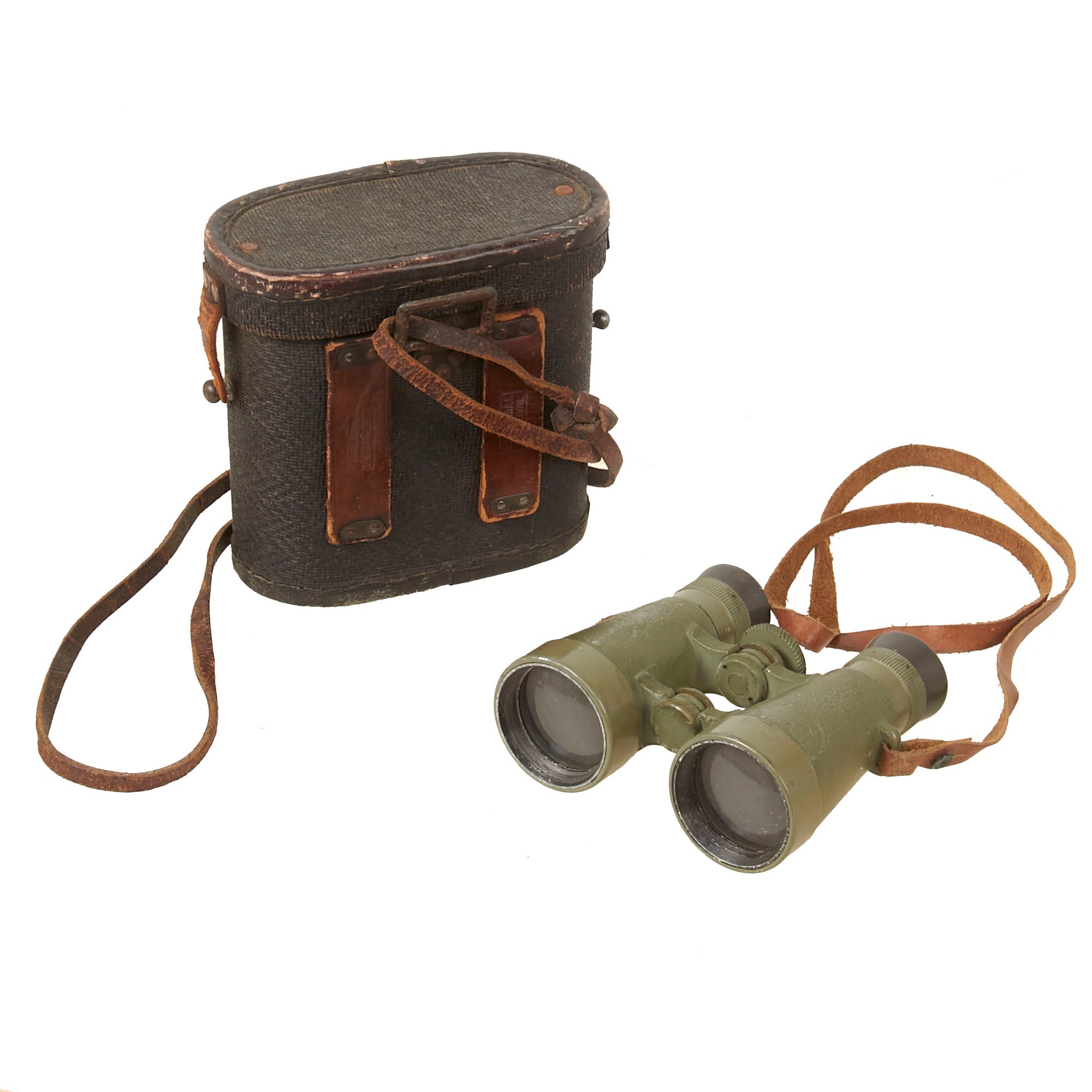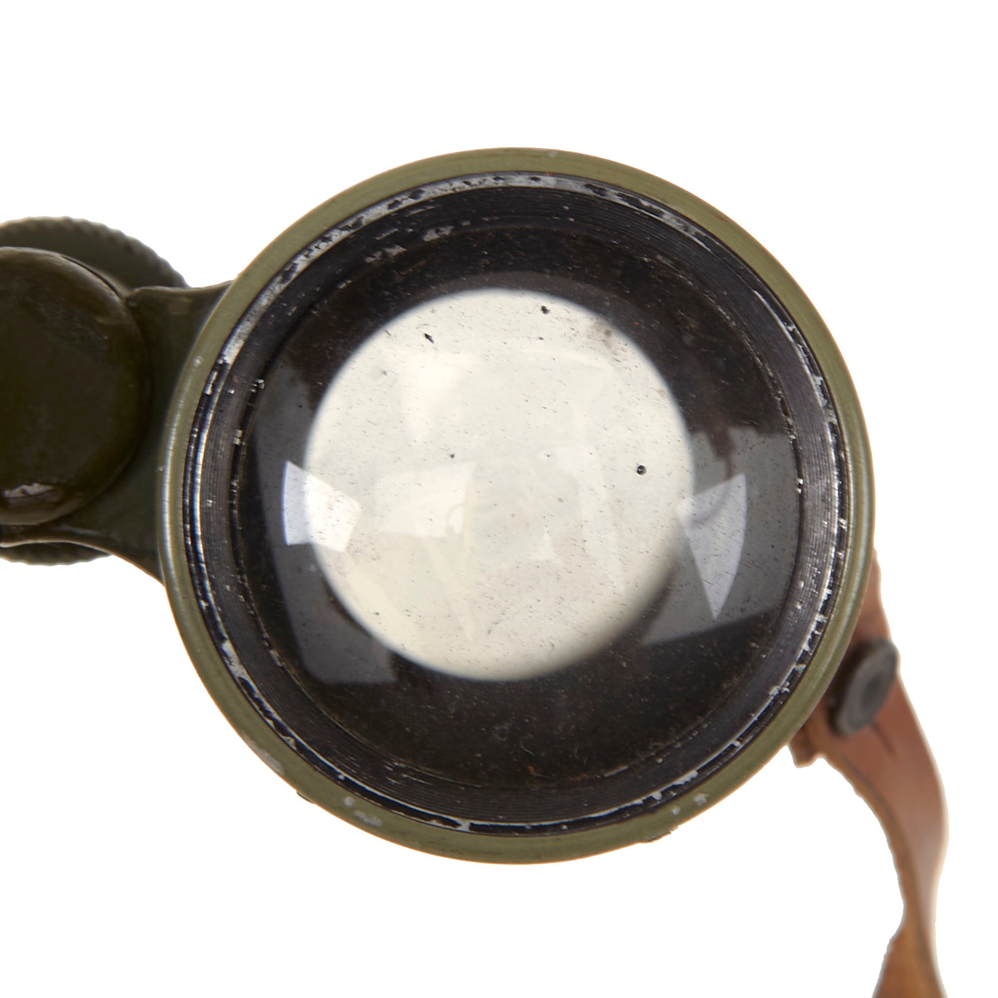 The optics are in excellent totally clear condition with working focus adjustments on both sides. The paint on the binoculars themselves is very well-retained without many issues to speak of. The case shows age and some dryness but overall in very good condition, but the retaining straps are gone, and there is an interesting leather strap attached as a makeshift carrying strap. It looks the period.