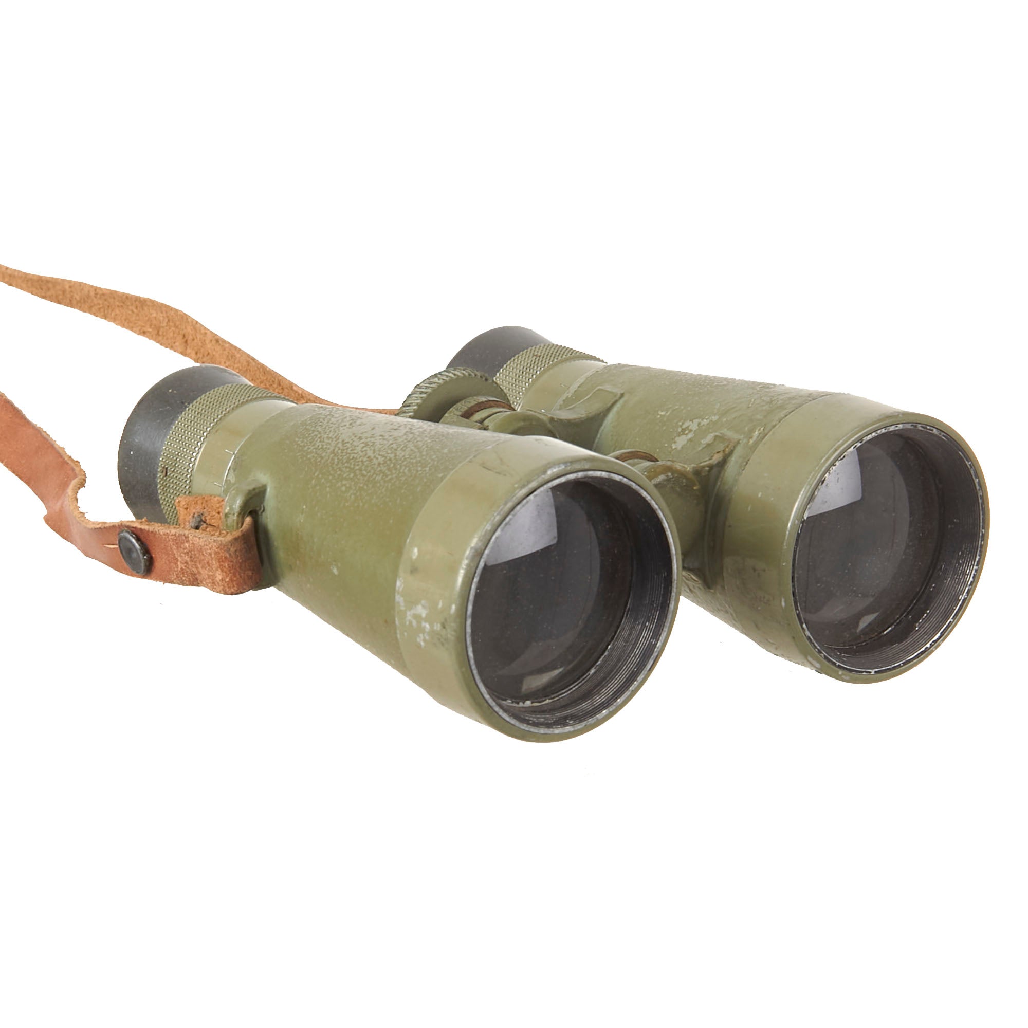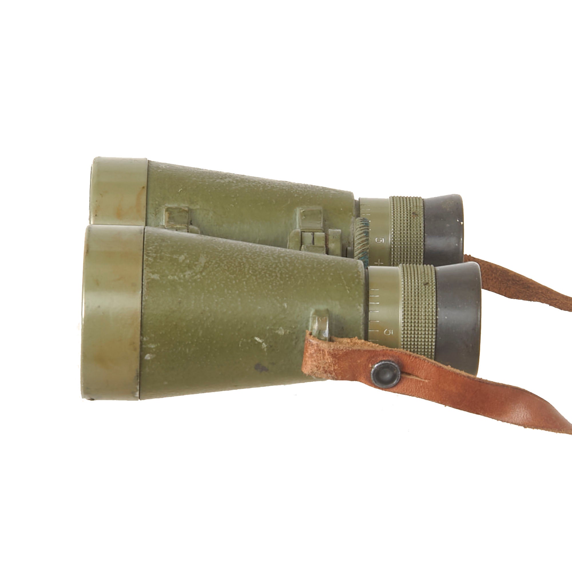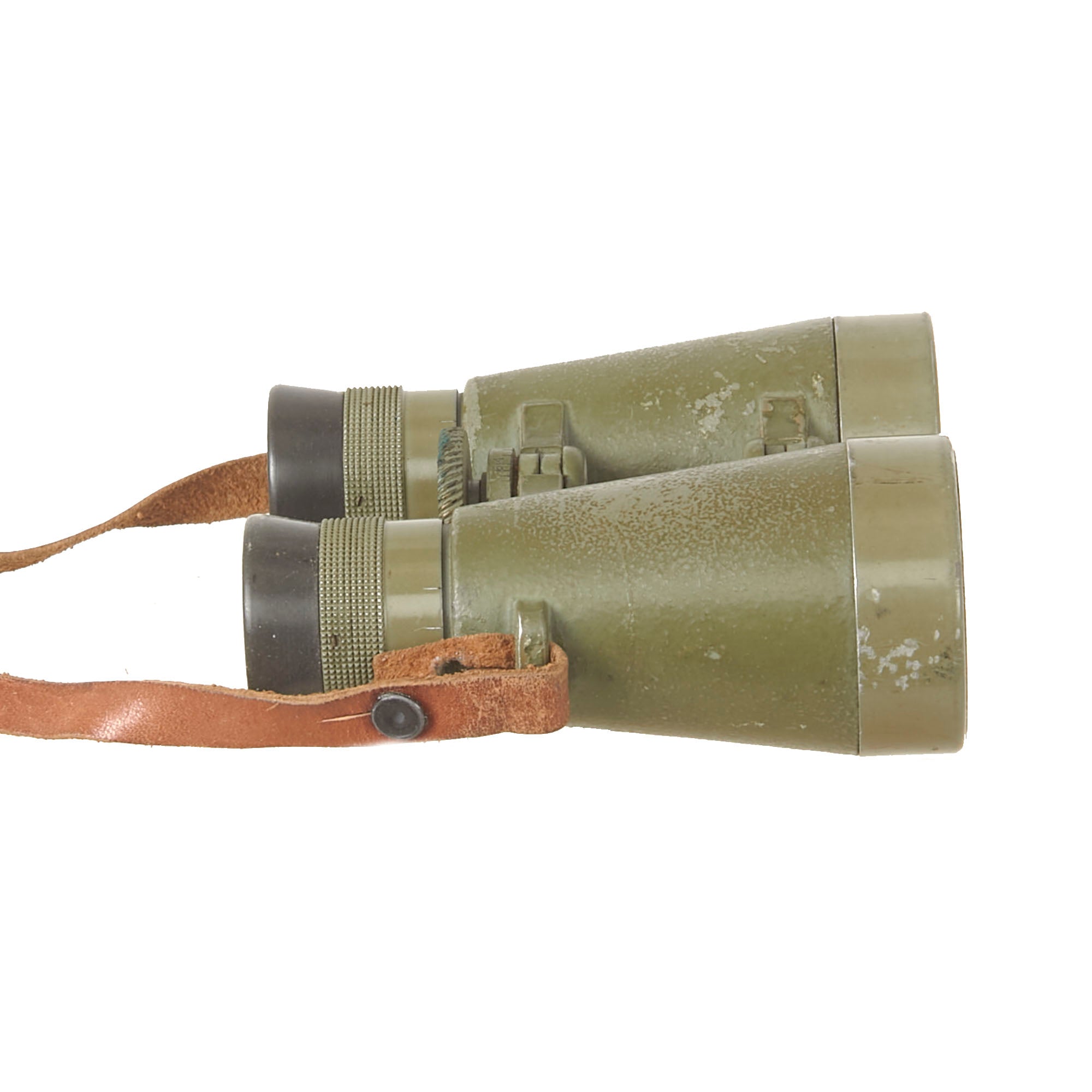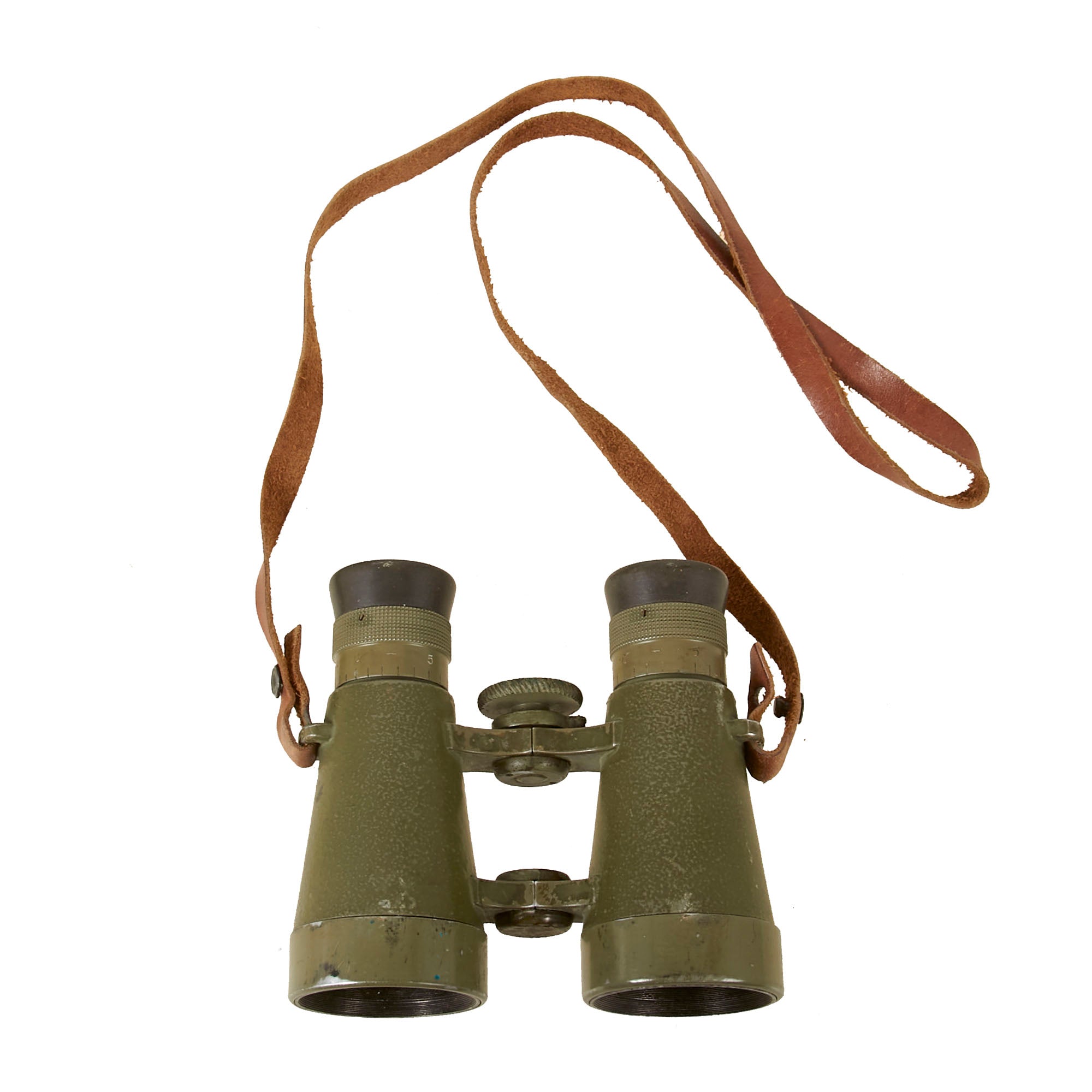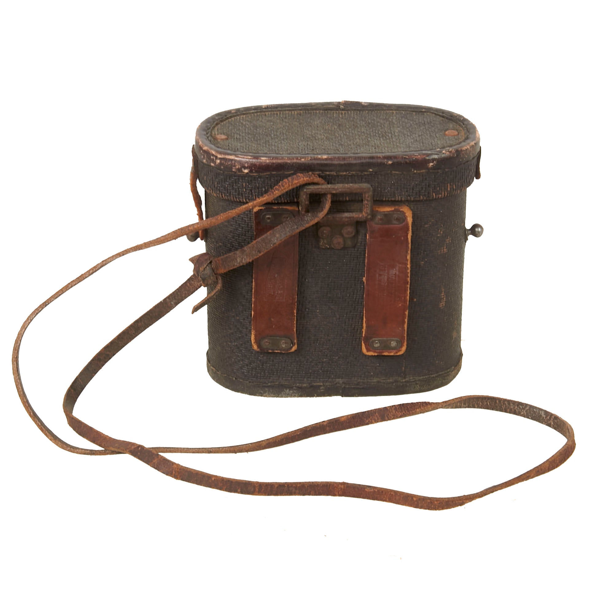 The optics are in excellent totally clear condition with working focus adjustments on both sides. The paint on the binoculars themselves is very well-retained without many issues to speak of. The case shows age and some dryness but overall in very good condition, but the retaining straps are gone, and there is an interesting leather strap attached as a makeshift carrying strap. It looks the period.