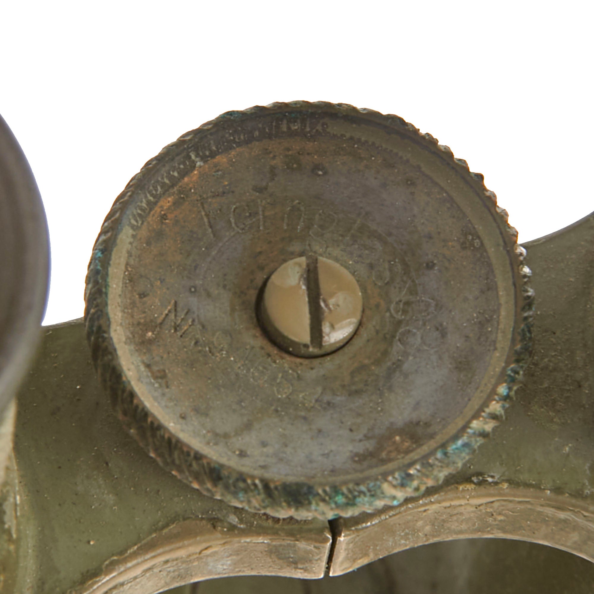Original Item: Only one available. This is a nice pair of German Fernglas 08 binoculars, nicely marked on the carrying case belt loops by Emil Busch A.G. They are marked with serial number Nr 94634 on the hinge tension nut along with Fernglas 08. These field glasses come complete with the Ersatz carrying case.
