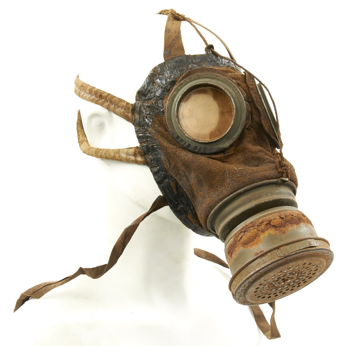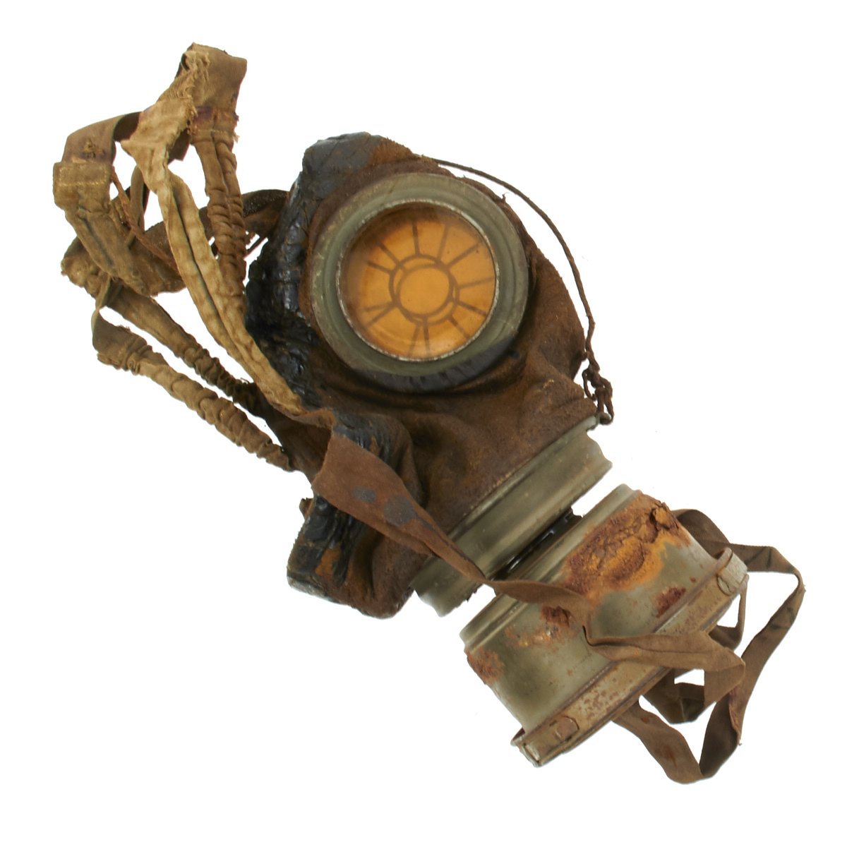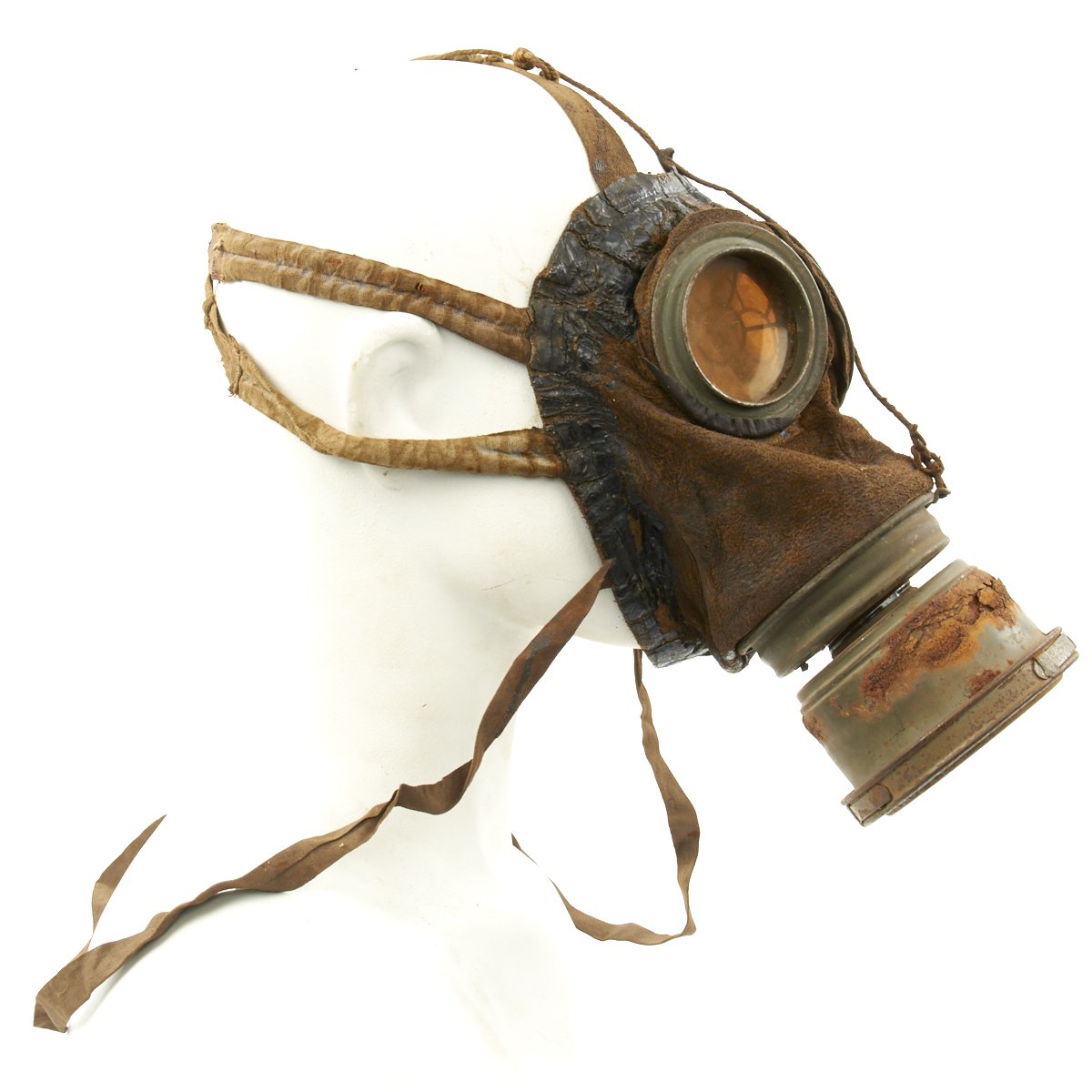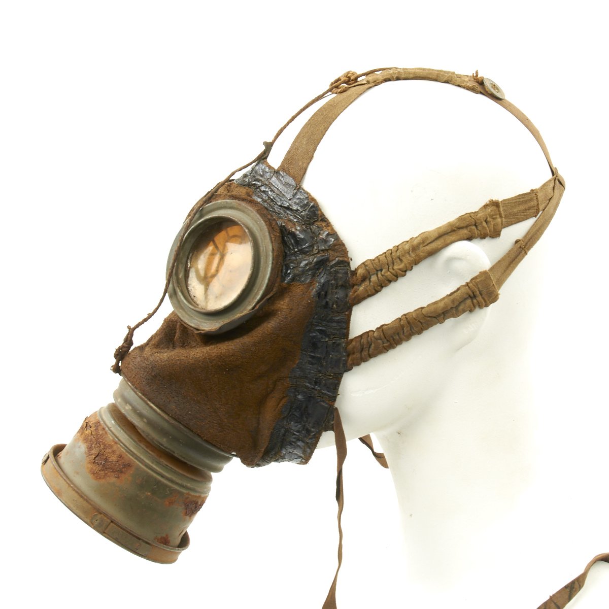 Original Item: Only One Available. This is a good condition totally genuine WWI issue German gas mask. The mask is leather construction (still soft) with canvas straps. Original tinted lenses with metal eye guards still intact. The filer shows areas of rust but is nicely marked and ink stamped with WWI Date along with manufacture stamps and inspector markings. The carry can is in very good condition with much original paint remaining. Overall a nice condition gas mask that is already more than 100 years of age!