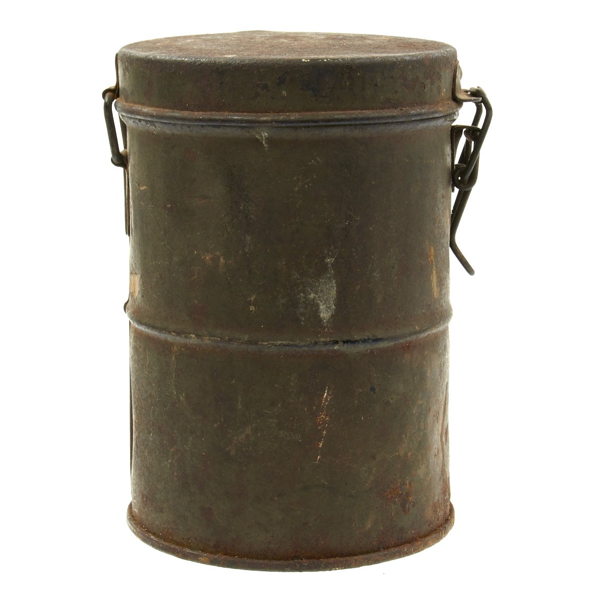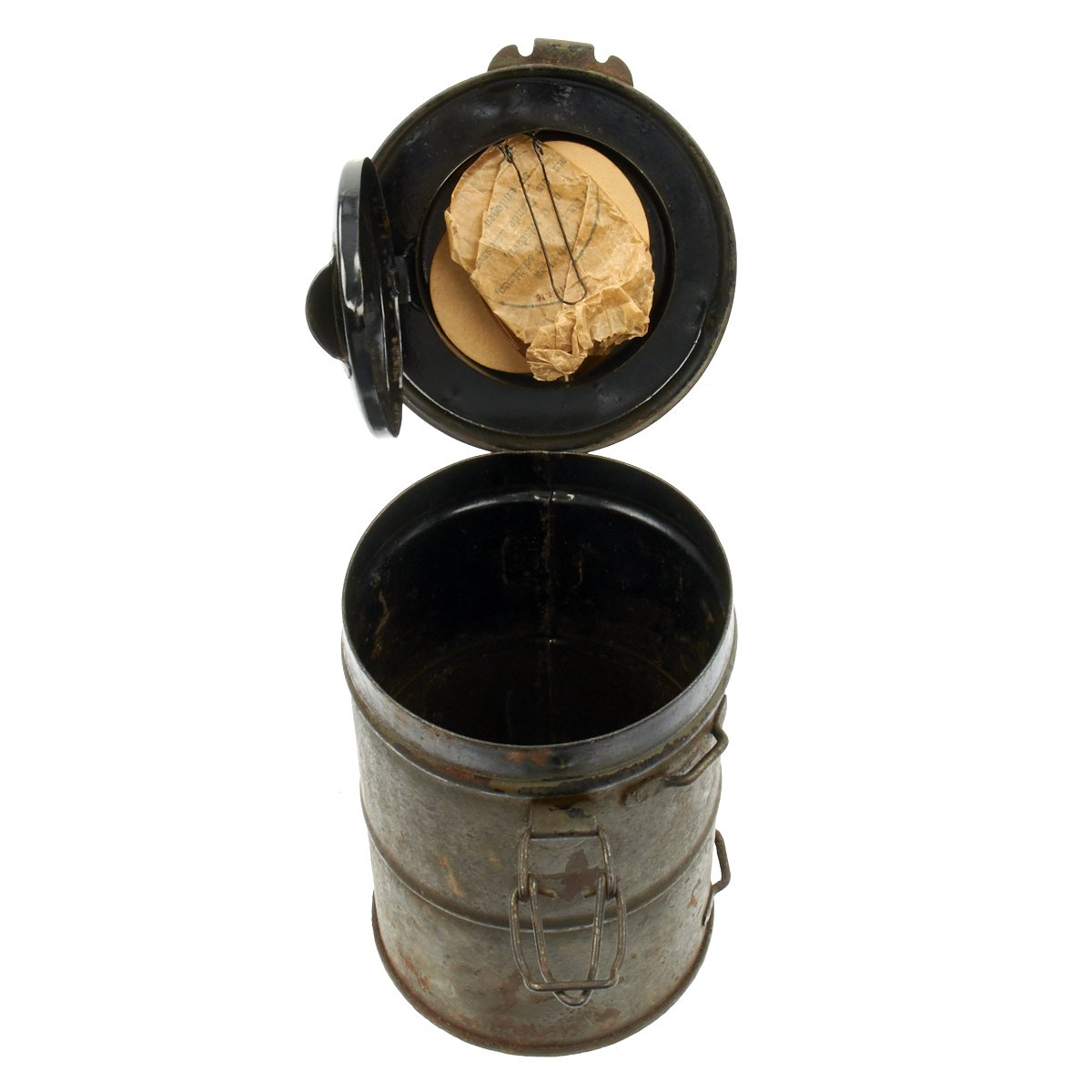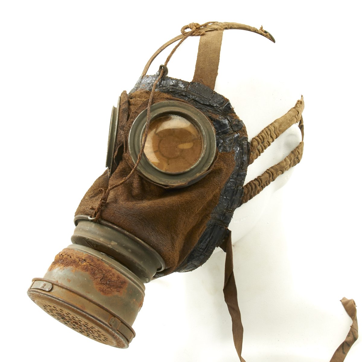 Original Item: Only One Available. This is a good condition totally genuine WWI issue German gas mask. The mask is leather construction (still soft) with canvas straps. Original tinted lenses with metal eye guards still intact. The filer shows areas of rust but is nicely marked and ink stamped with WWI Date along with manufacture stamps and inspector markings. The carry can is in very good condition with much original paint remaining. Overall a nice condition gas mask that is already more than 100 years of age!