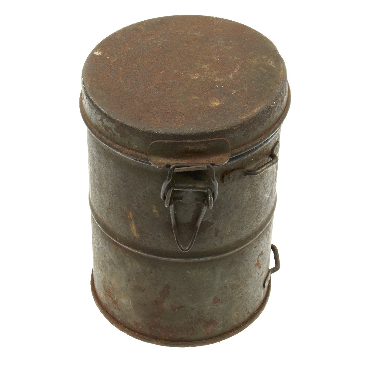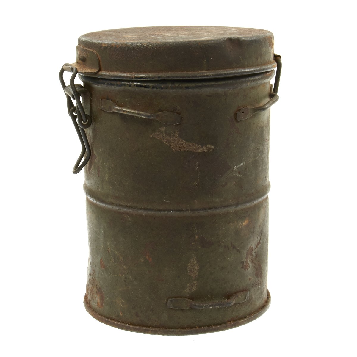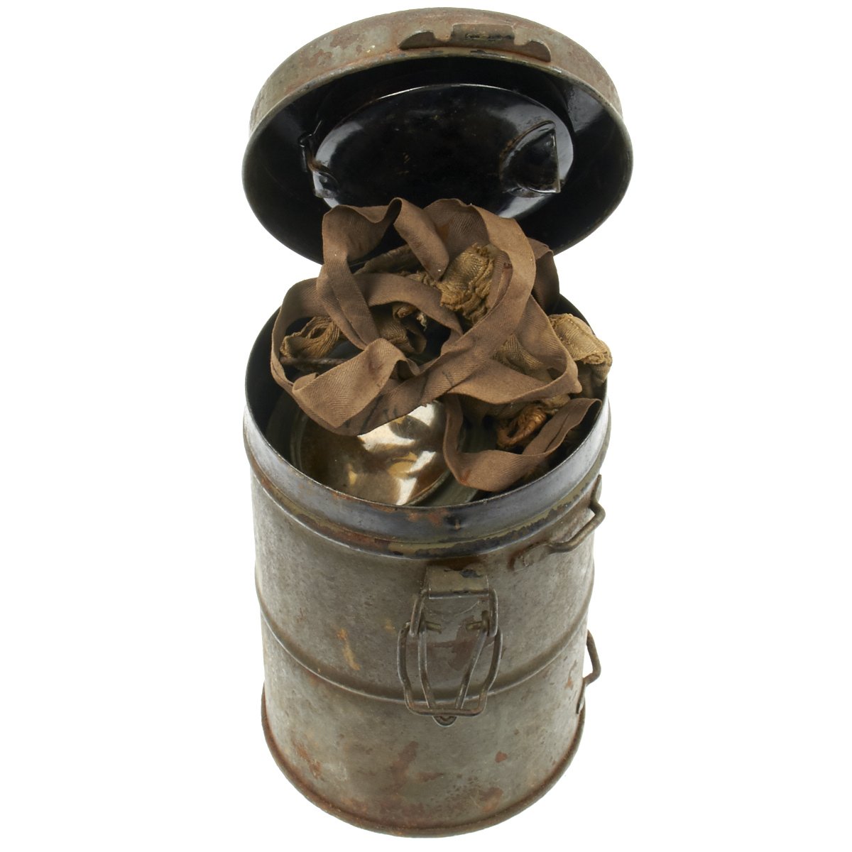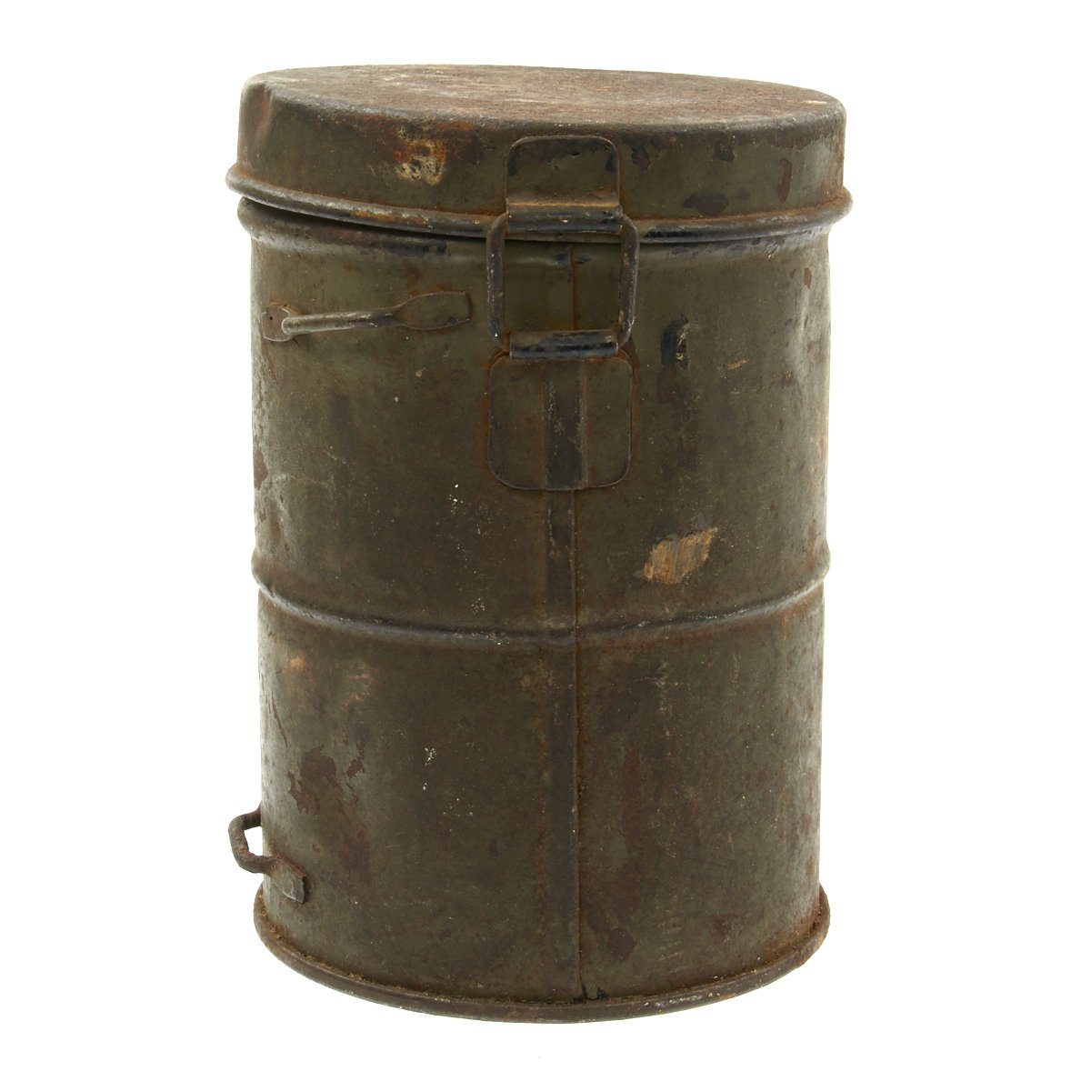 Original Item: Only One Available. This is a good condition totally genuine WWI issue German gas mask. The mask is leather construction (still soft) with canvas straps. Original tinted lenses with metal eye guards still intact. The filer shows areas of rust but is nicely marked and ink stamped with WWI Date along with manufacture stamps and inspector markings. The carry can is in very good condition with much original paint remaining. Overall a nice condition gas mask that is already more than 100 years of age!