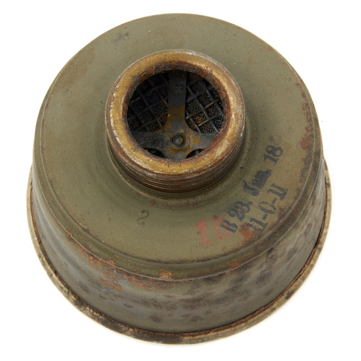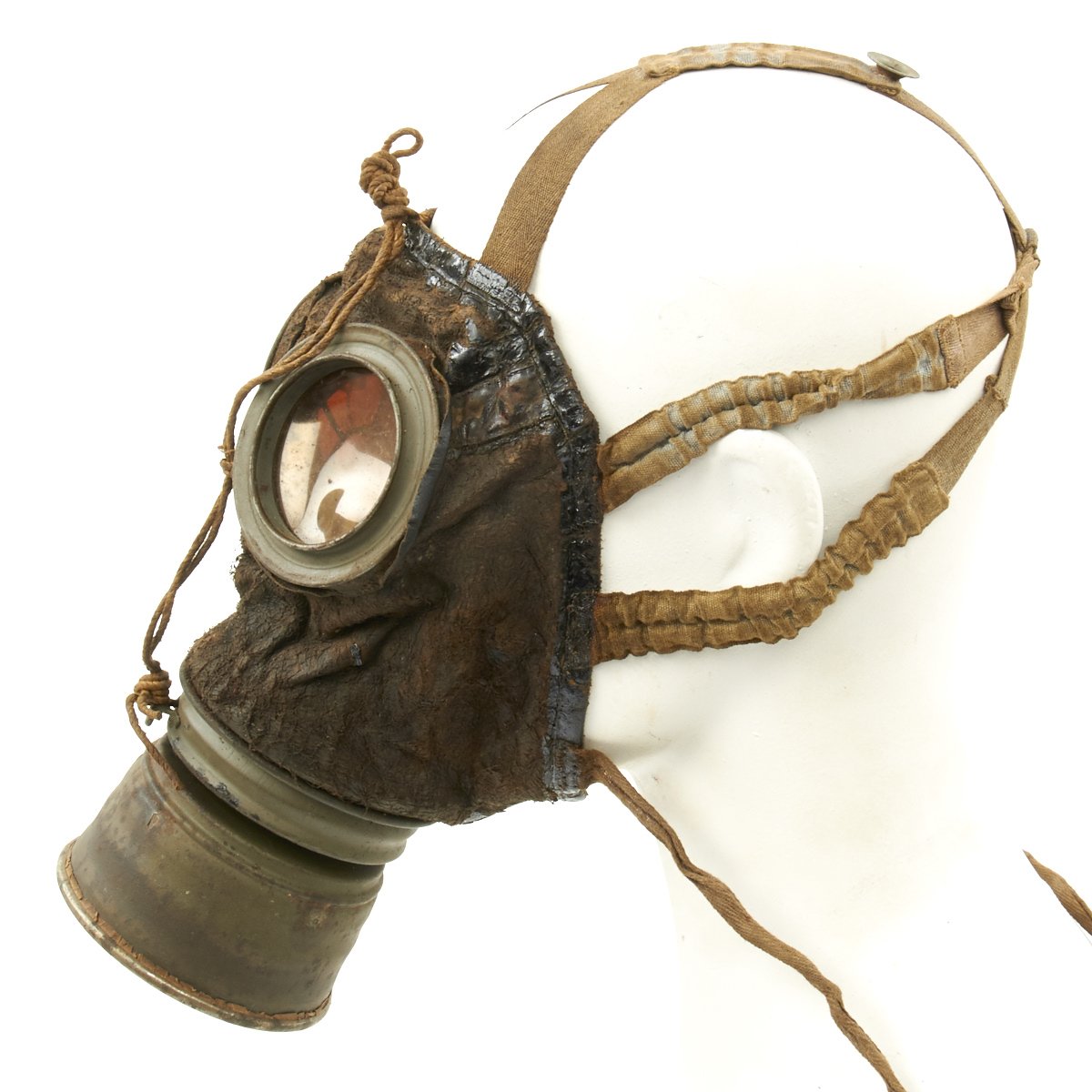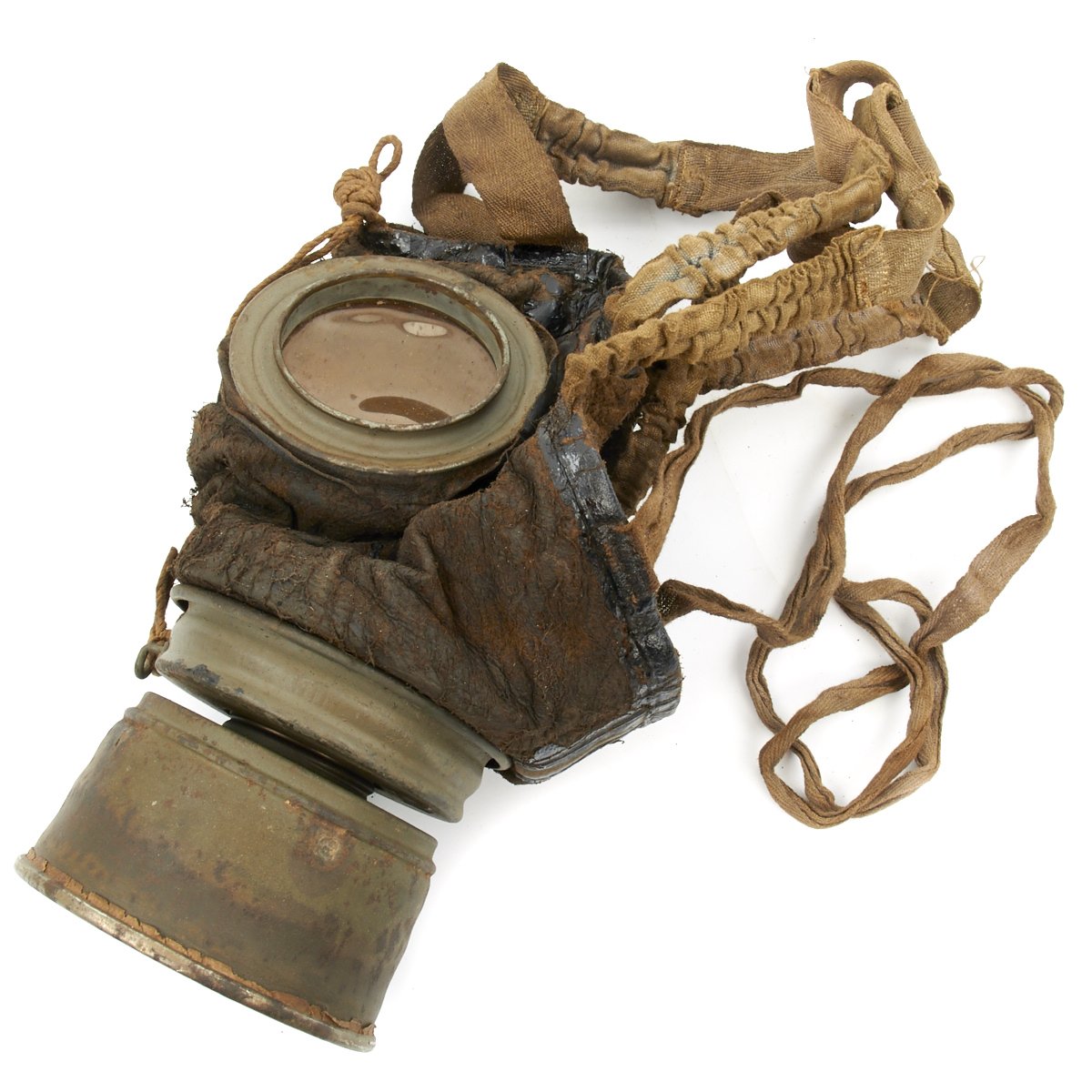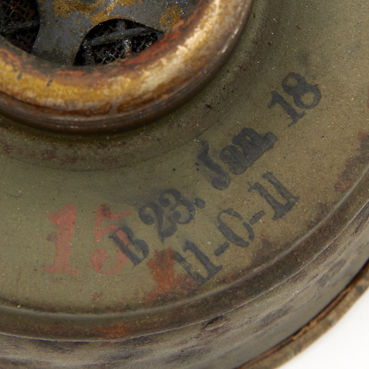 Original Item: Only One Available. This is an excellent condition totally genuine World War One issue German gas mask. The mask is constructed of leather (still soft) with canvas straps. Original tinted lenses with a set of spare lenses in the carry canister. Metal eye guards still intact and complete. The filer is nicely marked and ink stamped with date 23.Jan.18 along with manufacture stamps and inspector markings. The carry can is in very good condition with much original paint remaining. Included inside the spare lens compartment in the carry canister is a set of new old stock orange lenses complete in their original wax paper bag. Overall a wonderful condition gas mask that is more than 100 years of age!