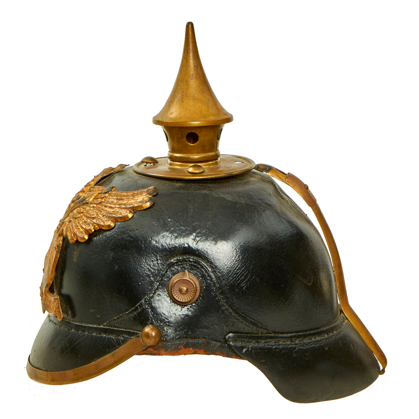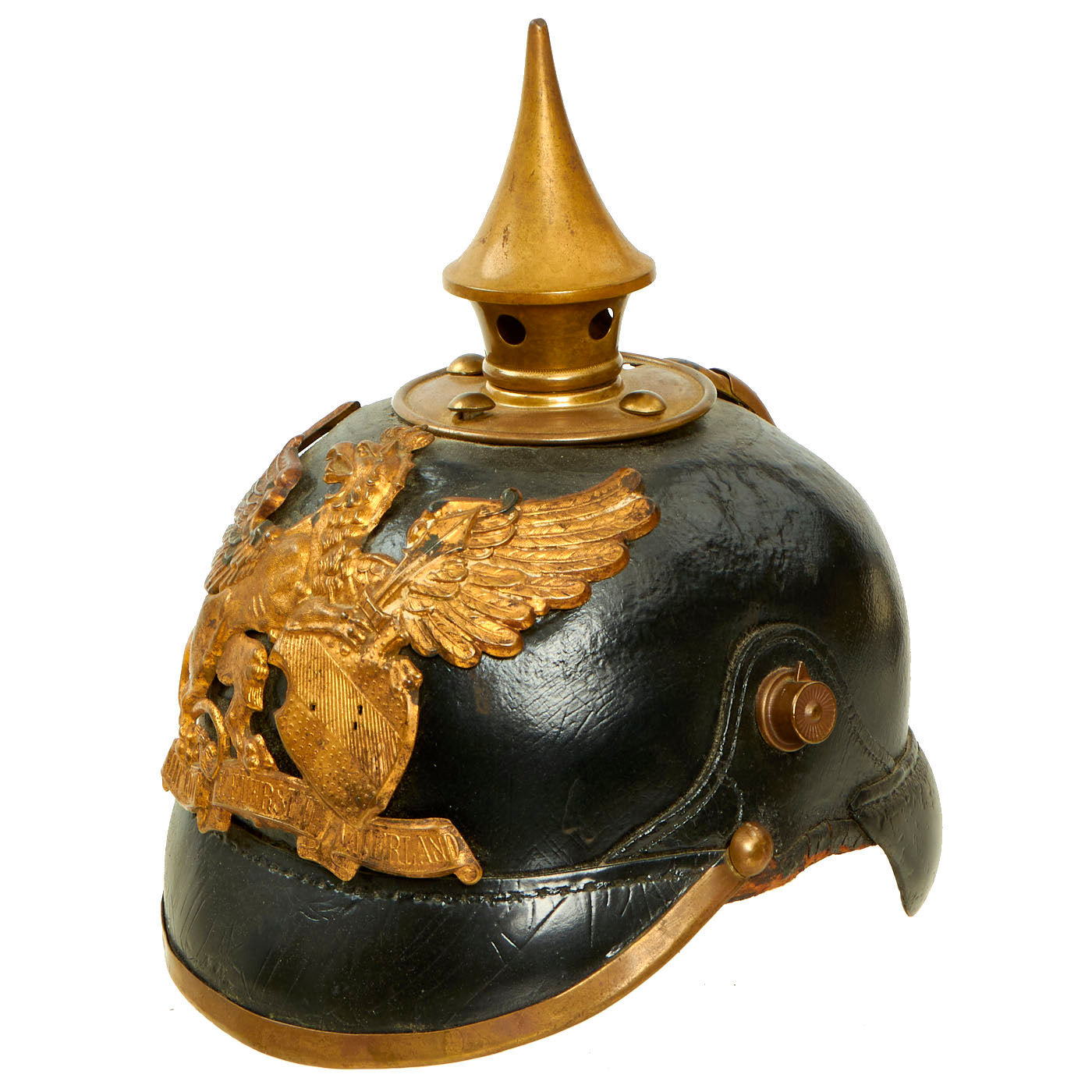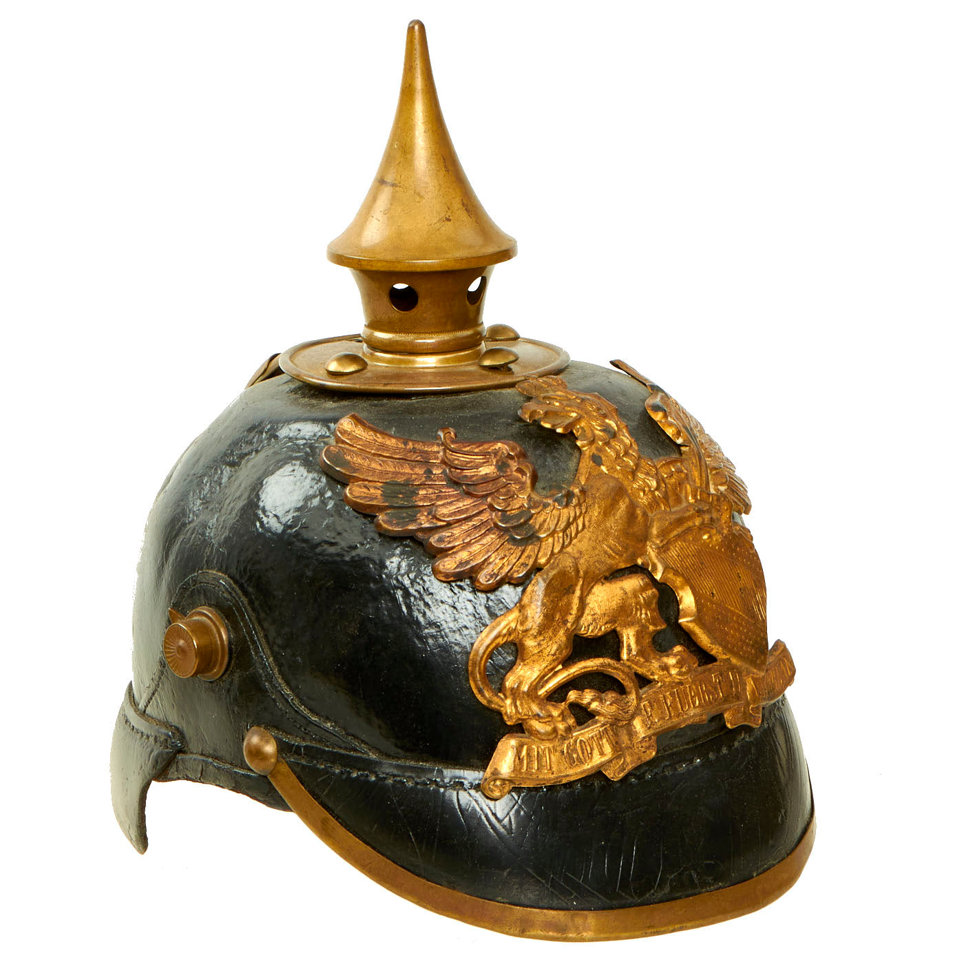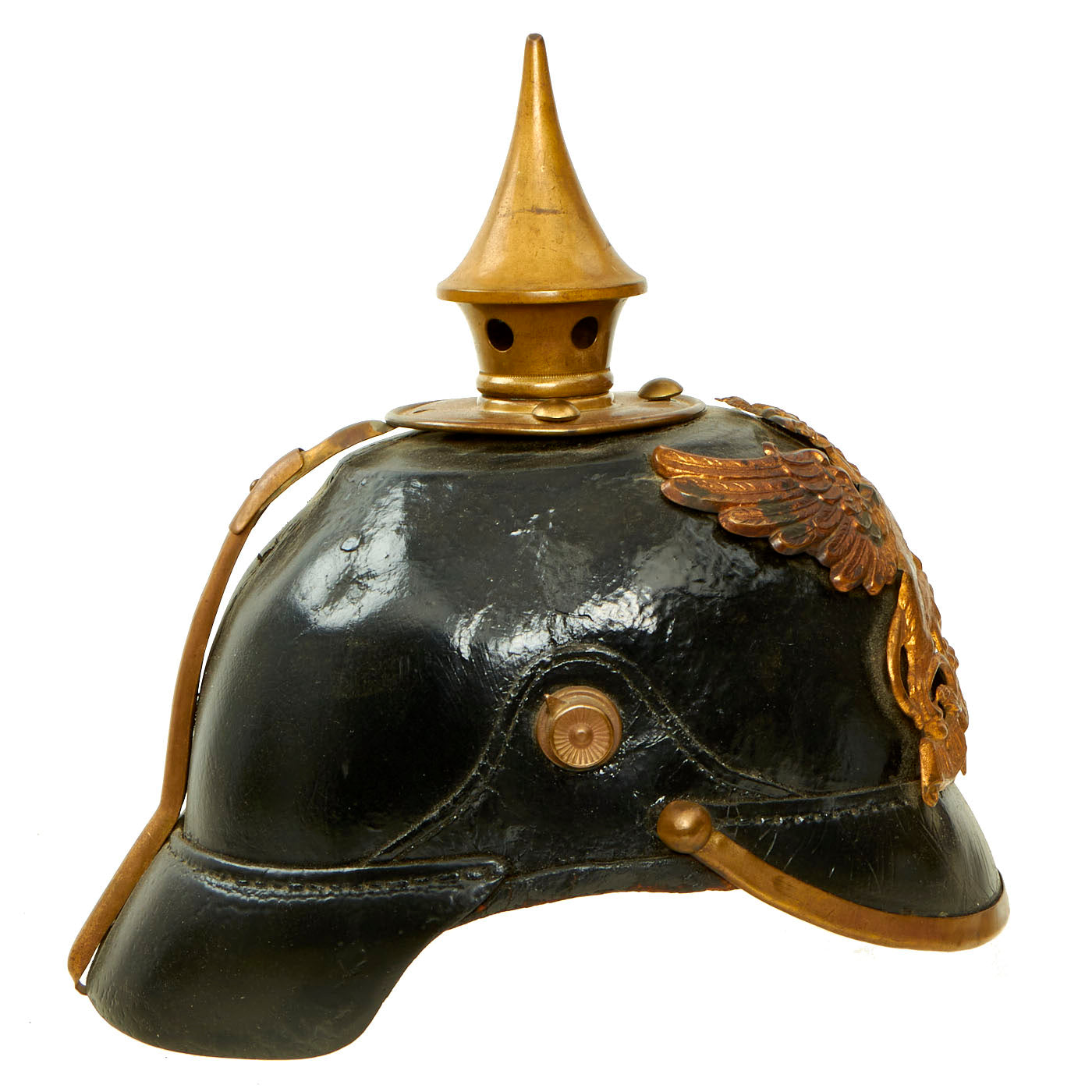 Original Item: Only One Available. This is nice Infantry Regiment enlisted man's Mannschaften (other ranks) pickelhaube. The M1895 was the final pre-1914 evolution in a long series of spiked helmets. It displays lovely condition brass Prussian spread eagle helmet plate and comes complete with relic original leather liner. The spike on top denotes infantry issue and retains the correct brass chinstrap lugs.
