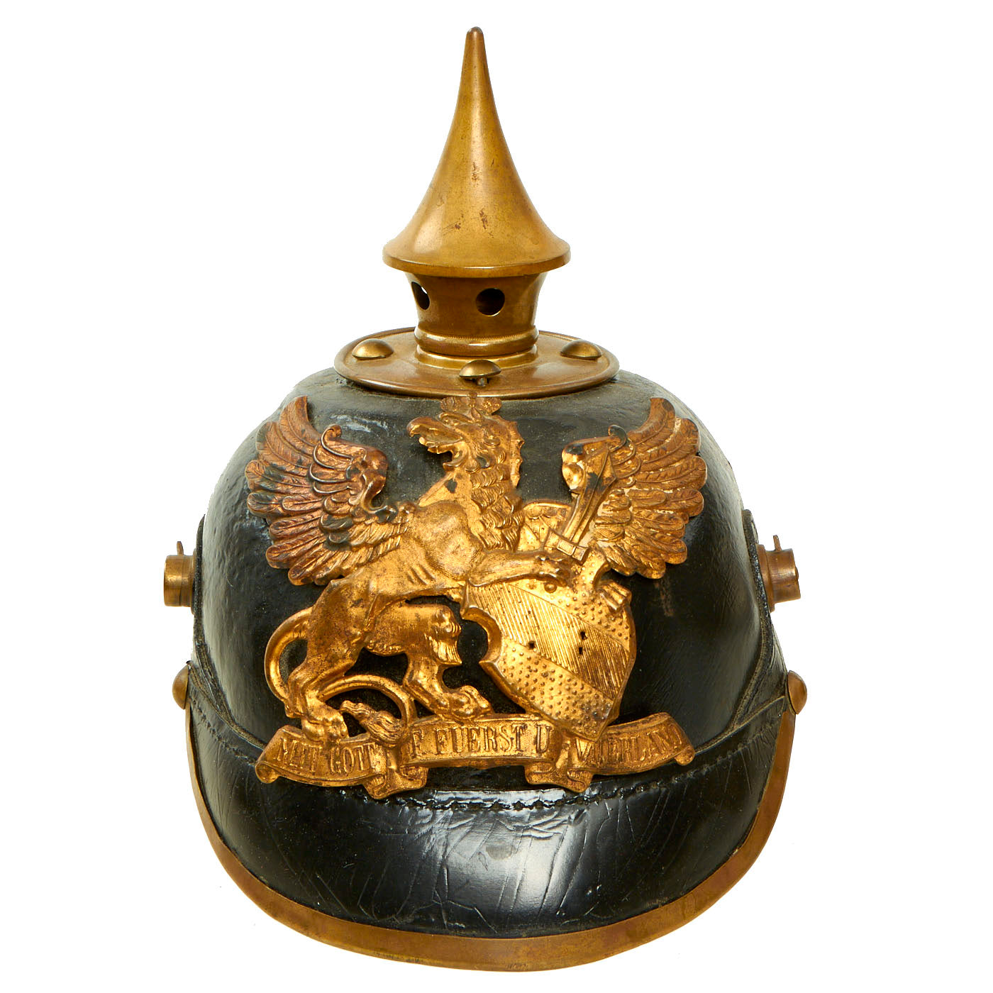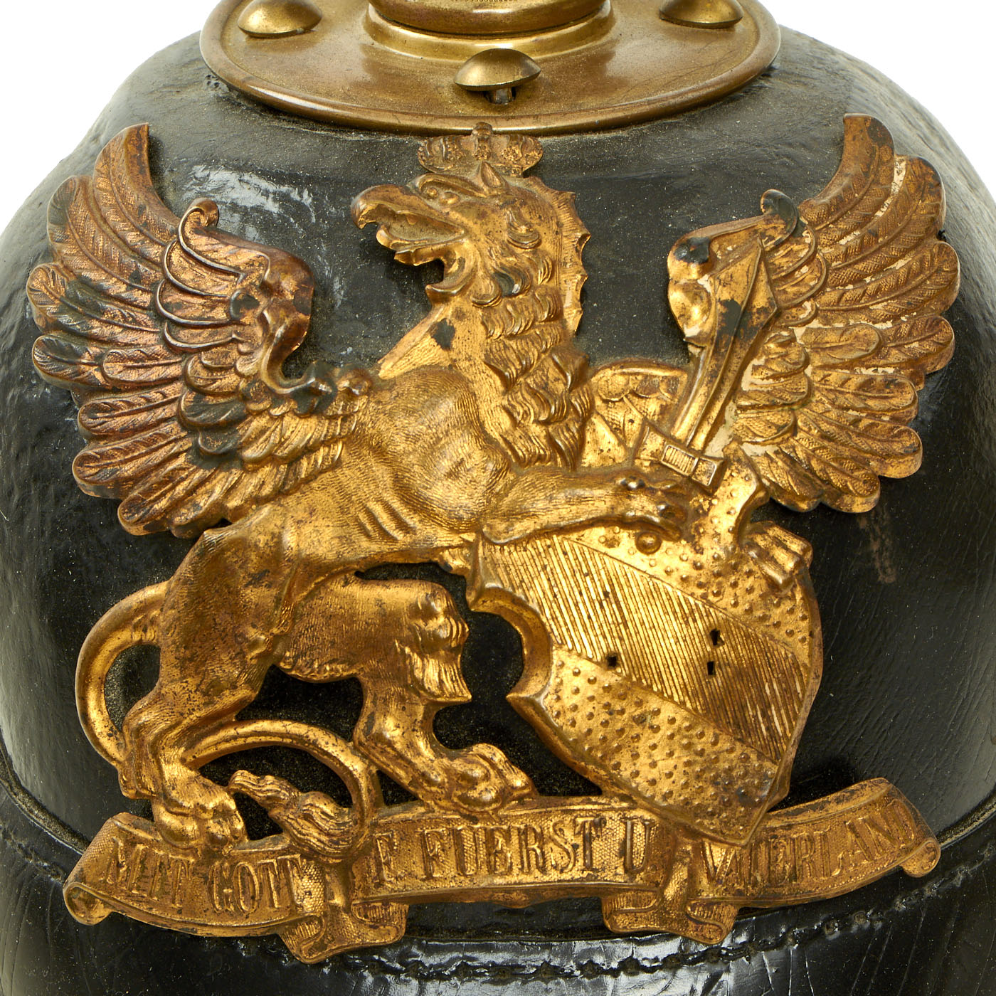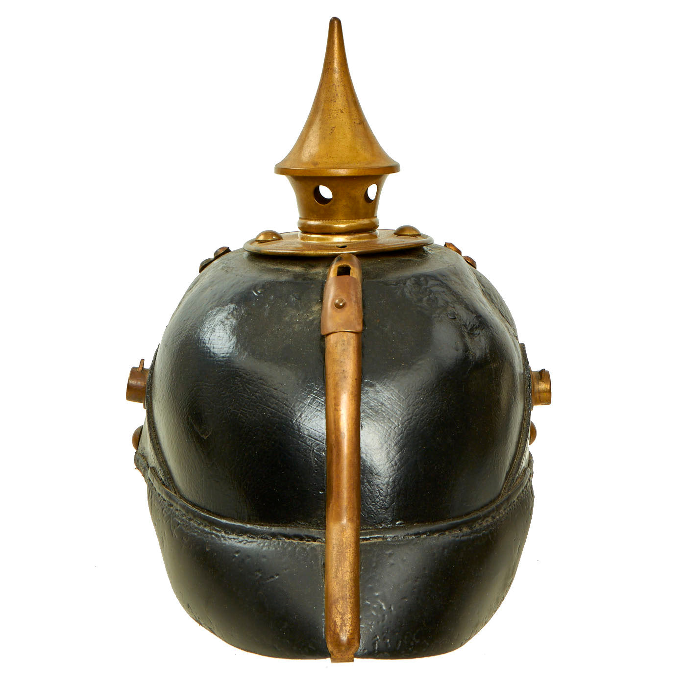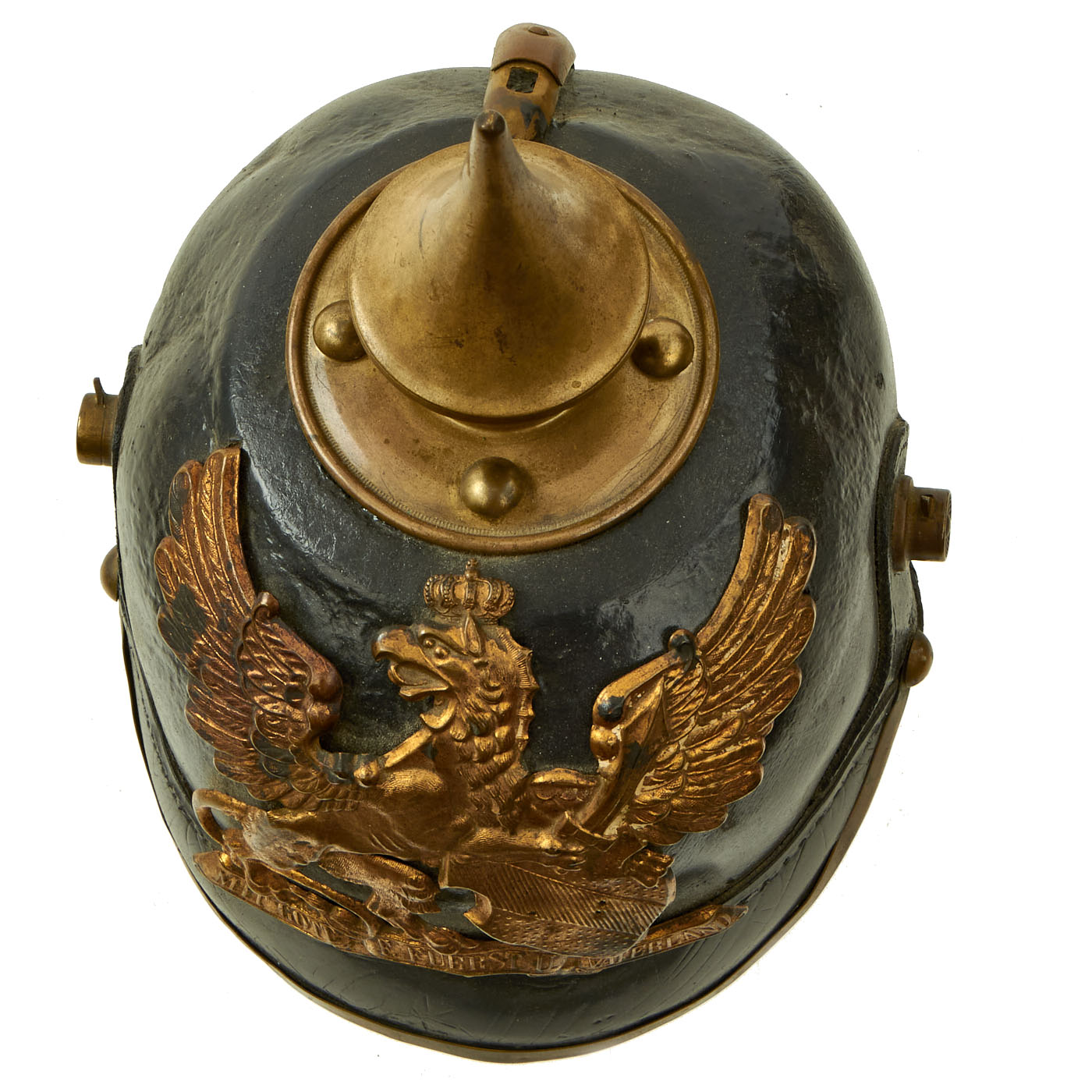 Original Item: Only One Available. This is nice Infantry Regiment enlisted man's Mannschaften (other ranks) pickelhaube. The M1895 was the final pre-1914 evolution in a long series of spiked helmets. It displays lovely condition brass Prussian spread eagle helmet plate and comes complete with relic original leather liner. The spike on top denotes infantry issue and retains the correct brass chinstrap lugs.