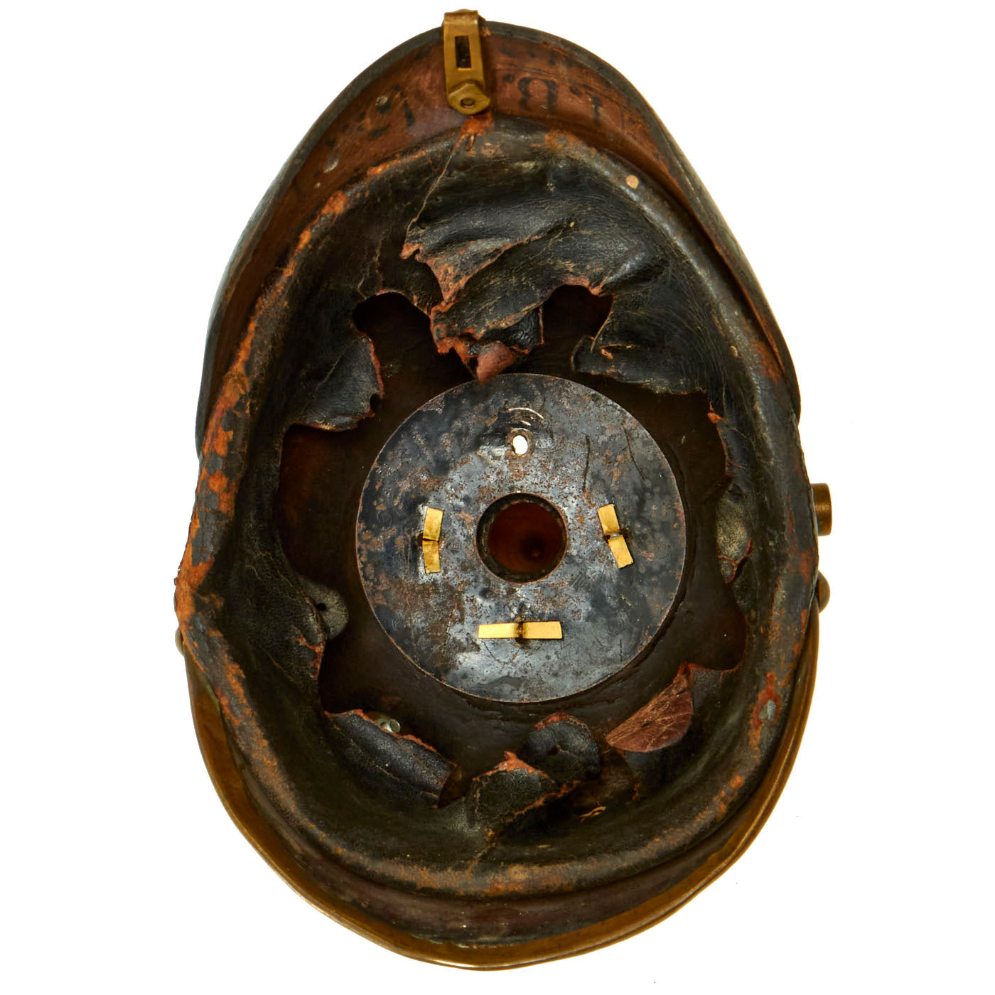 The crown of this leather helmet displays a brass vented enlisted spike mount on a brass baseplate but is missing the retaining pin at the top. The spike is in excellent condition, and as per the pattern, is fixed and does not rotate. The chin strap is missing, so unfortunately both the Prussian State cockade and National Colors cockade are missing as well.
