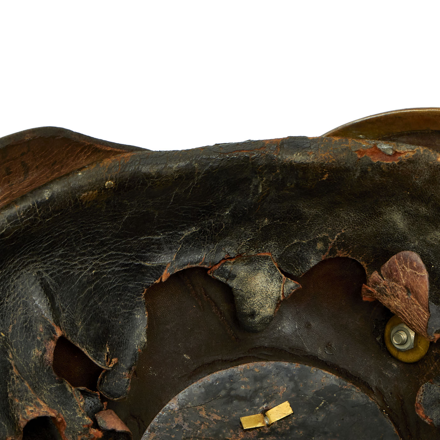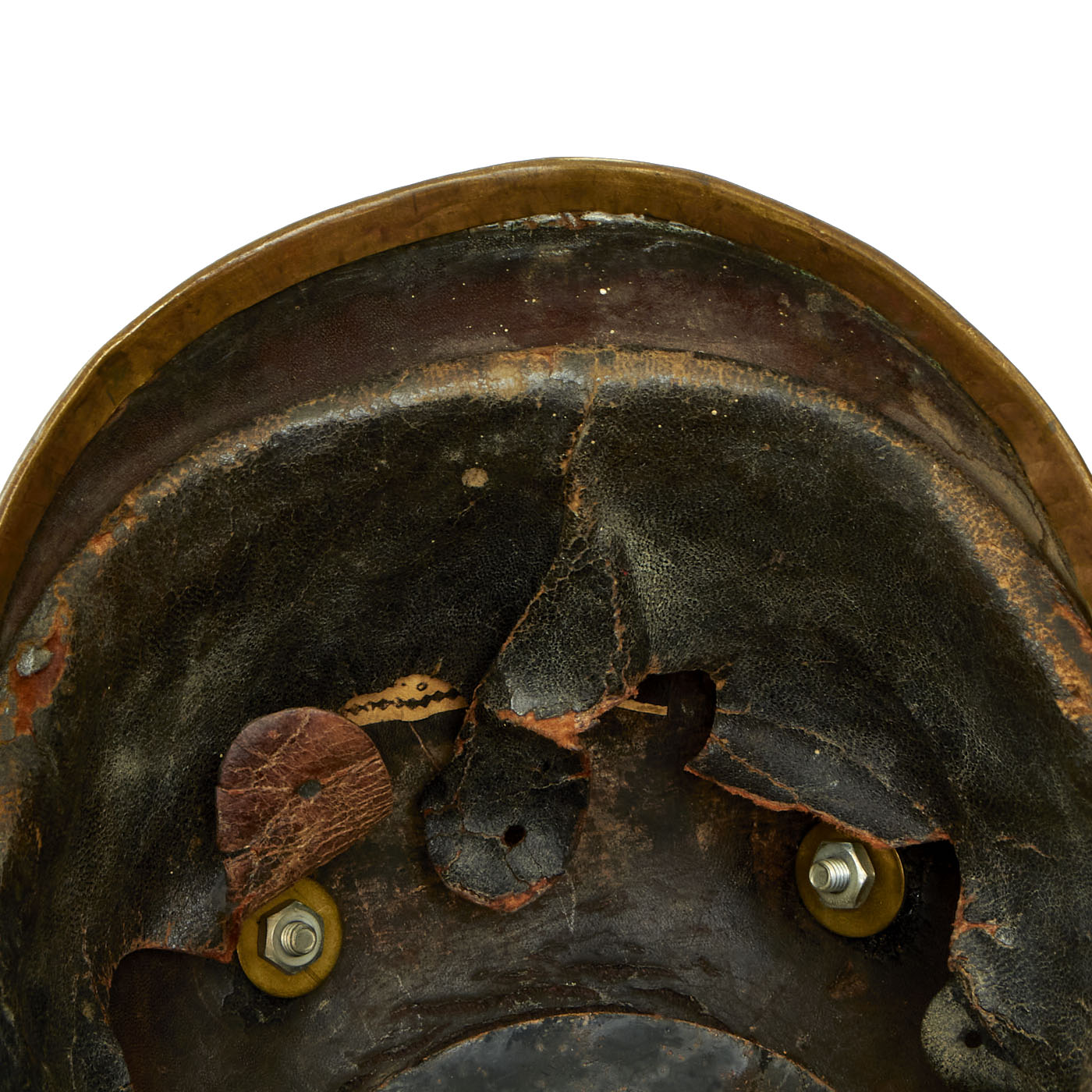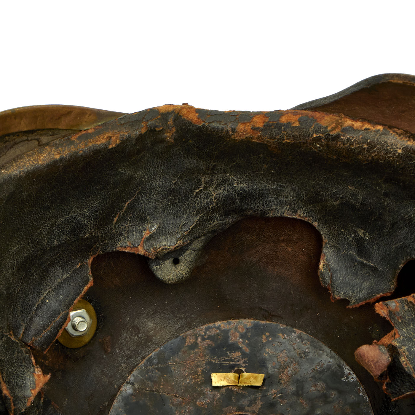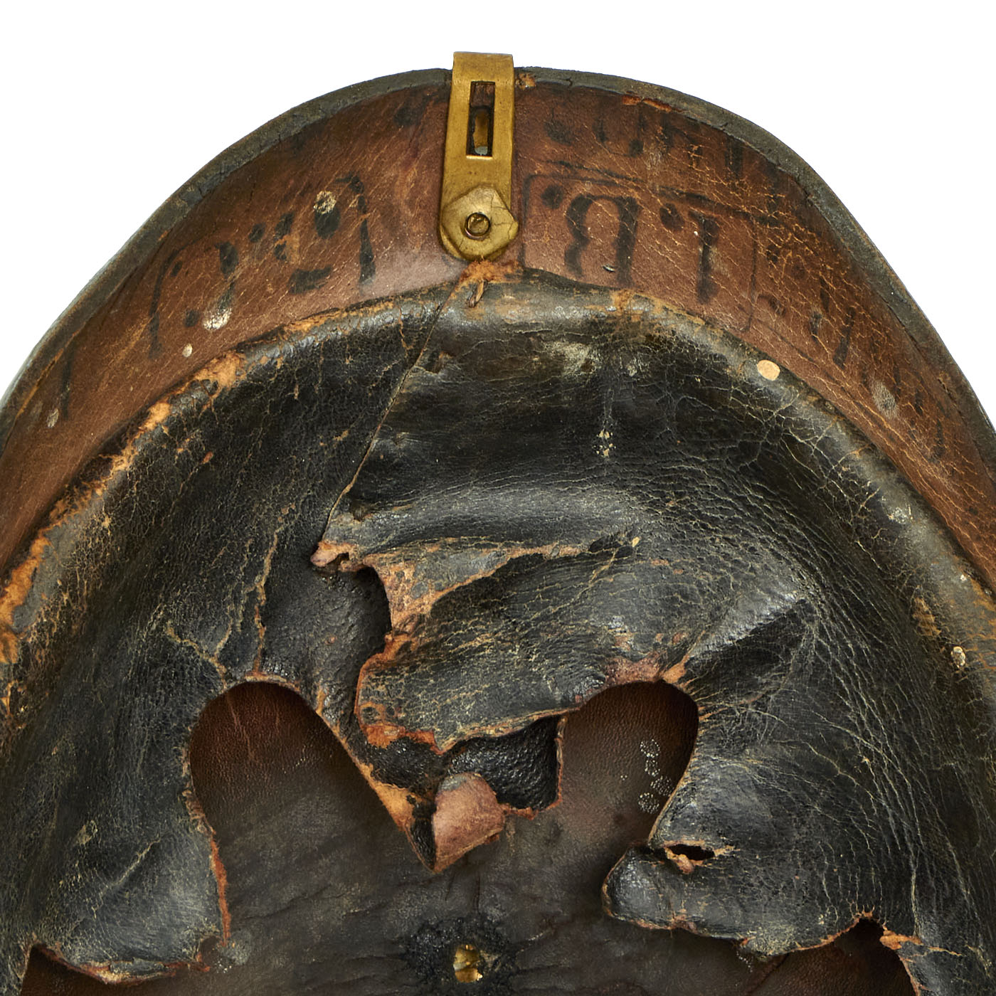 The lacquer finished leather is in very good condition having no serious issues, just the usual cracking and finish crazing due to age. The finish also fell victim to “restoration” and was relacquered with a heavy coat making the material extremely hard. All fittings are in good order but are loose. The interior features an original leather liner, with the expected wear from age. The visor stitching on the front and back is almost completely intact but has the high possibility of being restitched and glued on.
