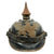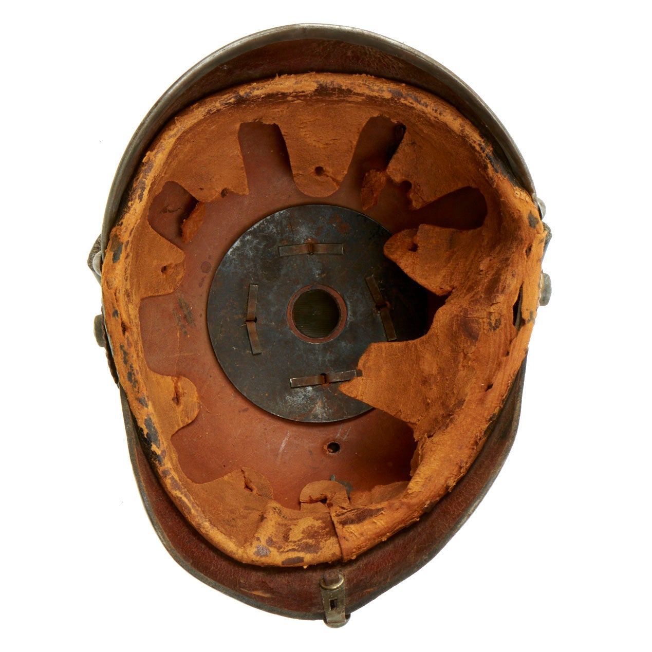 This helmet features a oxidized steel frontplate (wappen) with the Crowned Heraldic Griffin clutching a sword and resting on the Baden state shield. Below this is the Grand Duchy's motto: MIT GOTT F. FUERST U. VATERLAND (With God for Prince, or Grand Duke, and Fatherland). The crown of this leather helmet displays a vented enlisted removable spike mount on an oxidized steel baseplate. The spike is in excellent condition, and is easily removable using the "bayonet-style" attaching system. It should be noted that the pieces of leather that attach the wappen to the helmet are still used, and intact.