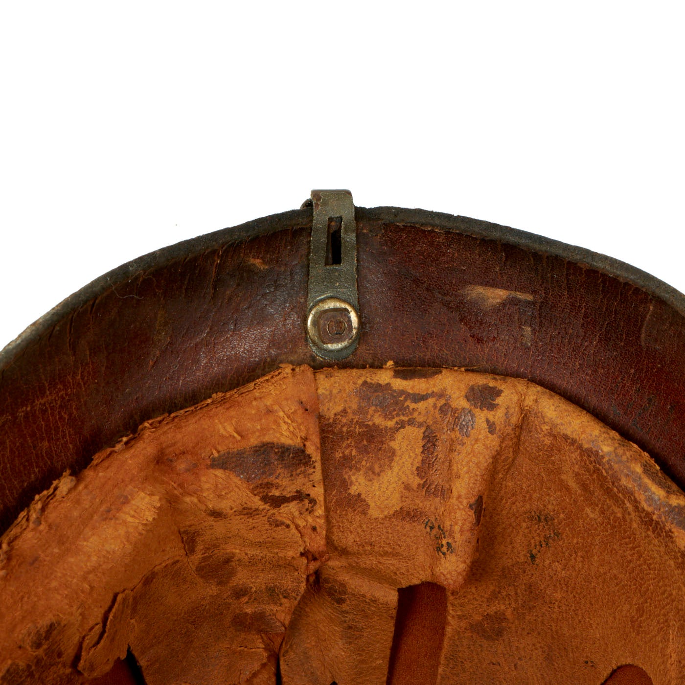 The interior features The original leather liner, which is in frail condition, but still intact. The helmet is unit marked on the inside of the rear visor “JR 171” is what it appears to be. The chin strap is a museum-quality reproduction that has been aged to match the age and patina of the helmet.