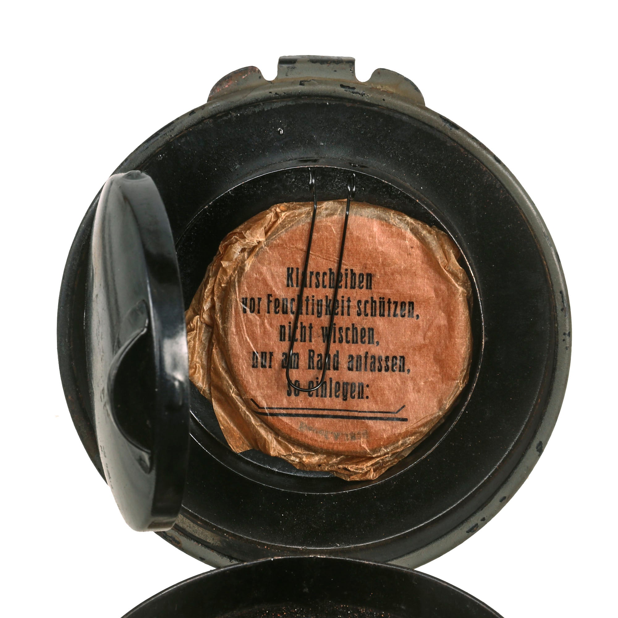 This mask is offered in good condition. Original can sling is present and complete but is in rather delicate, torn condition so handle with caution. Mask is complete with 2 original intact lenses, facemask straps and original neckstrap. There are also markings stamped into the fabric of the mask. Original filter is dated 15. MARz 1918, and there are sets of spare lenses in the can.