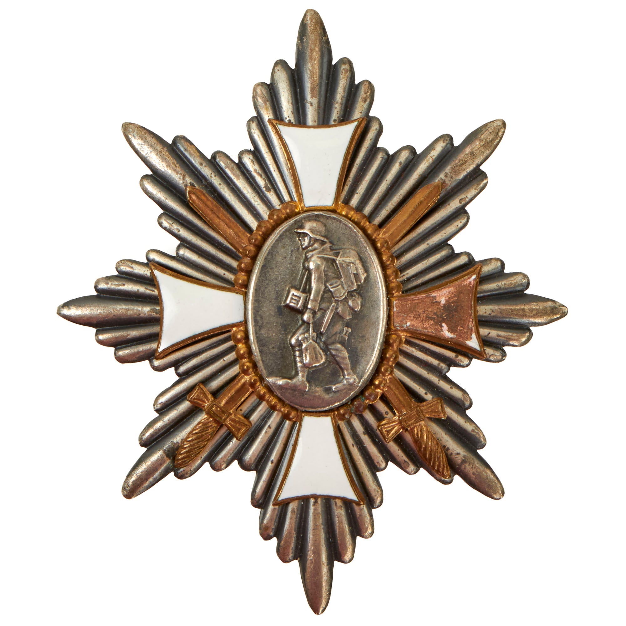 The Hamburg Veteran’s Honour Cross, known as the Hamburg Kreuz, is a die-struck metal and enamel multiple piece constructed badge, awarded to German Army veterans who served in the Great War. It shows an embossed nickel silver image of a soldier in their combat loadout in the center, surmounted on a brass Tatzenkreuz (cross pattée) with crossed swords. This itself is mounted on top of a silver plated nickel silver eight pointed star backing plate.