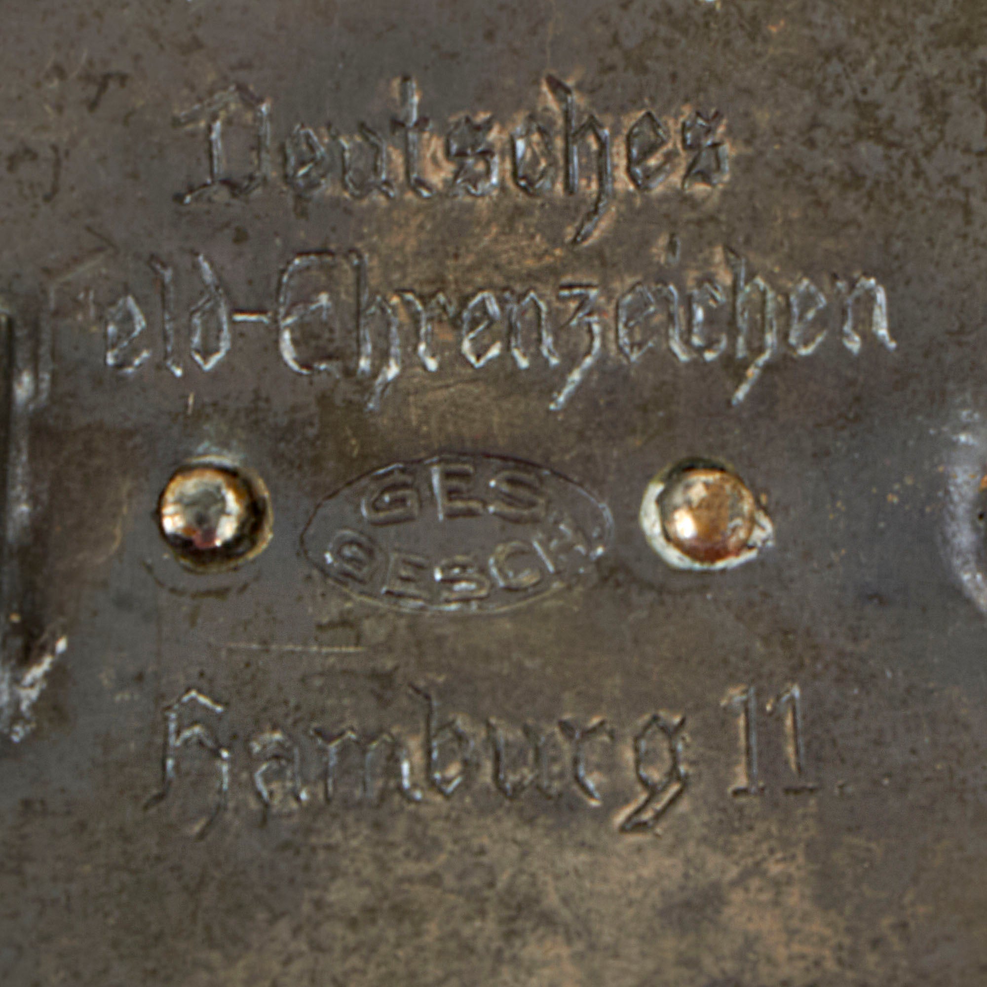The badge is stamped on reverse with "Deutsches Feld-Ehrenzeichen" (German Field - Honour-award), stamped in the middle maker marked "Ges. Gesch." with "Hamburg 11" stamped underneath. The tapered pin back and bent round wire catch are fully functional.