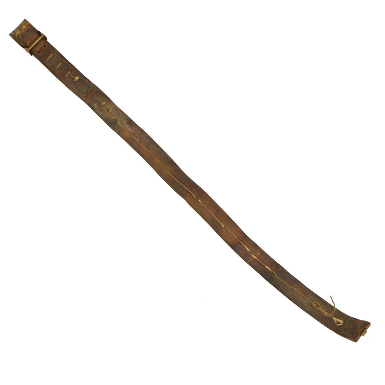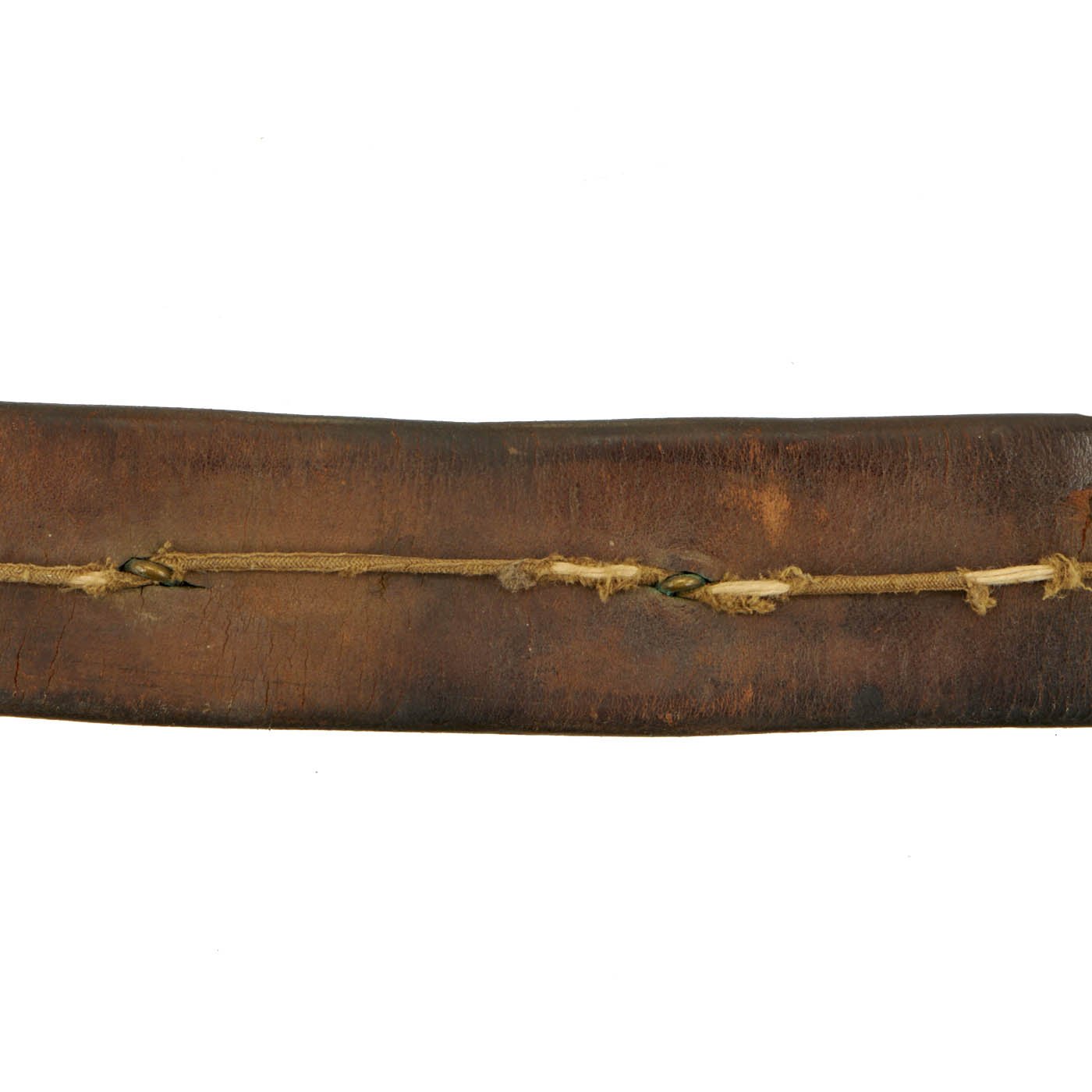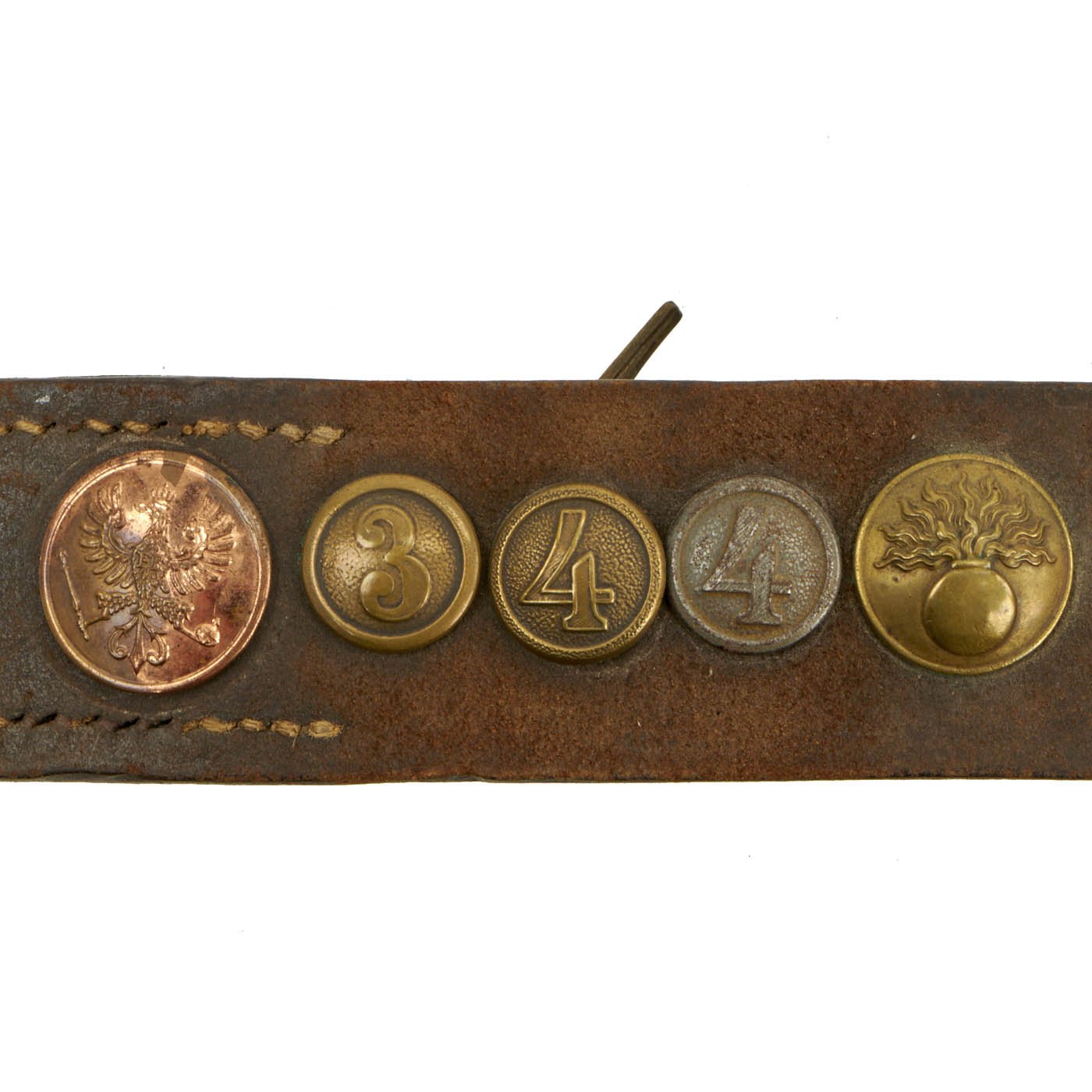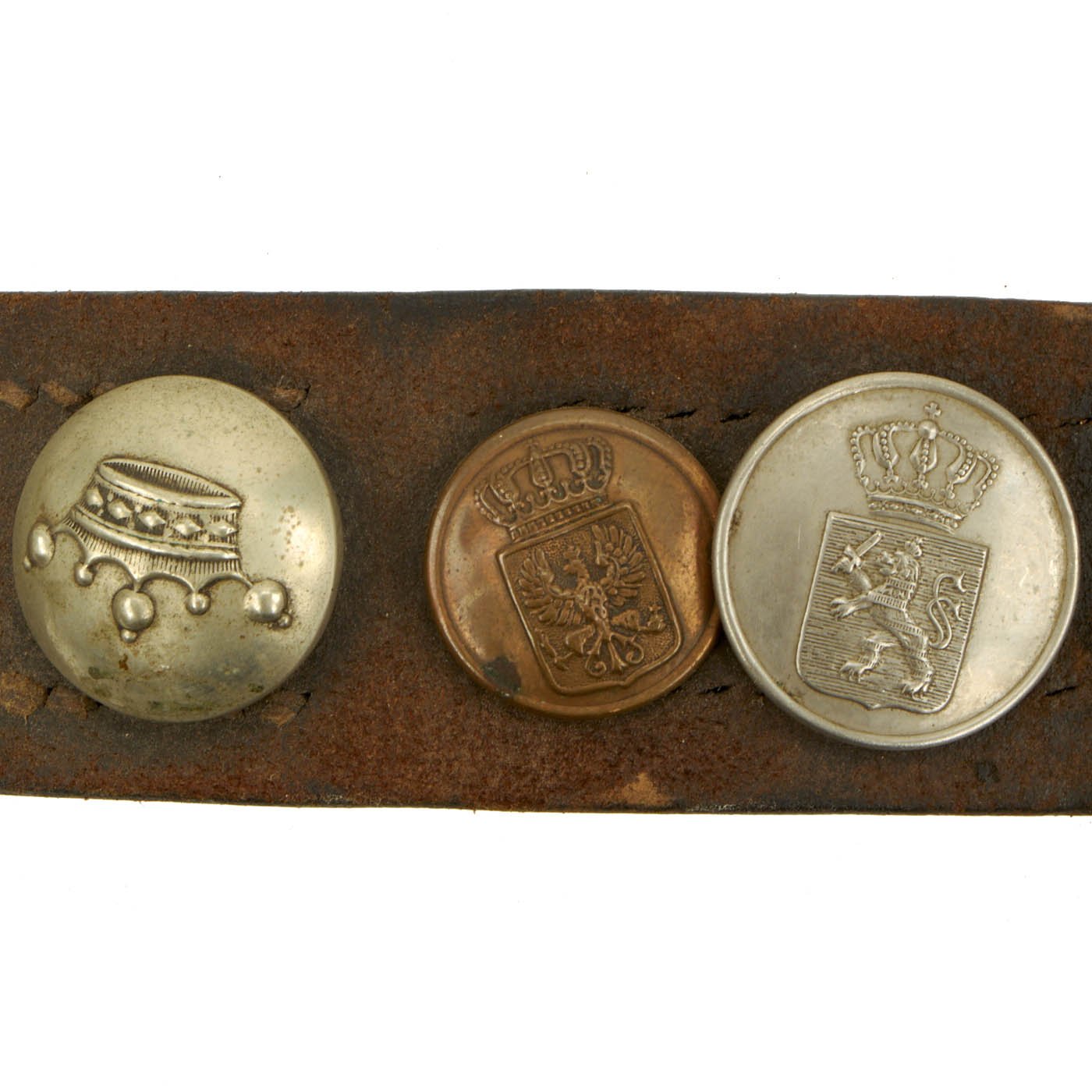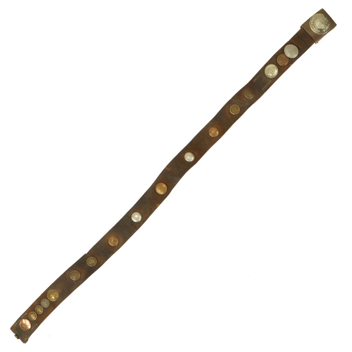 It features 17 buttons attached to the leather belt, most held in place by shoelaces, though one is attached by its own split pin. Most of the buttons look to be German in origin, while others simply have numbers, and a few are completely unmarked. It measures about 36 inches in overall length and is 1 3/4 inches wide. The buckle tab is still intact, so the buckle can be moved if desired,