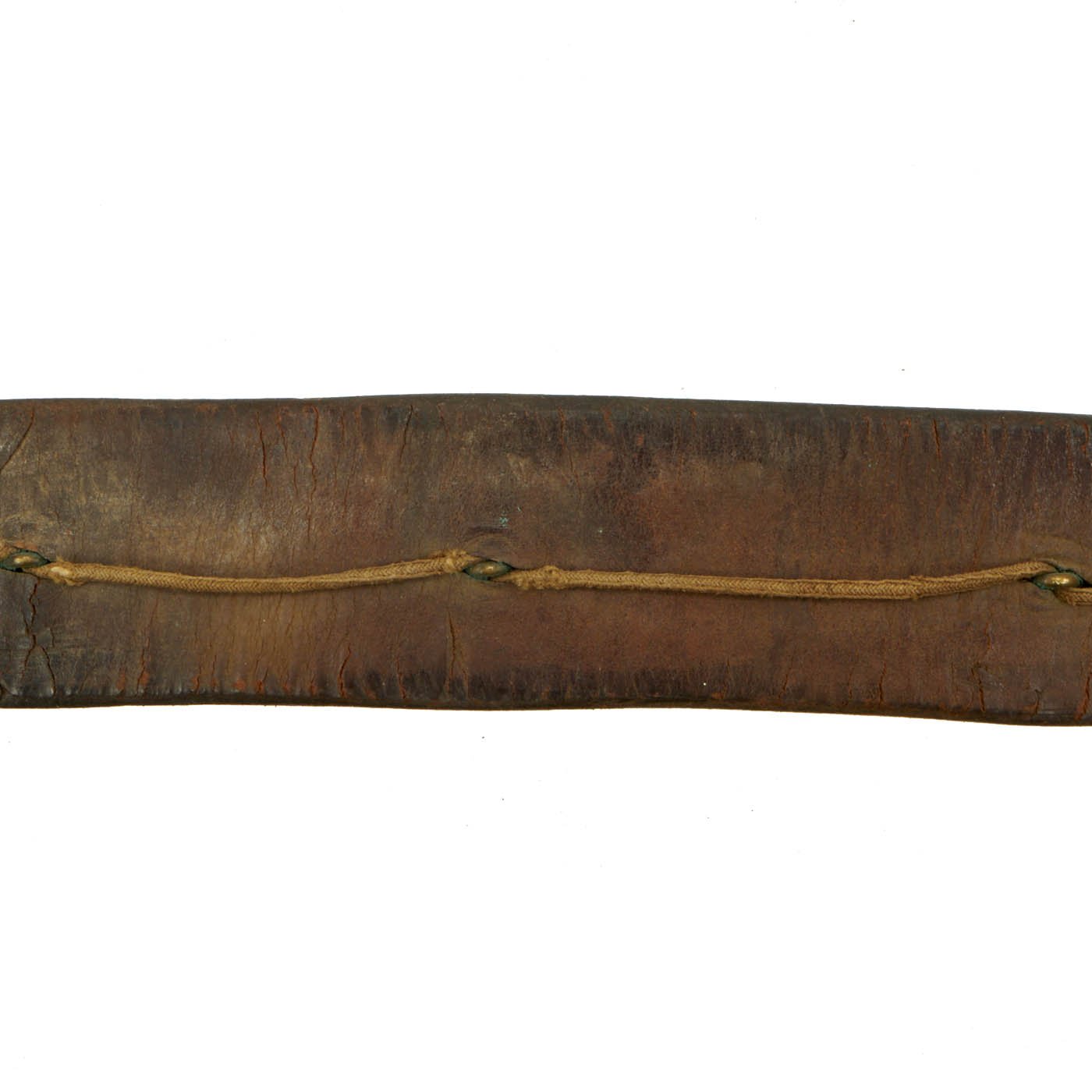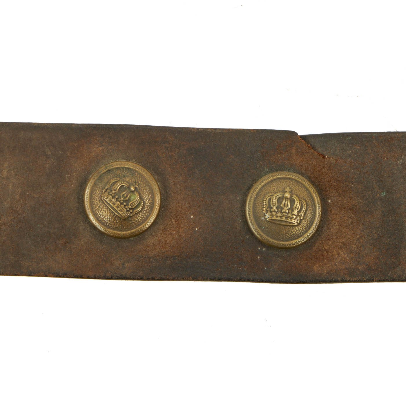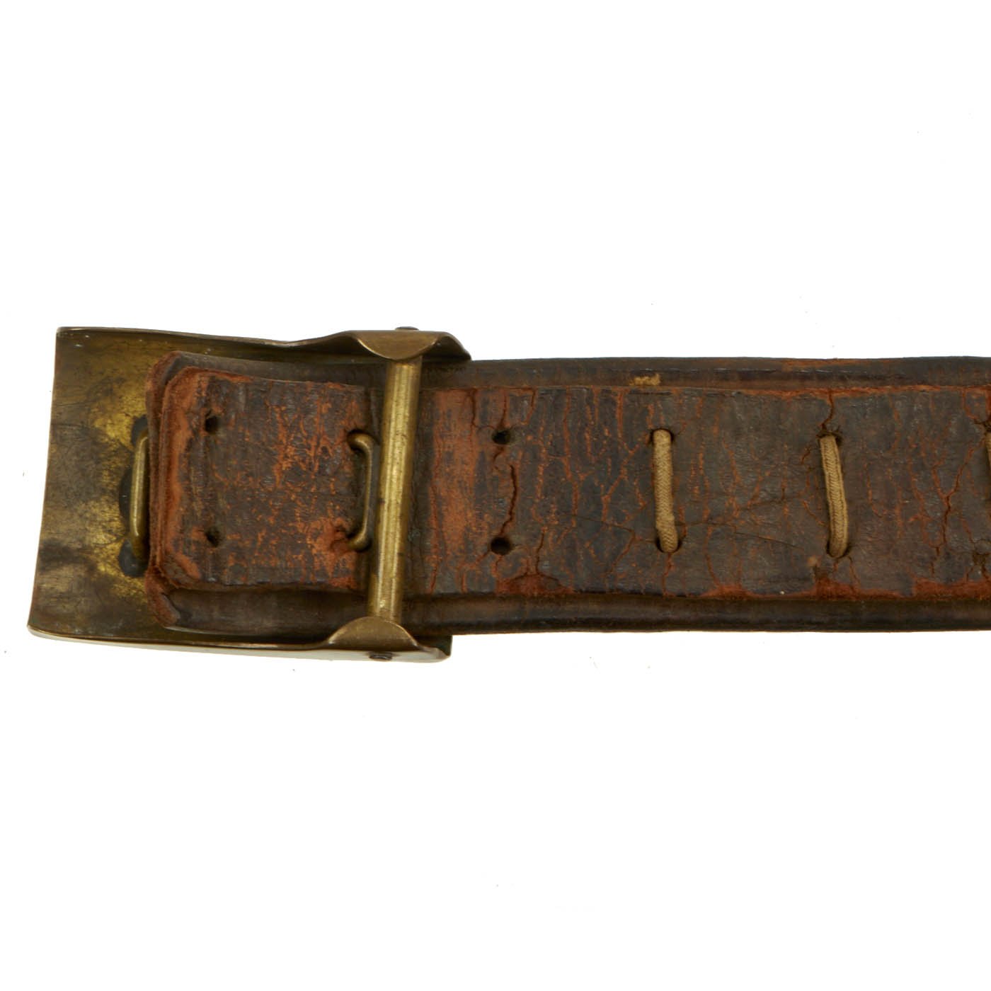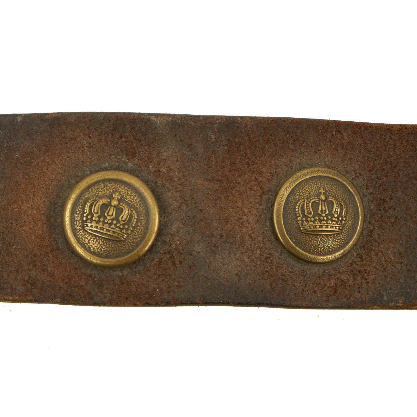 This example offered in very good condition features a GOTT MIT UNS (God [is] with us) Imperial German issue Prussian Brass Belt Buckle with Nickel Emblem, with its correct original leather belt. It has seen use, but the emblem on the buckle is still fully legible, with only minor wear. The belt has however gotten a bit stiff over the years, and the leather has some cracking. It still has a partly legible maker mark over a 1915 date, so it is definitely WWI period.