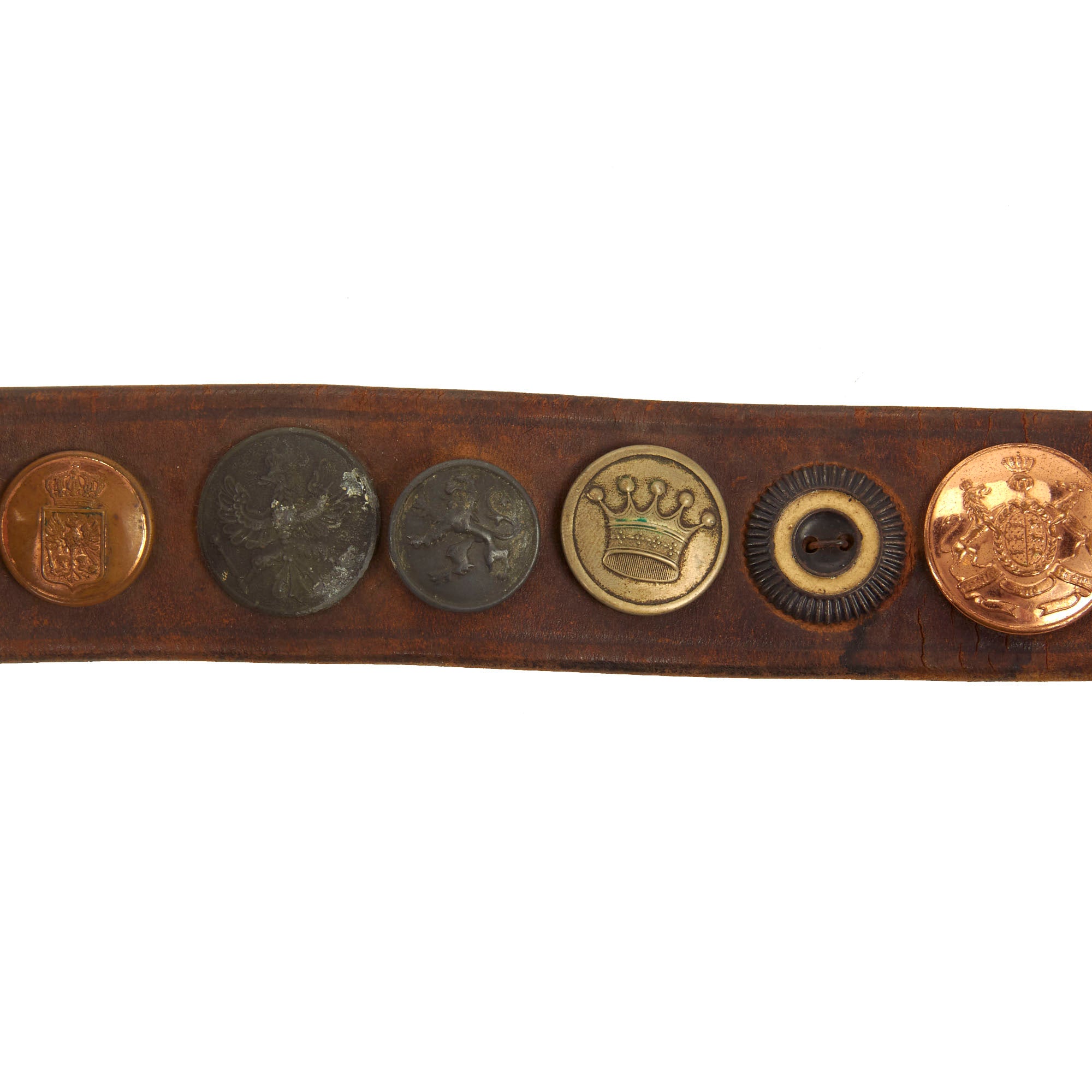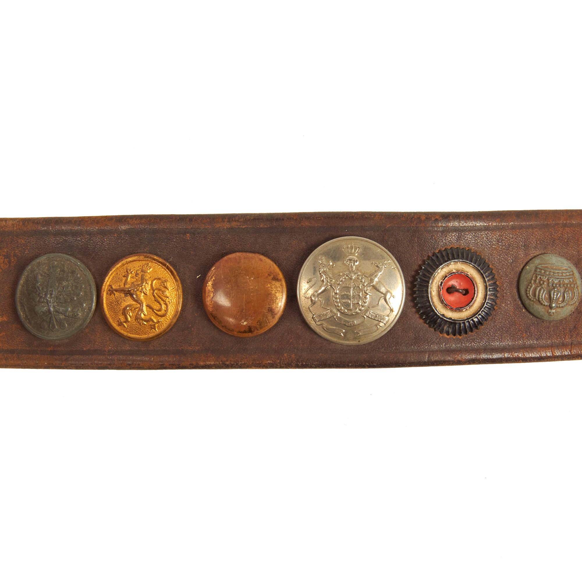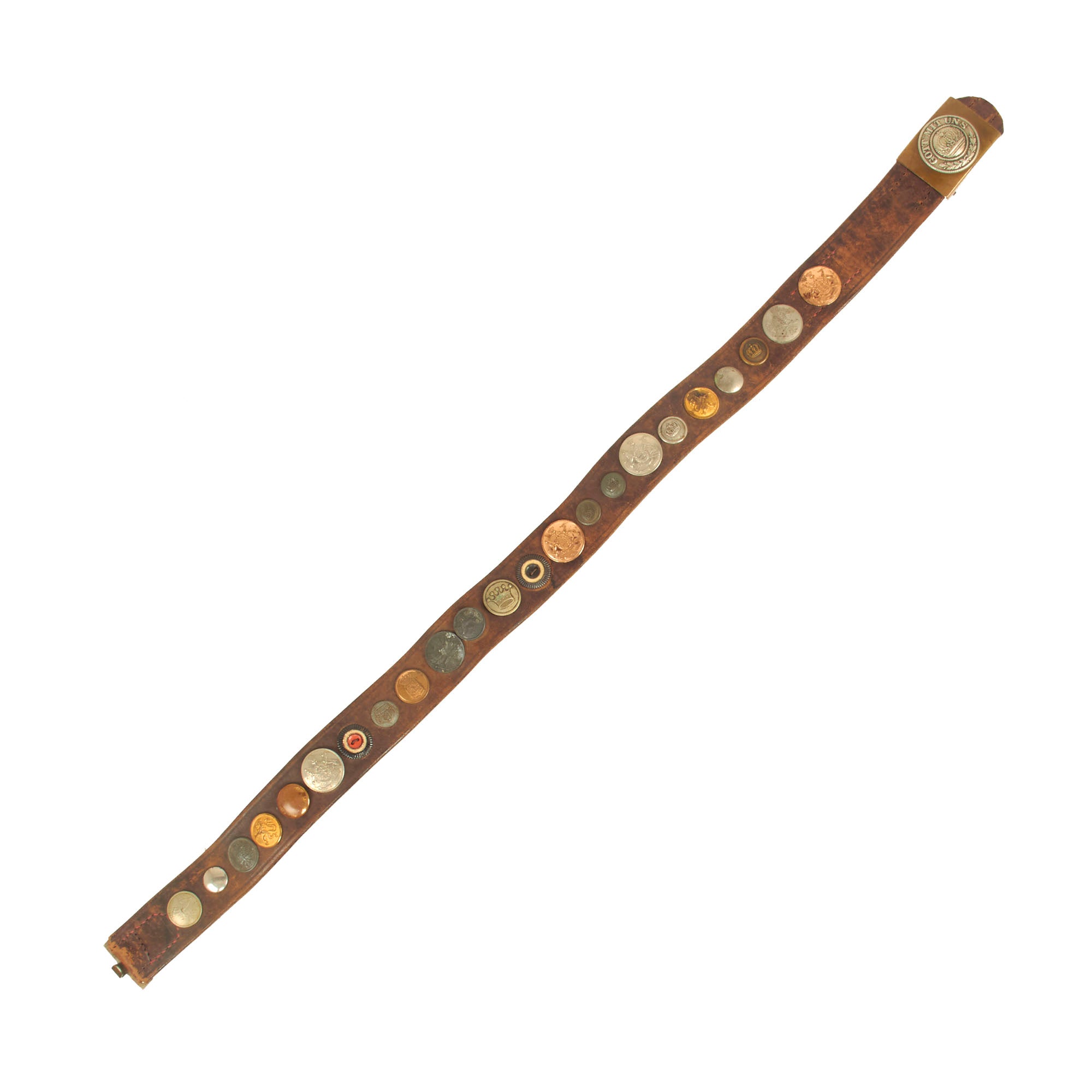 It features an impressive 23 items in total, most of which are buttons from various countries, states, and so forth. There is also a German Tri-color Reichskockarde (Imperial cockade) from a cap, and various British/German Empire buttons. The items are attached by their own attachment studs, or held in place by string or wire. All items appear to be present on the belt and there are no spaces or evidence of more attachments.