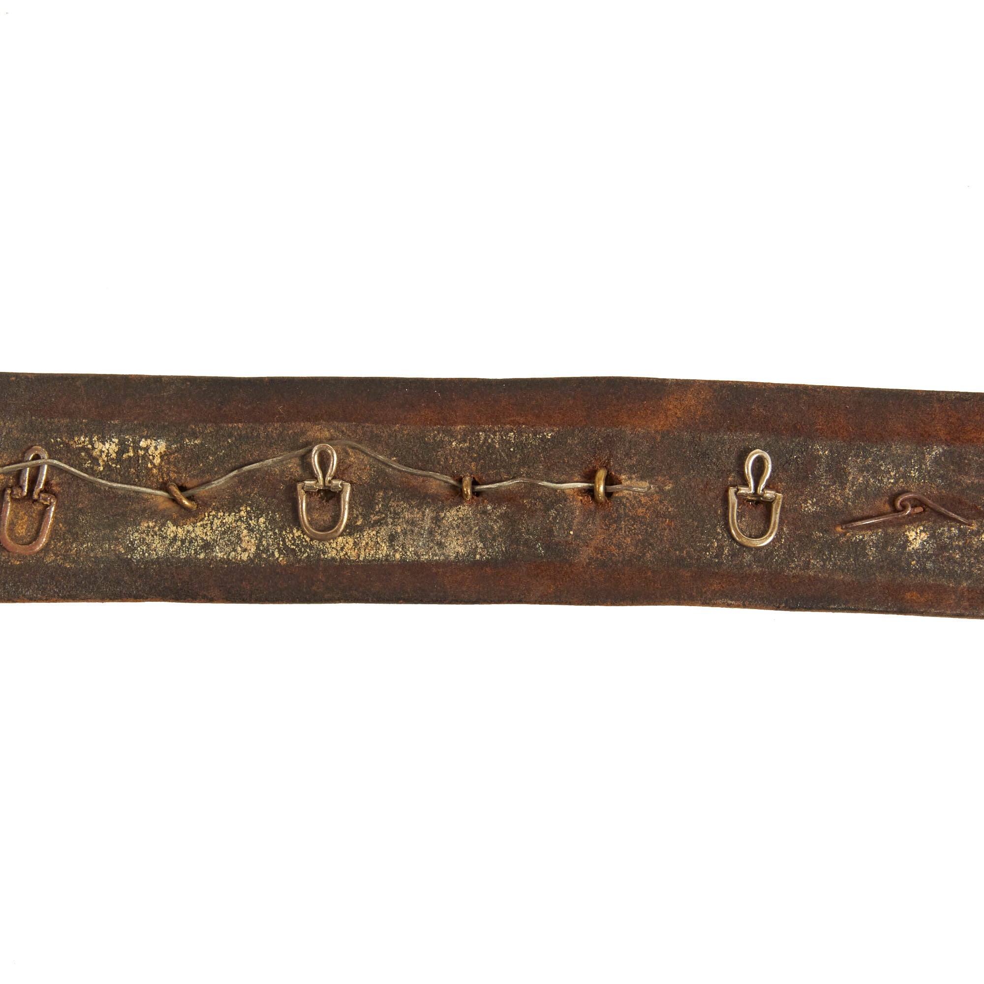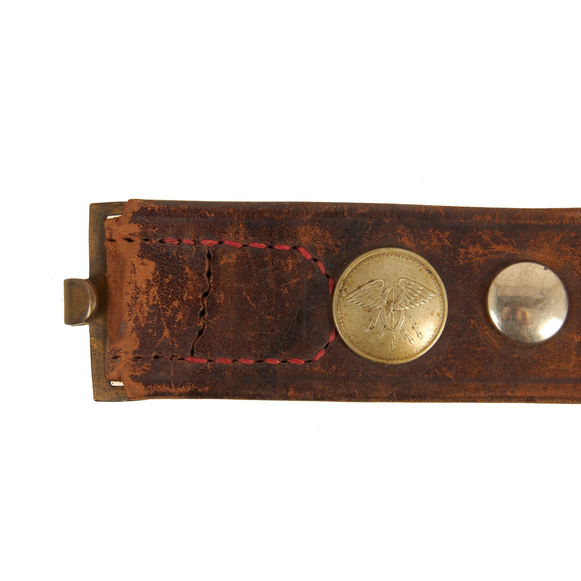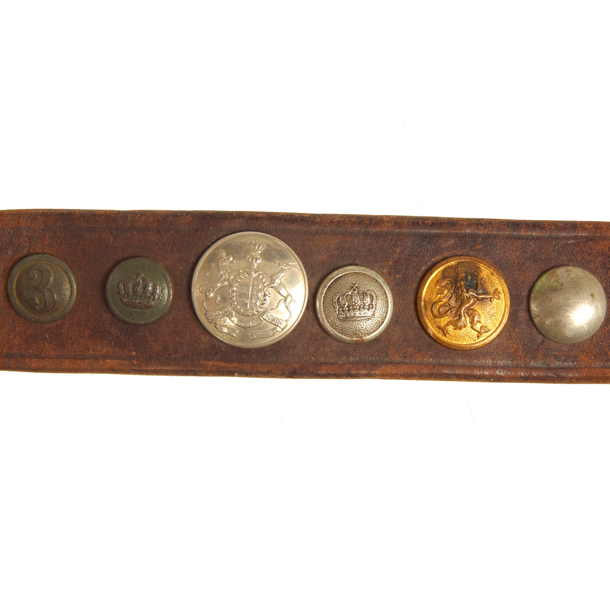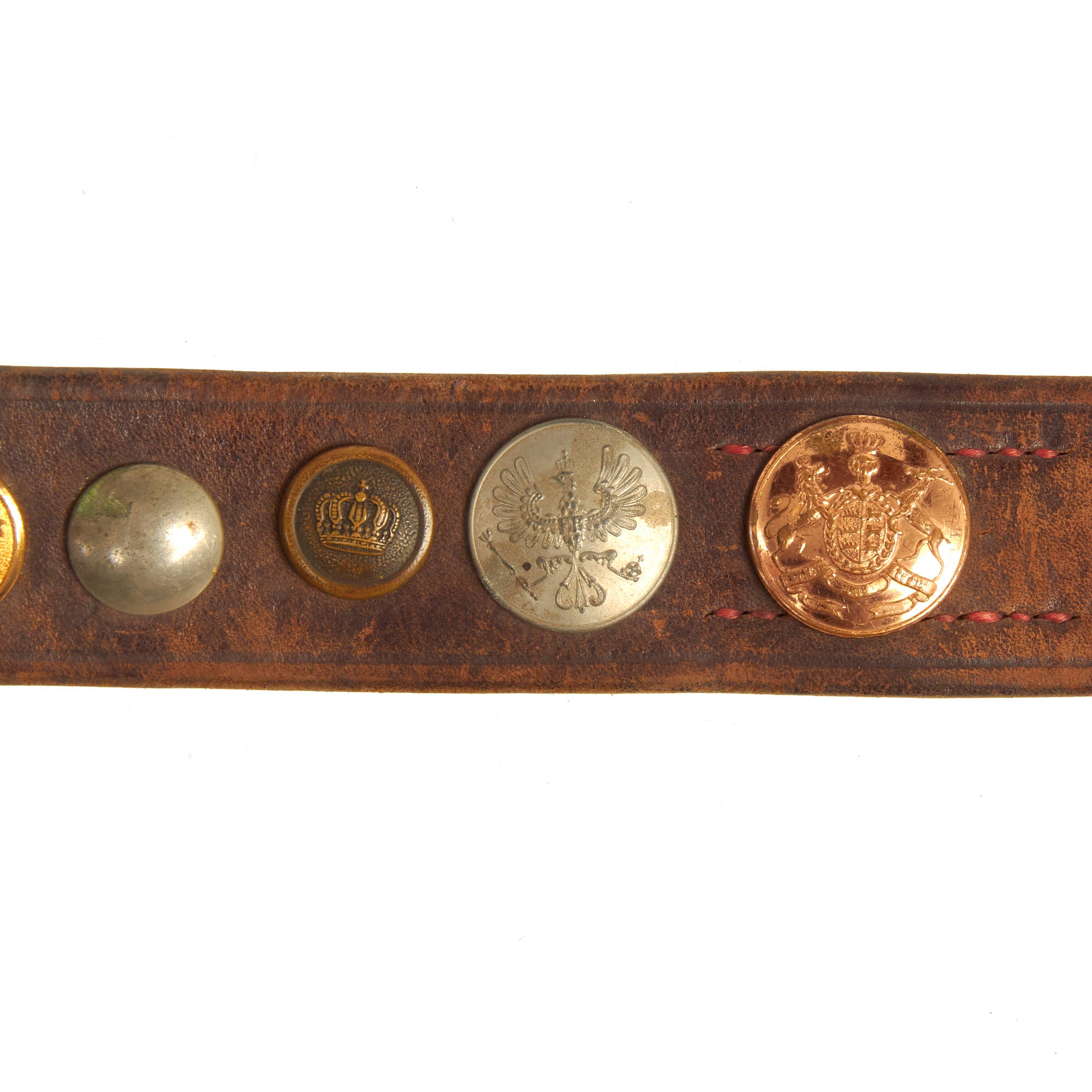 It features an impressive 23 items in total, most of which are buttons from various countries, states, and so forth. There is also a German Tri-color Reichskockarde (Imperial cockade) from a cap, and various British/German Empire buttons. The items are attached by their own attachment studs, or held in place by string or wire. All items appear to be present on the belt and there are no spaces or evidence of more attachments.