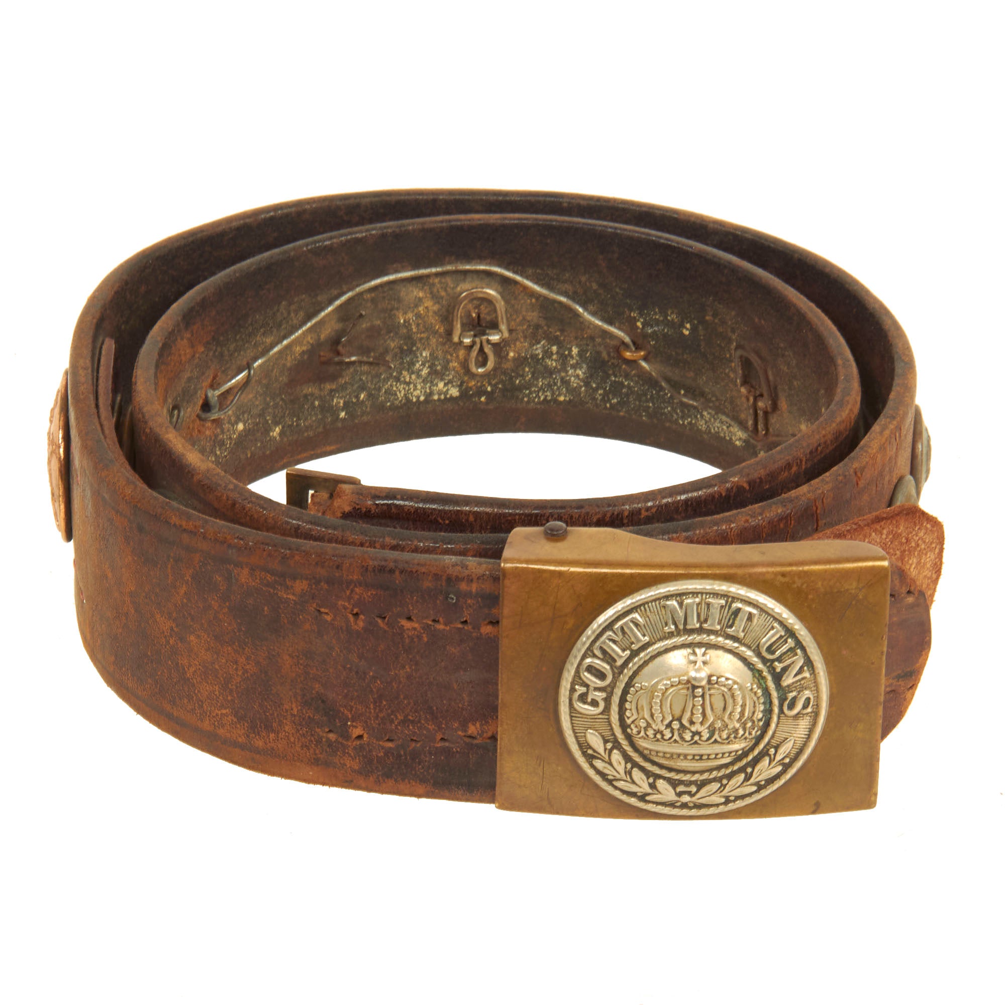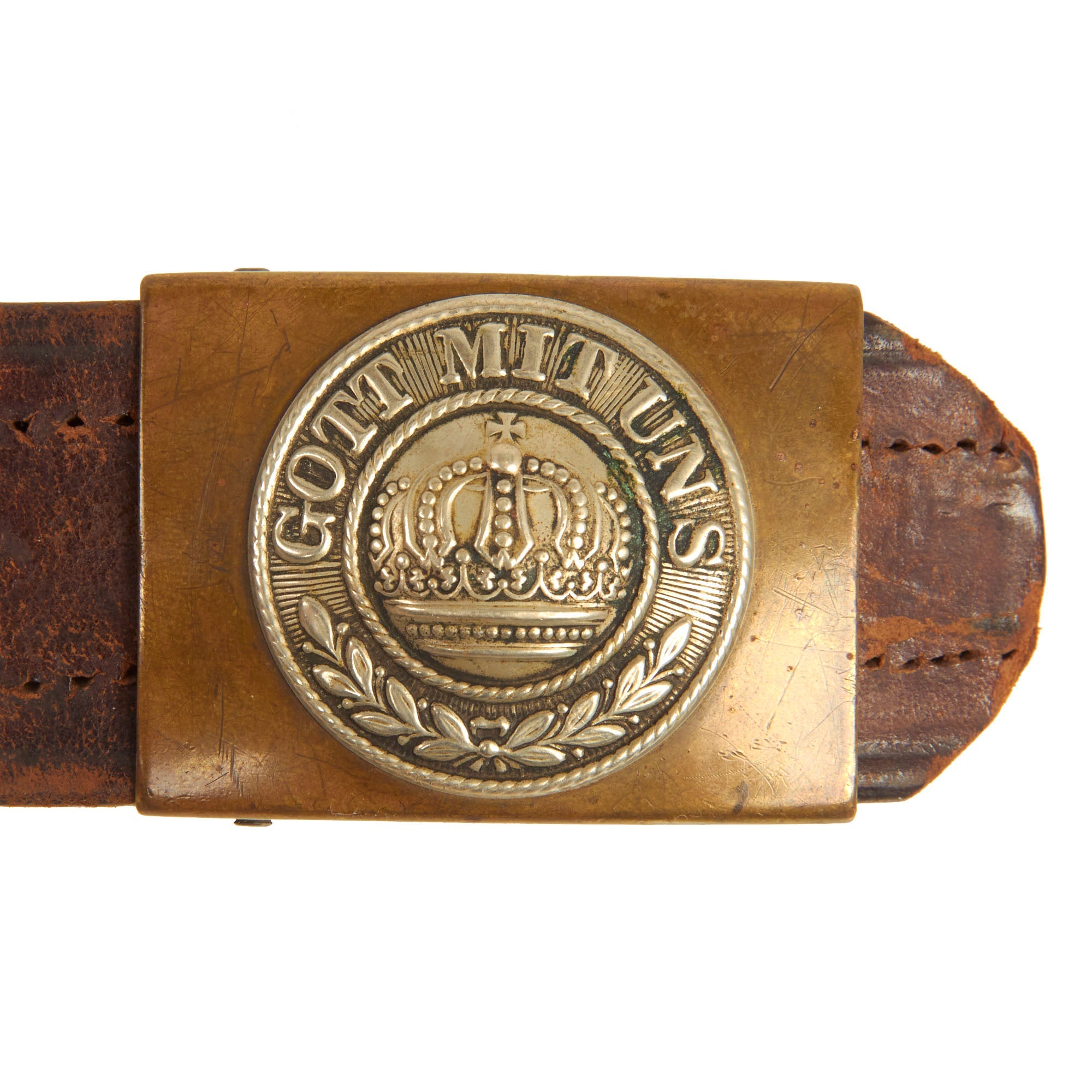 This example offered in very good condition features a GOTT MIT UNS (God [is] with us) Imperial German issue Prussian Brass Belt Buckle with Nickel Emblem, with its correct original leather belt. It has only seen light use, so the buckle front emblem still has almost all of the detail.