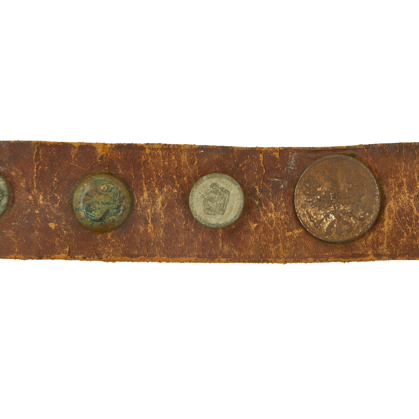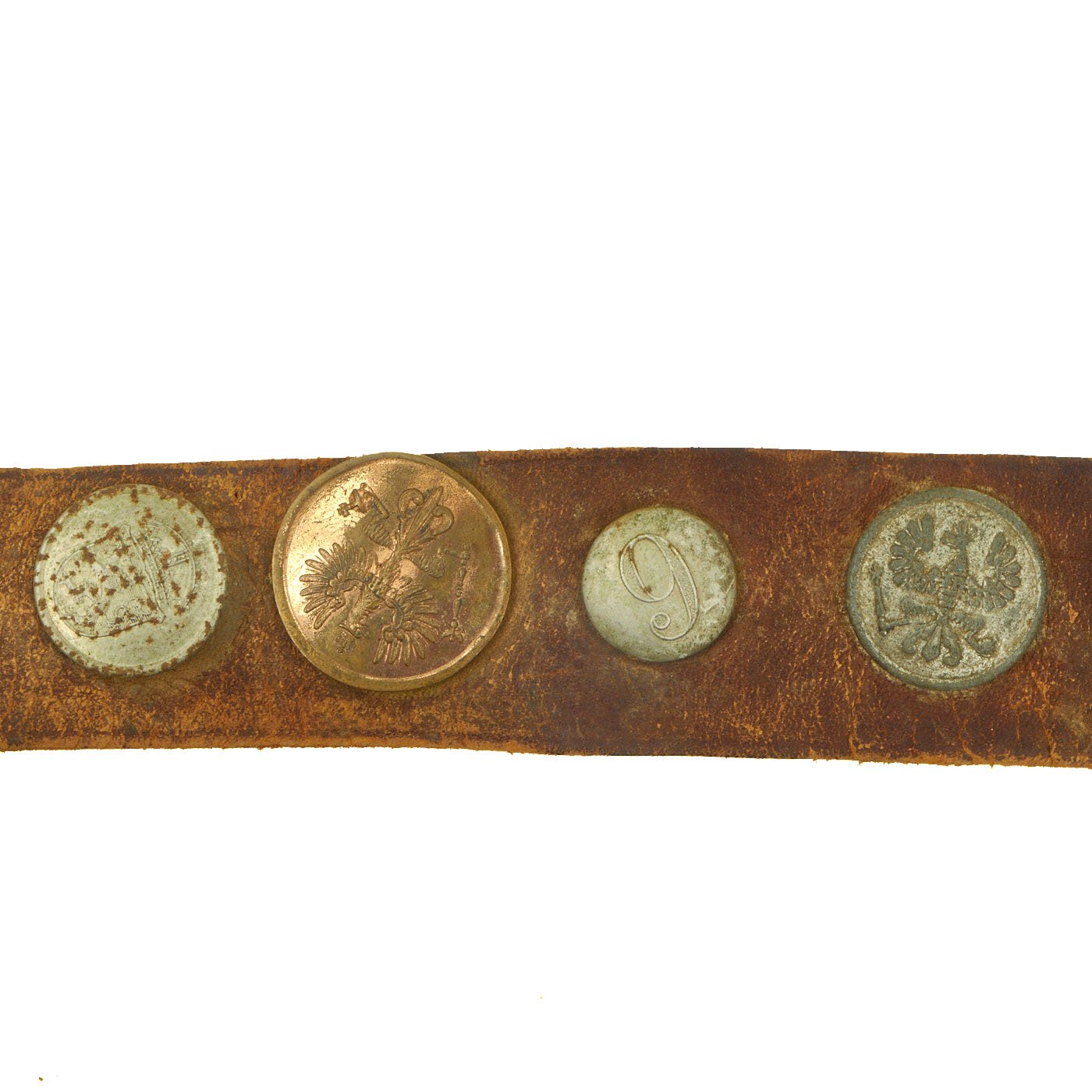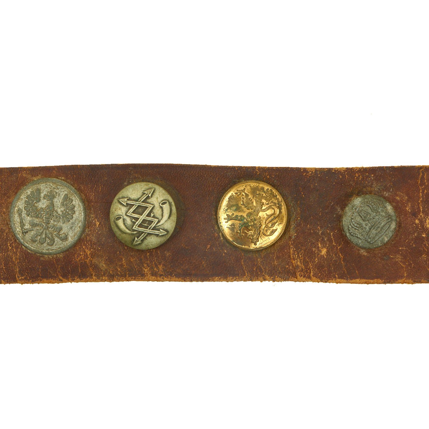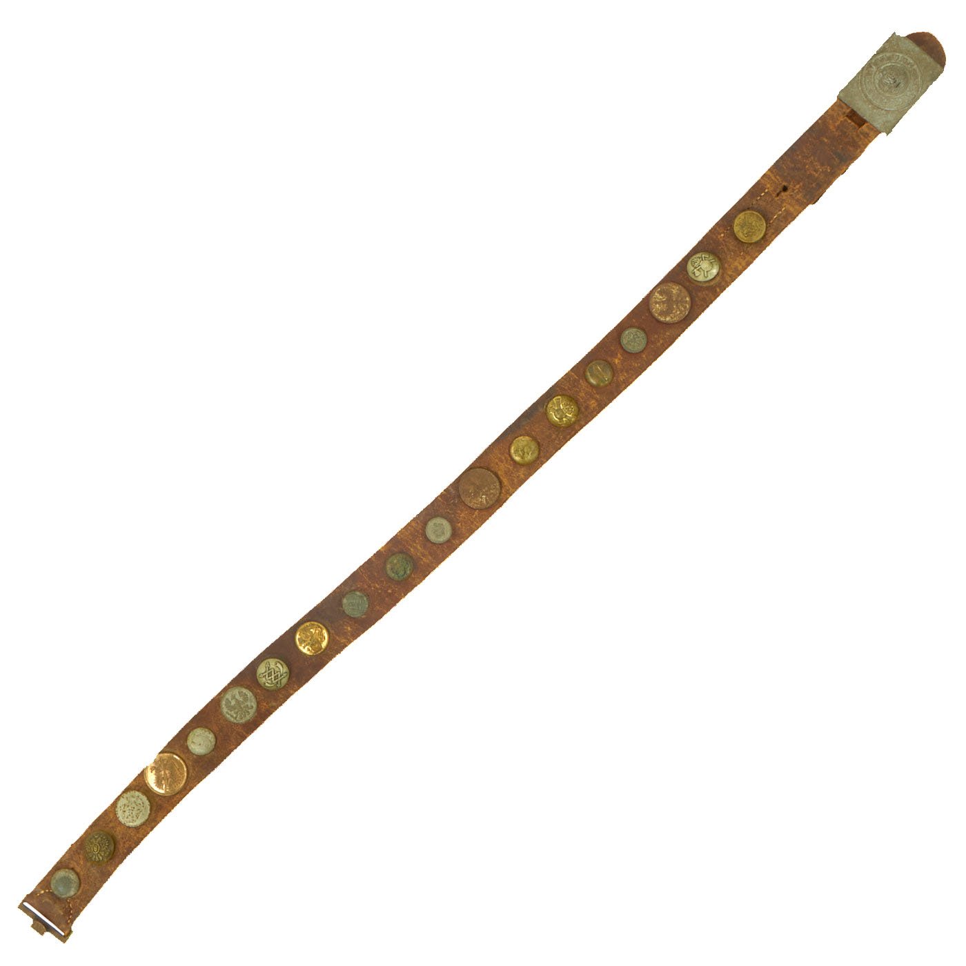 It features 19 attached buttons, all attached to the belt with cotter pins or split rings through the button loops. Most of the buttons appear to be German in origin, but a least one is definitely American, and marked U.S. / M.H.S.. Most have insignia, but a few have just numbers or are blank.