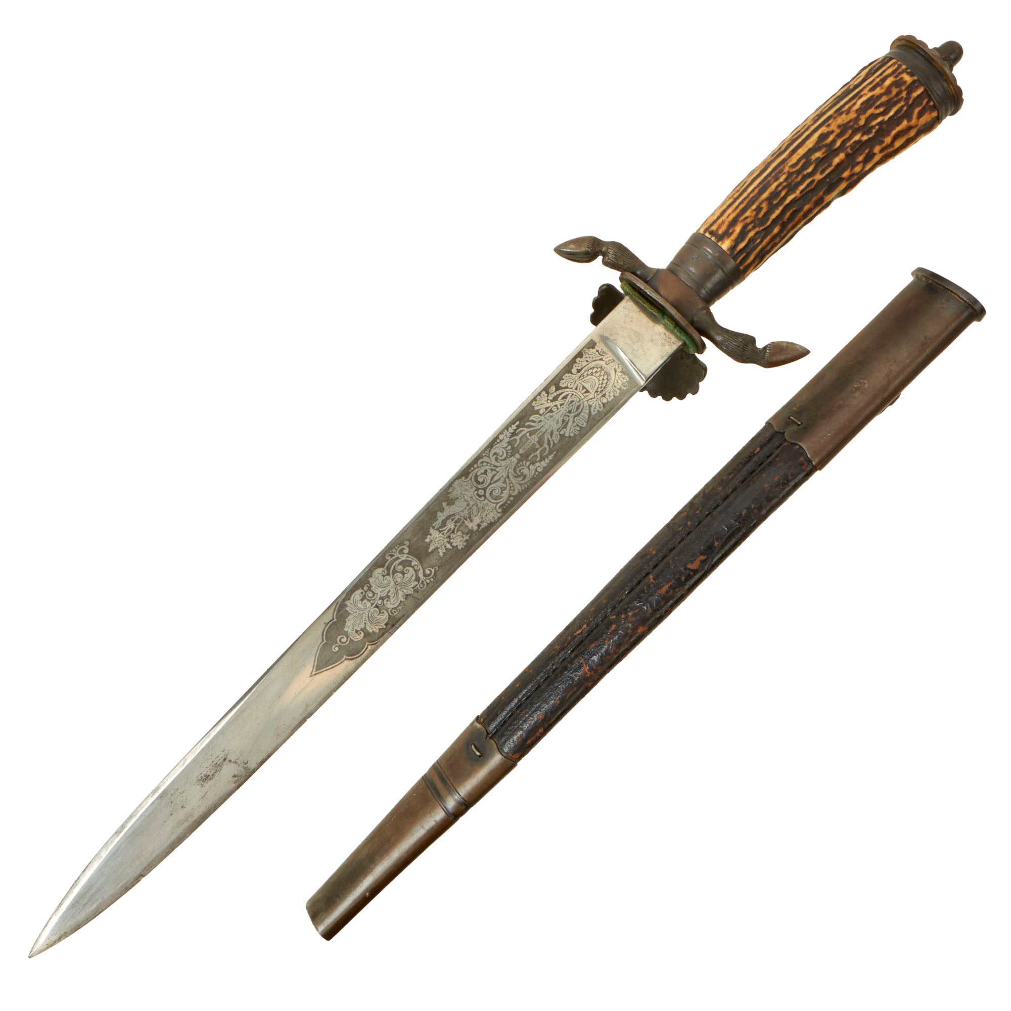 Original Item: Only One Available. In use for centuries, the German Hirschfänger (Deer Catcher) long hunting daggers have always made lovely display pieces, as well as military sidearms. Many of the early bayonets used by the various German States were based on the Hirschfänger design, which is both simple and elegant, almost a short sword in practical terms.