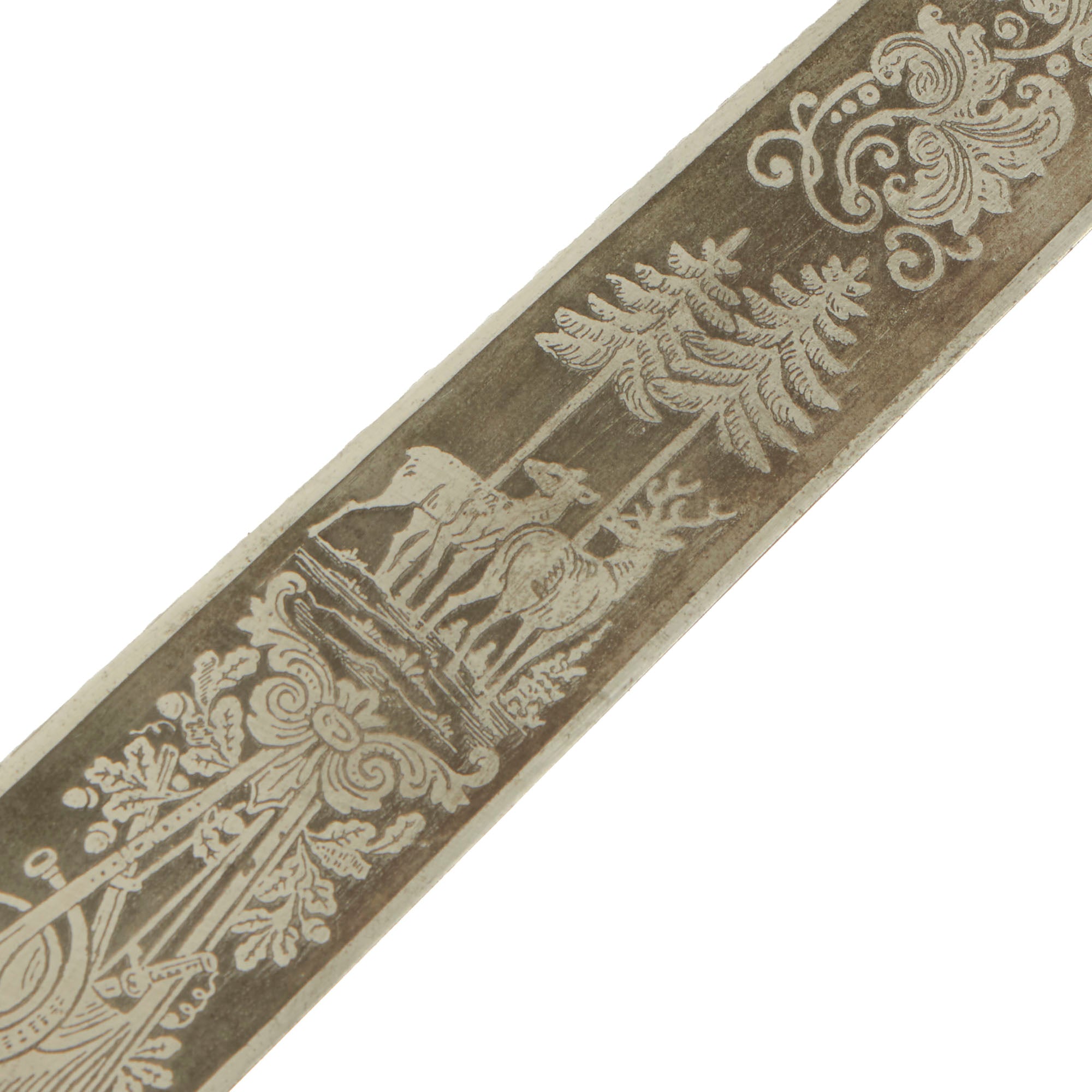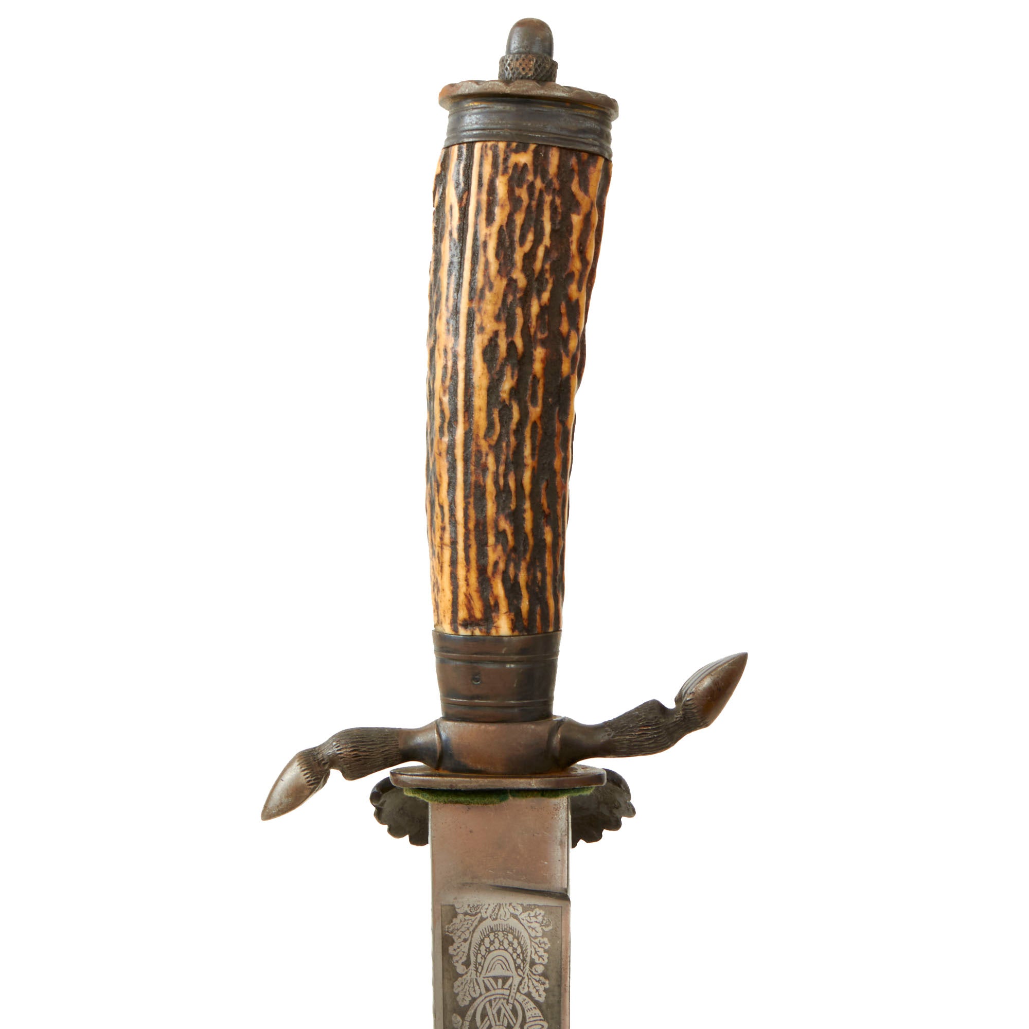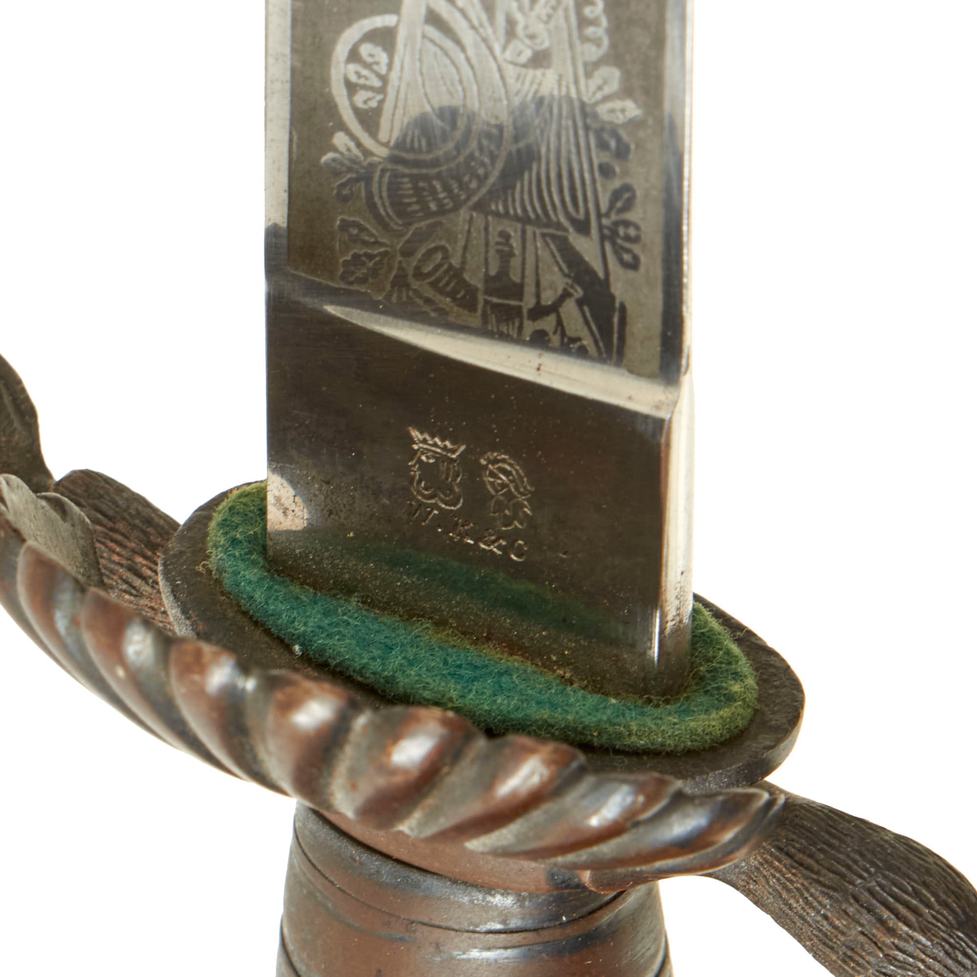 The blade has lovely etched panels on both sides, showing floral engraving as well as animals in the forest. The blade is marked on the ricasso with the double trademark "King's Helmet" (Ritter-helm) alongside a "Kings's Head" (königskopf) over W.K. & C. logo of legendary German maker Weyersberg Kirschbaum & Cie of Solingen. This trademark is used on privately purchased blades and walking out bayonets in the late 19th and early 20th centuries, and is absolutely correct for this sword. This company is a famous manufacturer of military swords and cutlery in Solingen, Germany - a city famous since the middle ages for its metal-working and craftsmanship in sword making.