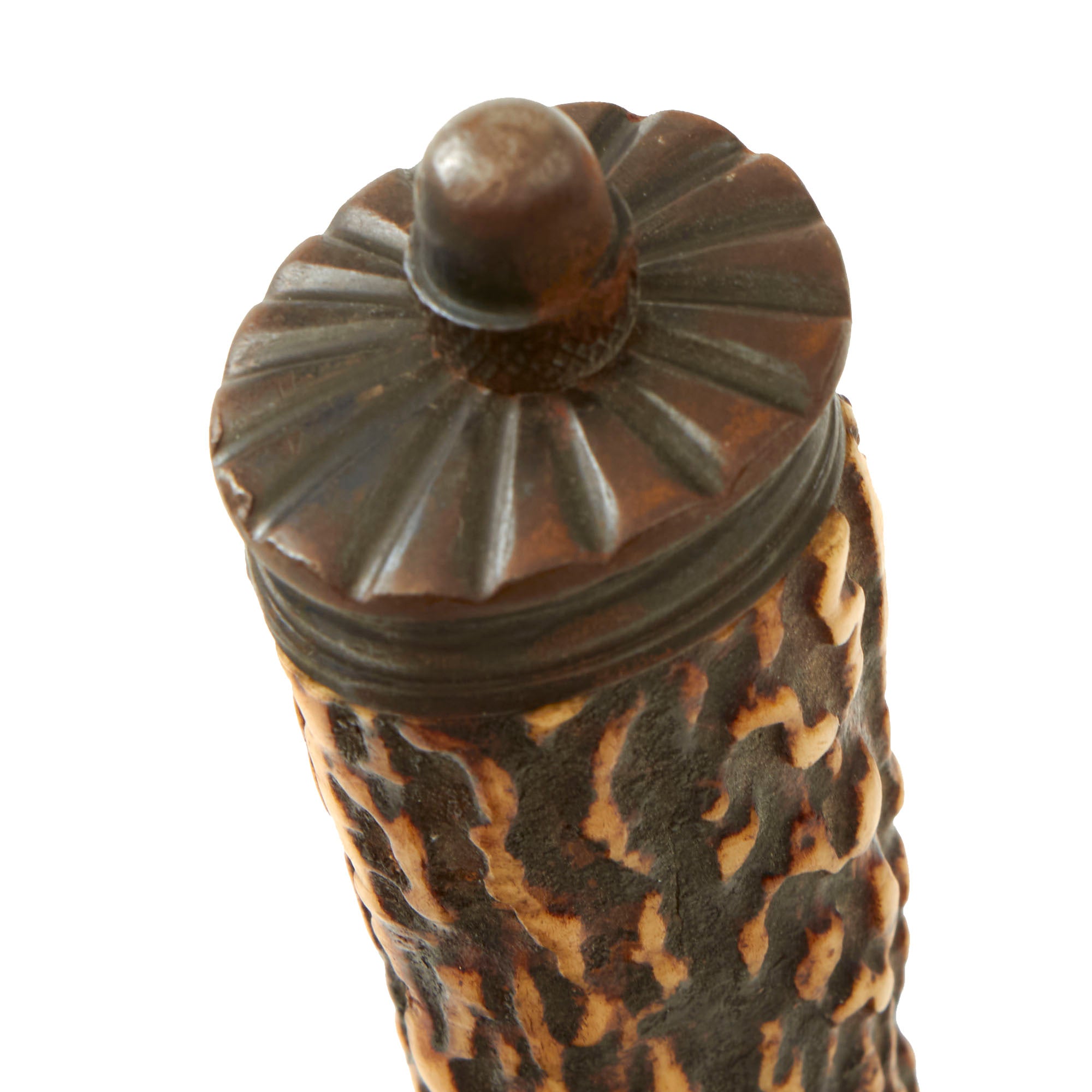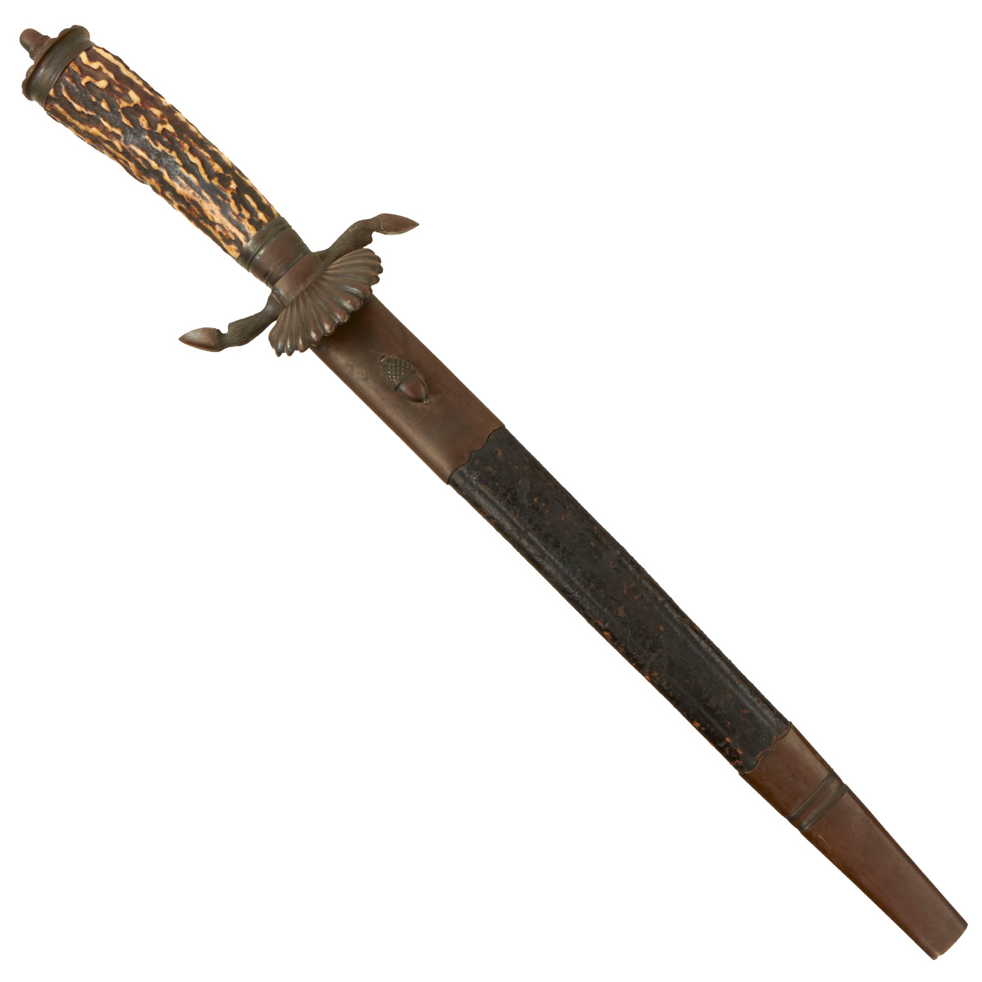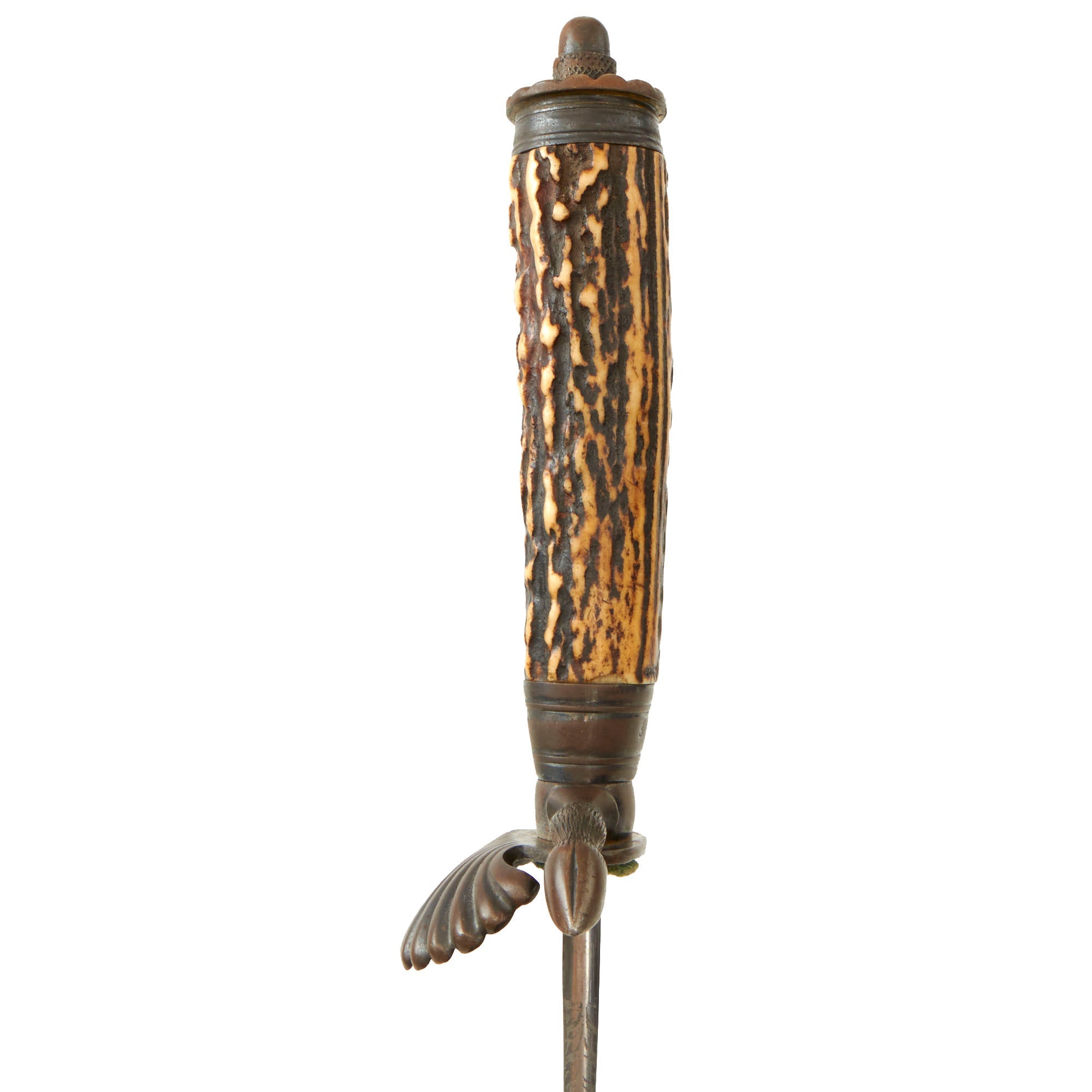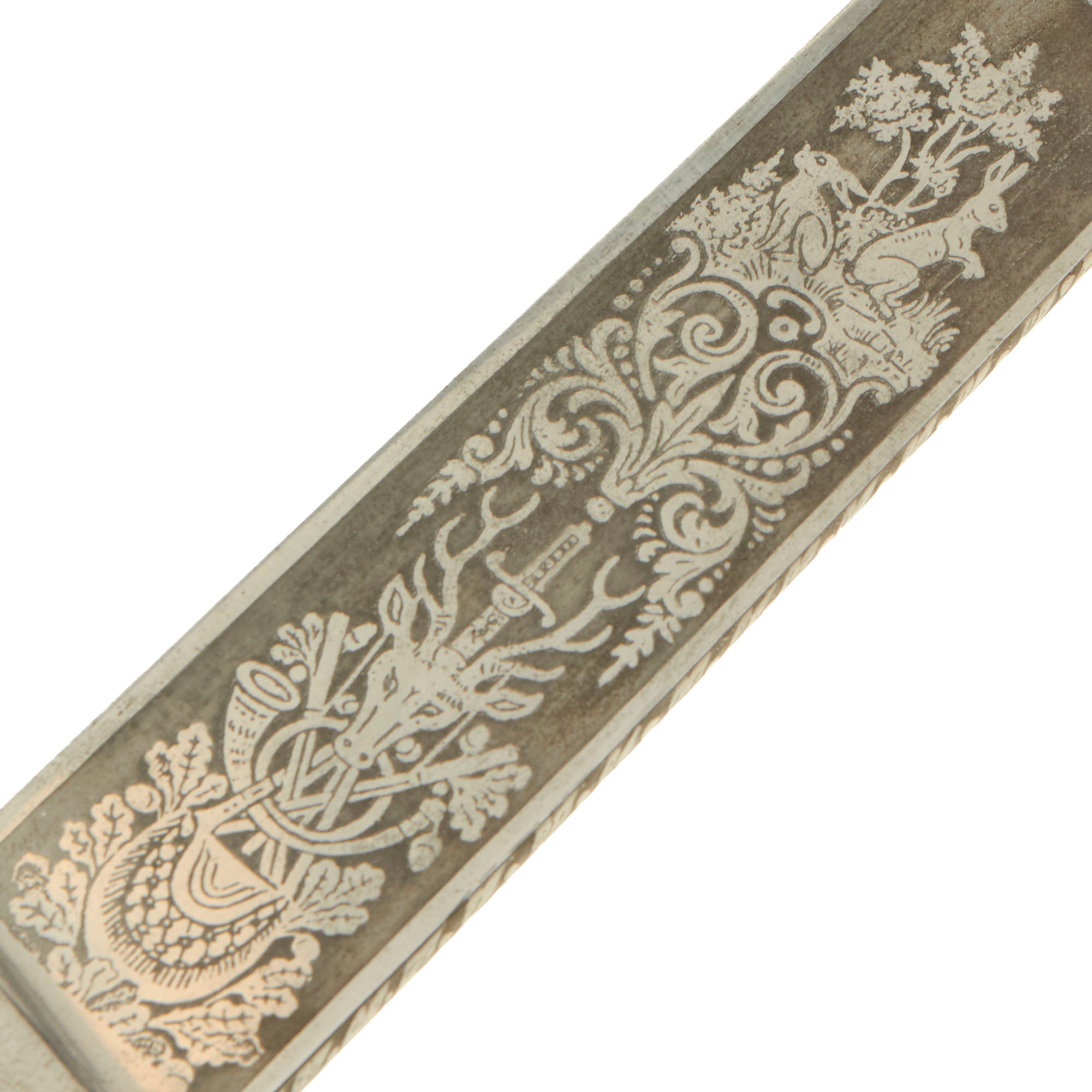 The blade has lovely etched panels on both sides, showing floral engraving as well as animals in the forest. The blade is marked on the ricasso with the double trademark "King's Helmet" (Ritter-helm) alongside a "Kings's Head" (königskopf) over W.K. & C. logo of legendary German maker Weyersberg Kirschbaum & Cie of Solingen. This trademark is used on privately purchased blades and walking out bayonets in the late 19th and early 20th centuries, and is absolutely correct for this sword. This company is a famous manufacturer of military swords and cutlery in Solingen, Germany - a city famous since the middle ages for its metal-working and craftsmanship in sword making.