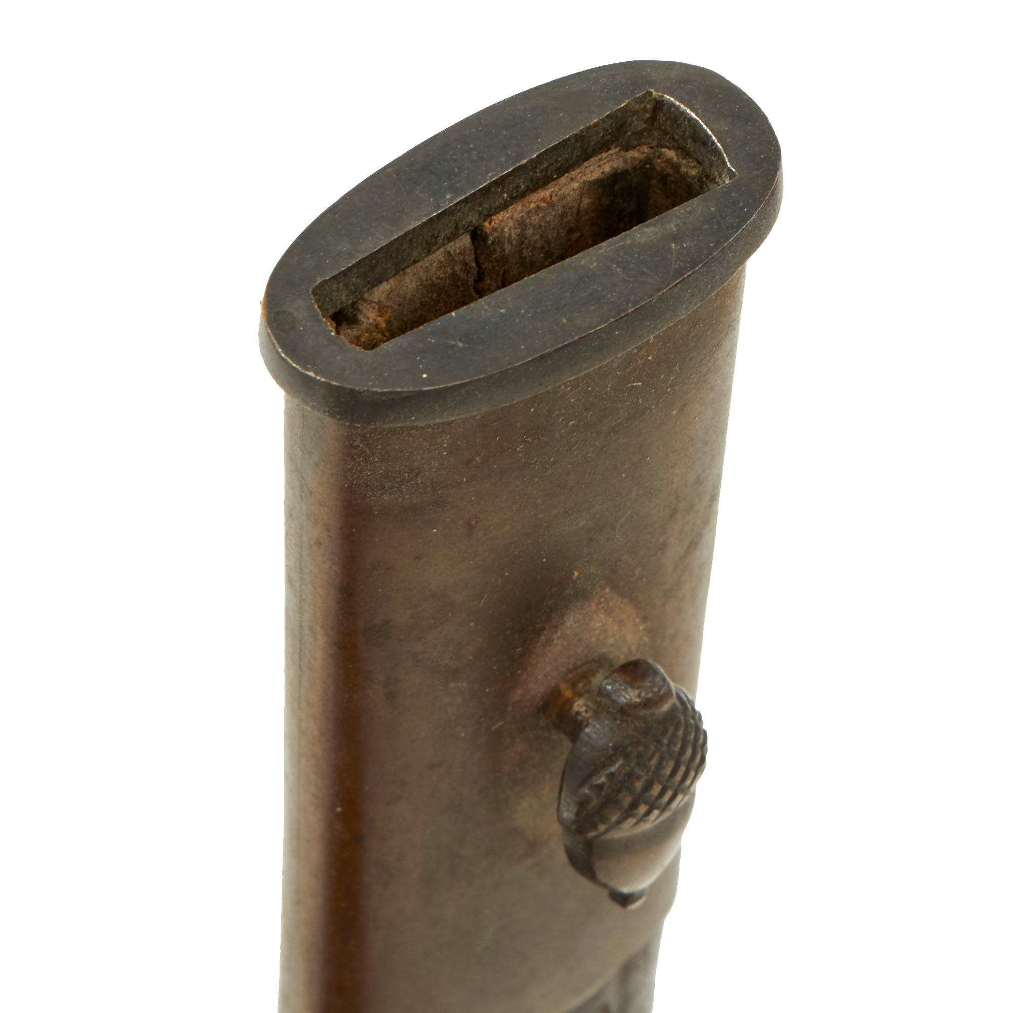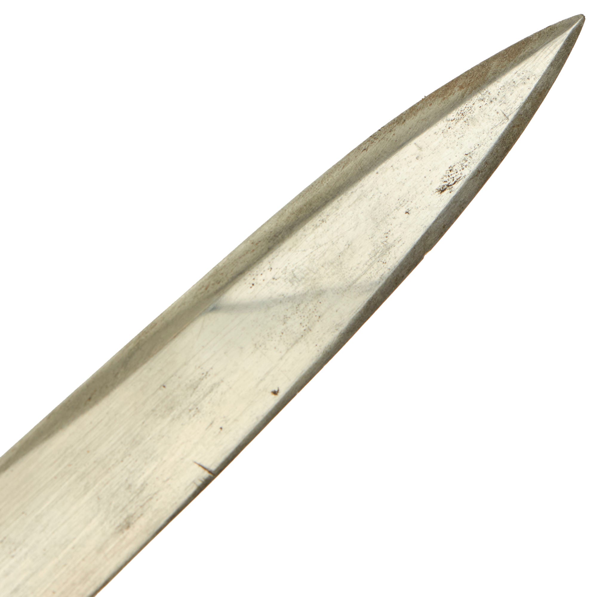 The blade is still straight, free of damage and does have a bit minor staining and surface rust. The blade is unsharpened and was generally intended for thrusting, to finish off their wounded catch. The green felt washer is still in place.