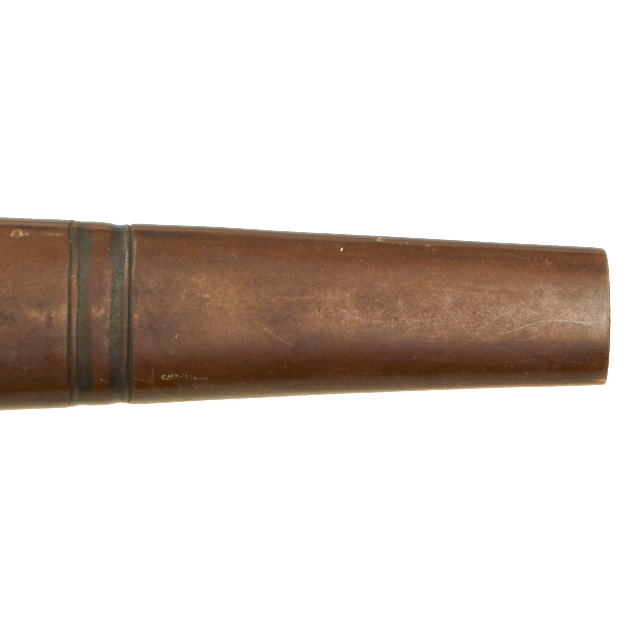 The leather scabbard is in good condition, though the leather has definitely dried out over time, and has had the finish chip in places. The brass fittings are nickel plated, which is well retained in most areas. As we often see, the frog button is shaped like an acorn.