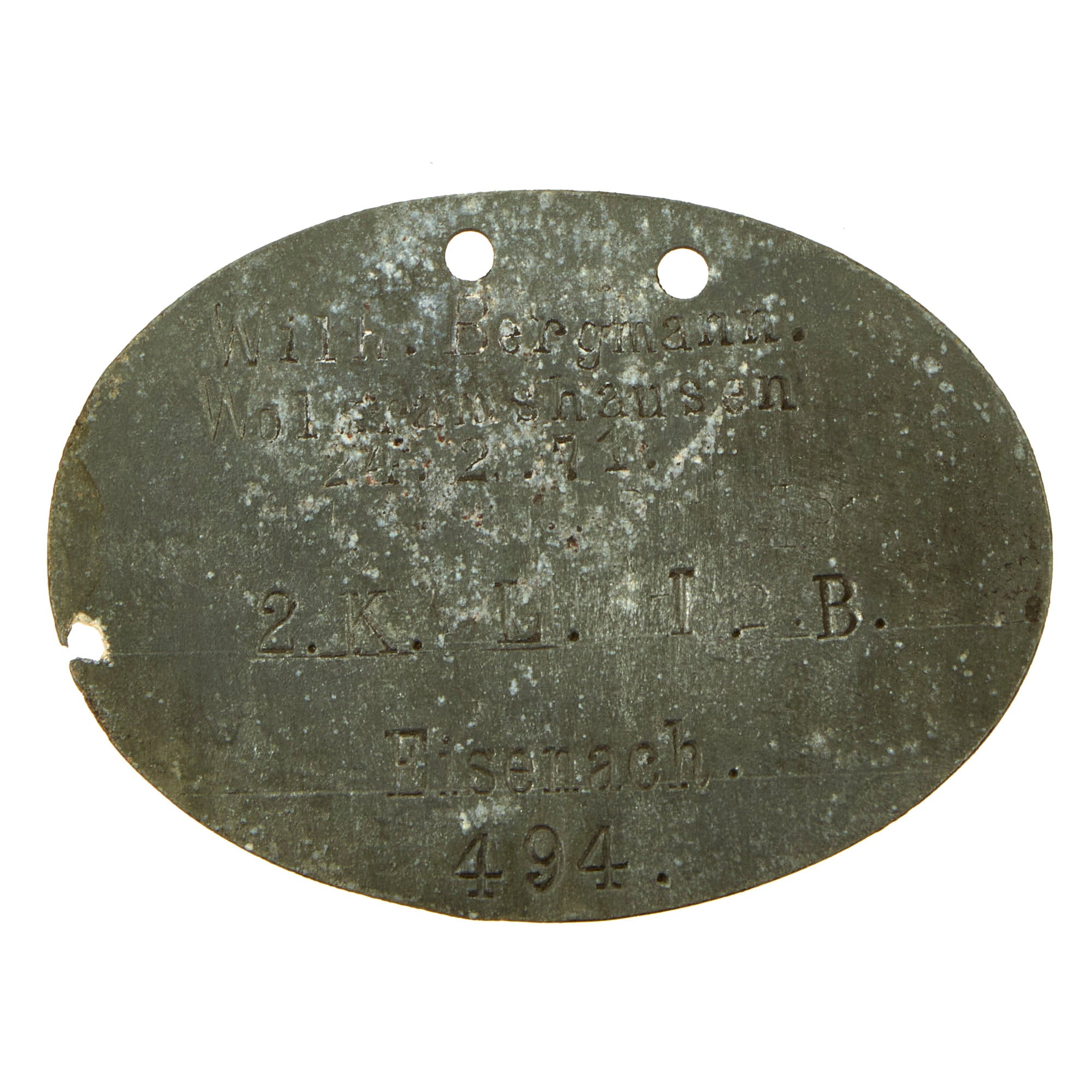 According to Clive Law's article "Use of the Identity Disc in the Imperial German Army" in Volume 2, Issue 3 of "Military Artifact", the forces of Imperial Germany utilized three types of identity disc during the Great War. All three patterns were oval in shape, with two holes through which a cord was run and which allowed the disc to be worn around the soldier's neck. The tag was used to identify the soldier, especially in the event of his death.