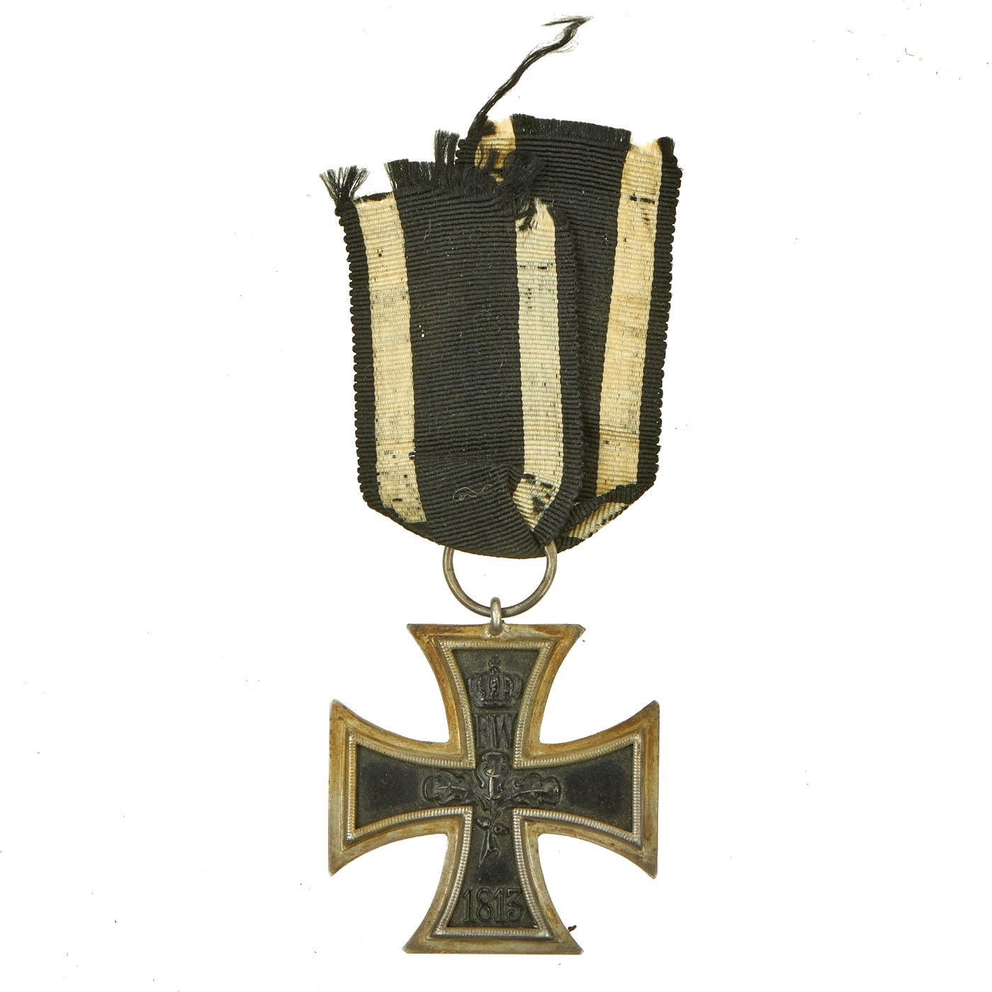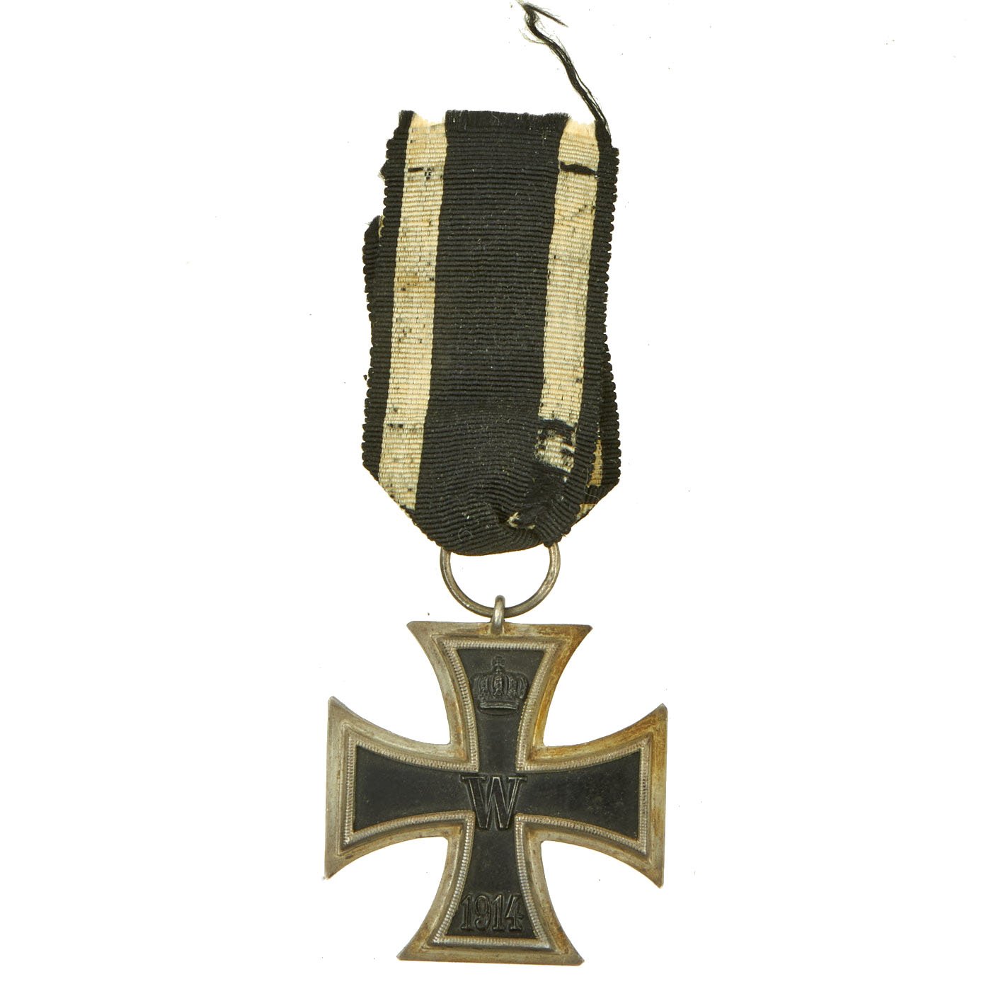 - One Imperial German WWI Prussian Iron Cross 2nd Class 1914 (Eisernes Kreuz II. Klasse 1914) with Ribbon. This fine example is in very good condition, with most of the black paint still present on the central cross on both sides. The ribbon is a bit worn, and definitely looks to be original. There is a marking on the hanging ring, but we cannot make out what it says.