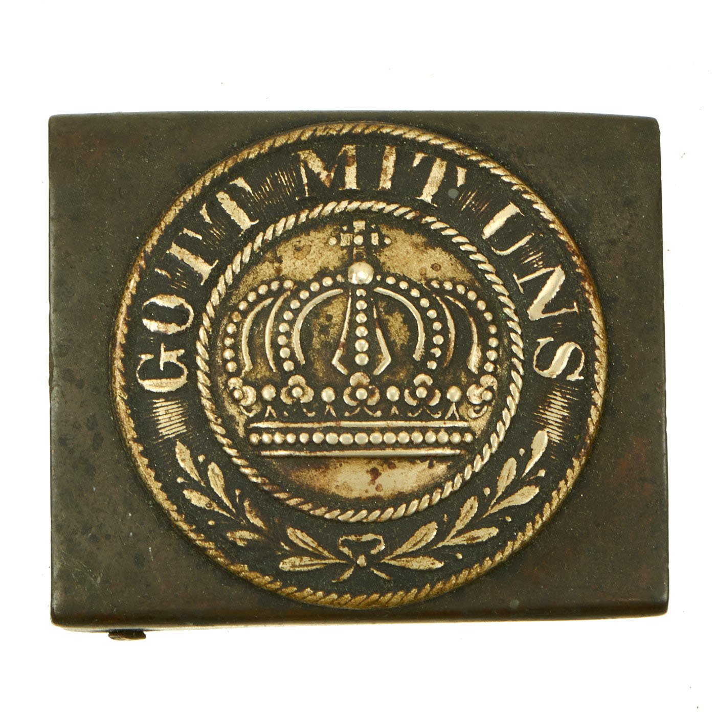 - One Imperial German WWII M1895 Copper and Nickel Belt Buckle (Koppelschloß) from the Kingdom of Prussia, showing a crown with GOTT MIT UNS (God [is] With Us) above it it.