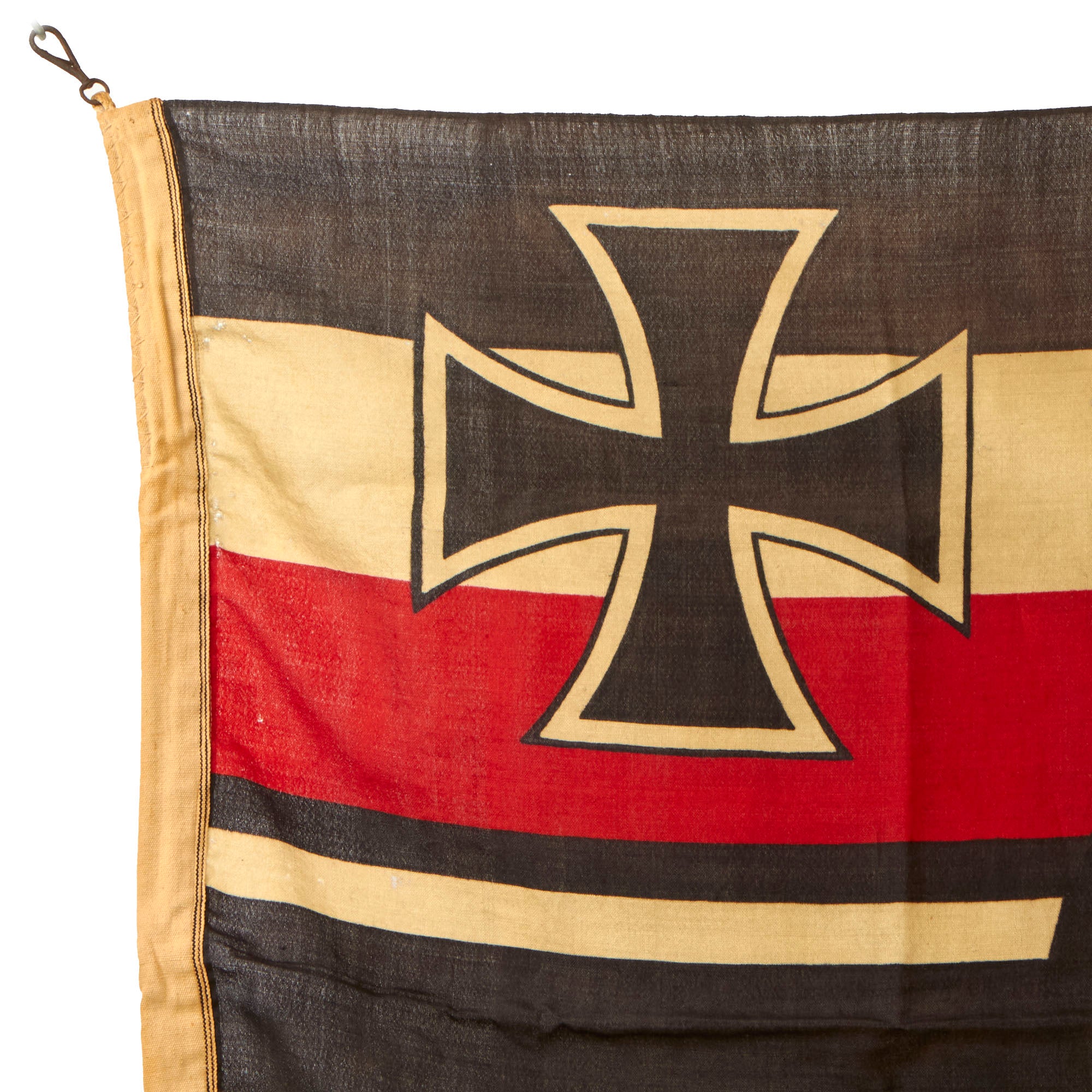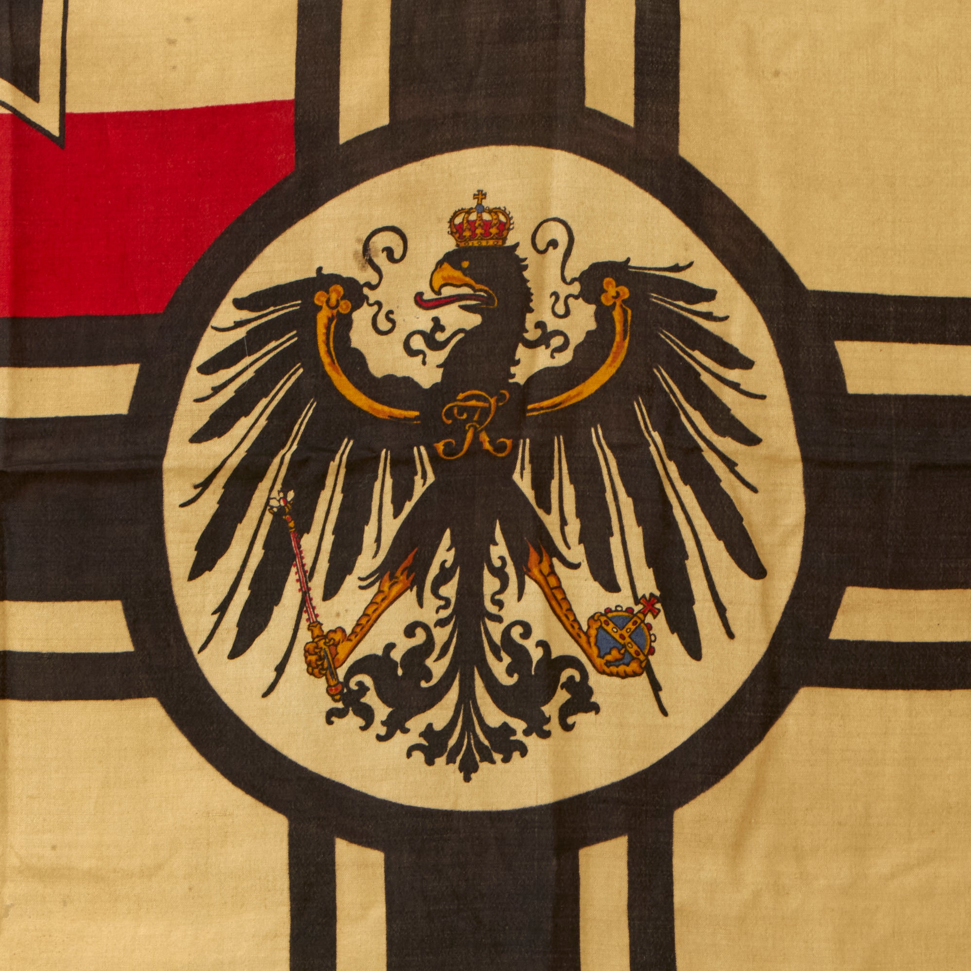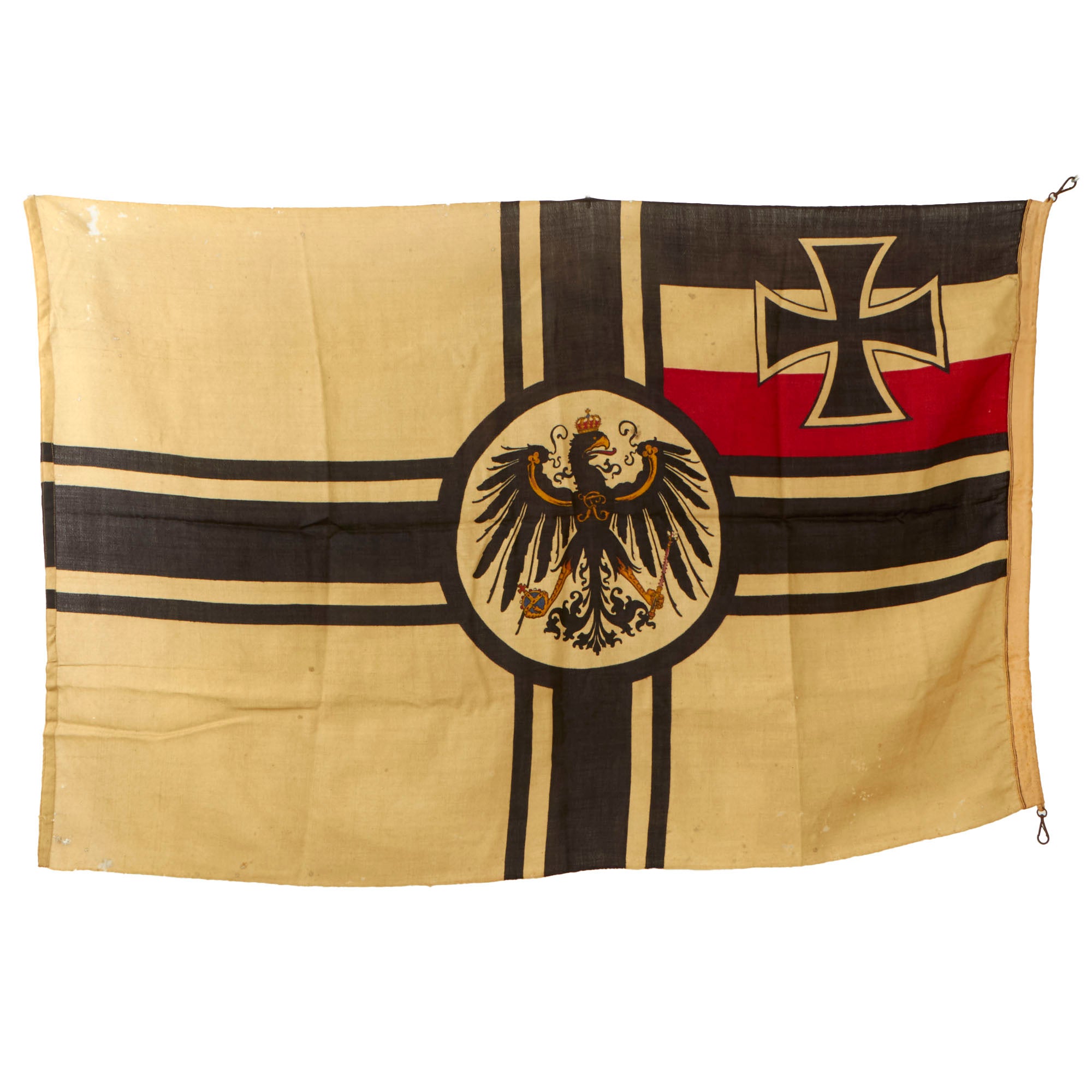Original Item: Only One Available. This is a totally original Imperial German WWI Naval War Ensign Battle Flag, with a large Balkenkreuz (Beam Cross) in the field, with a circle around the Imperial German Eagle at the intersection of the cross. The canton of the flag contains the imperial state colors and the Prussian Eisernes Kreuz (Iron Cross). The flag is made of cotton or linen, the standard material for flags of the period.