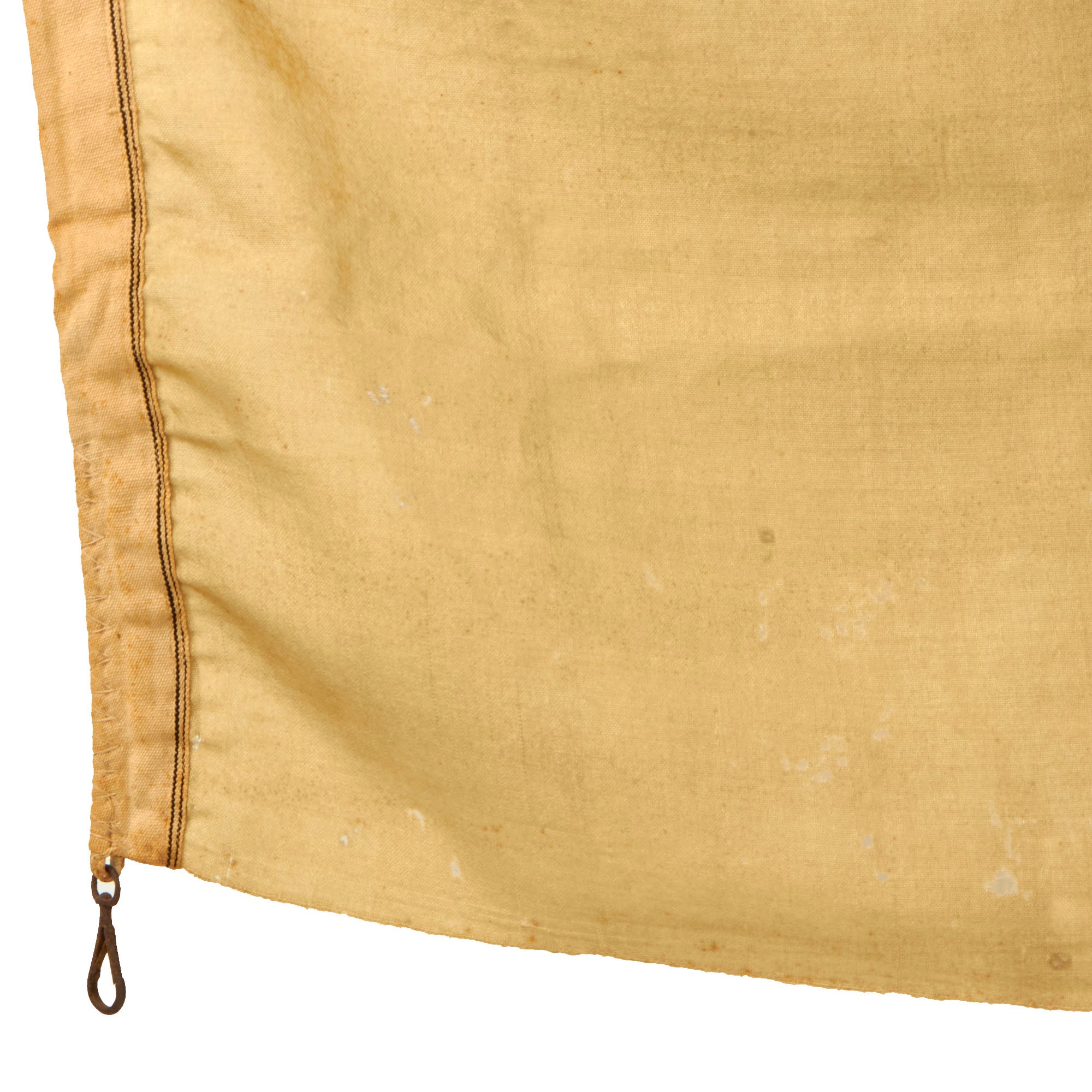 This flag is in good condition, with the normal staining from age and a myriad of small holes across the material. The header has oxidized metal hooks at both ends. It is one of the most attractive issued during WWI, and would make a great display piece.