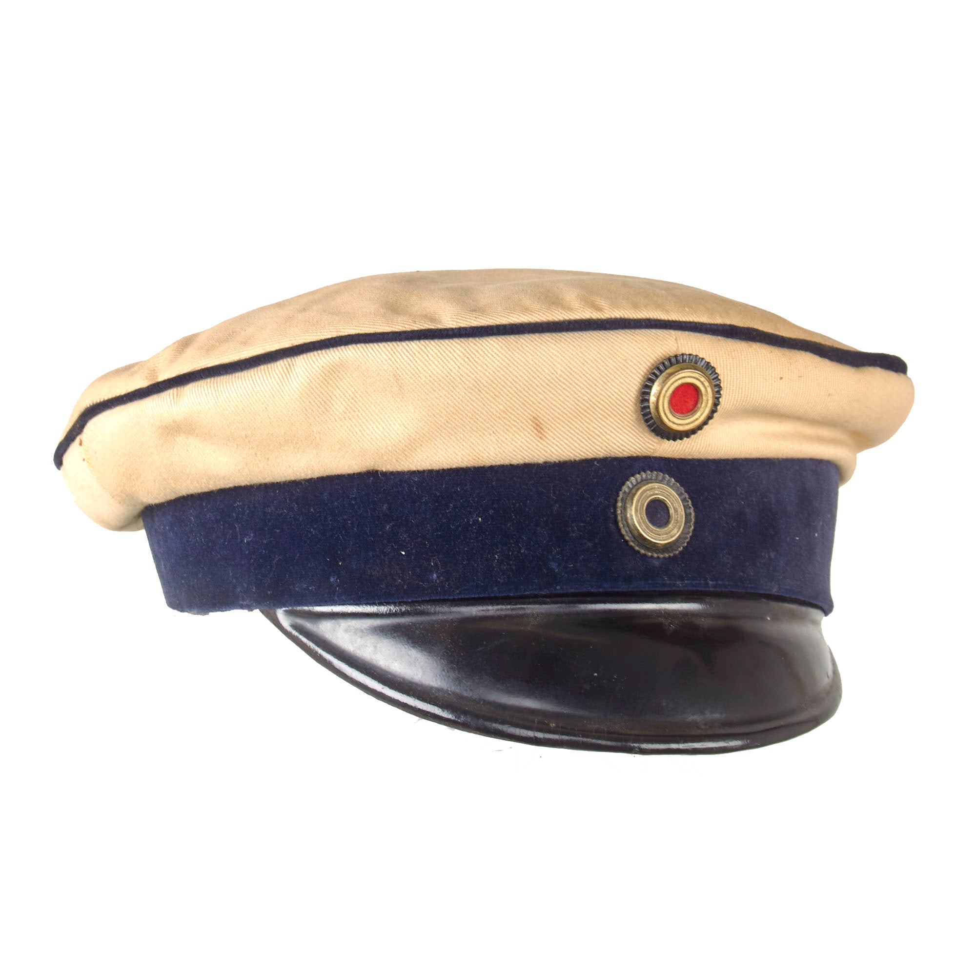 The front of the cap bears a Black, White and Red Reichskokarde (Imperial Cockade) on the front of the crown, with a Black and Silver Cockade on the cap band for Prussia. The exterior is in very well-worn and slightly stained condition with the velvet very well-retained.