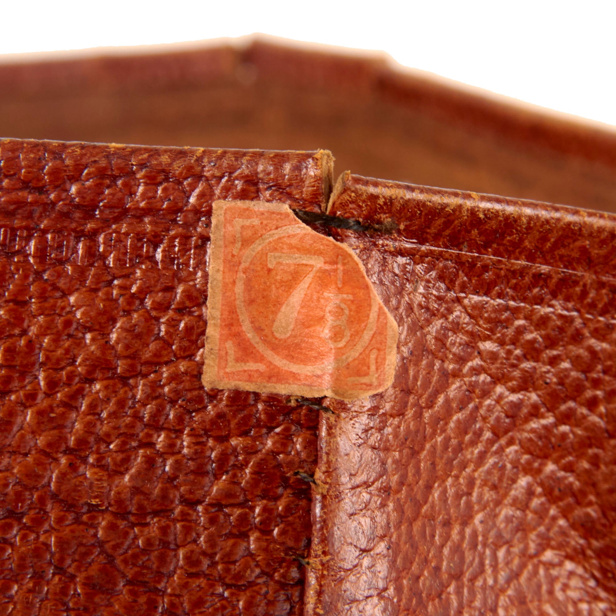 The interior shows a well-retained sweatband with a size tag, 7 ⅛. The sweatband retains some of its stitching but there is very heavy loss to the front. The sweat protector is now gone, as is the maker’s mark under it. The sweatband is actually perforated with the owner’s initials, GHP, a great detail.