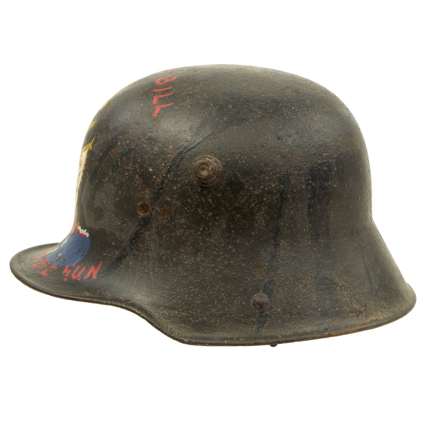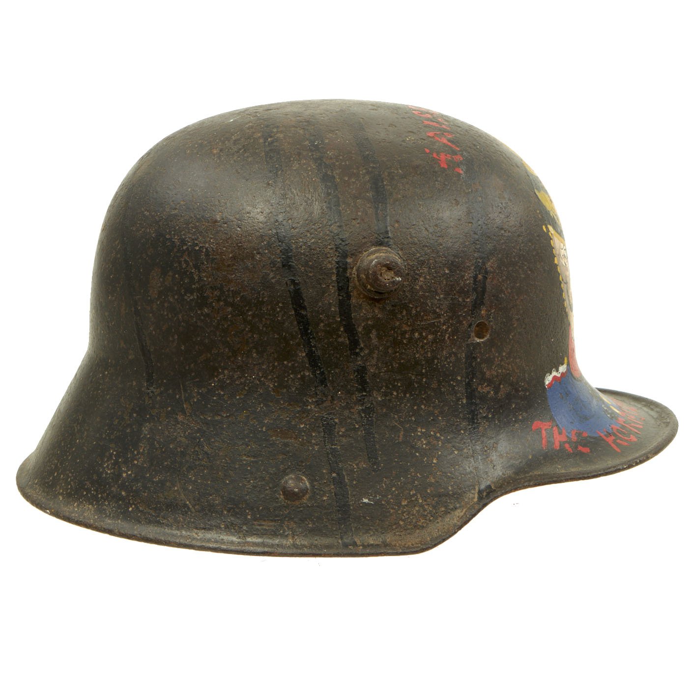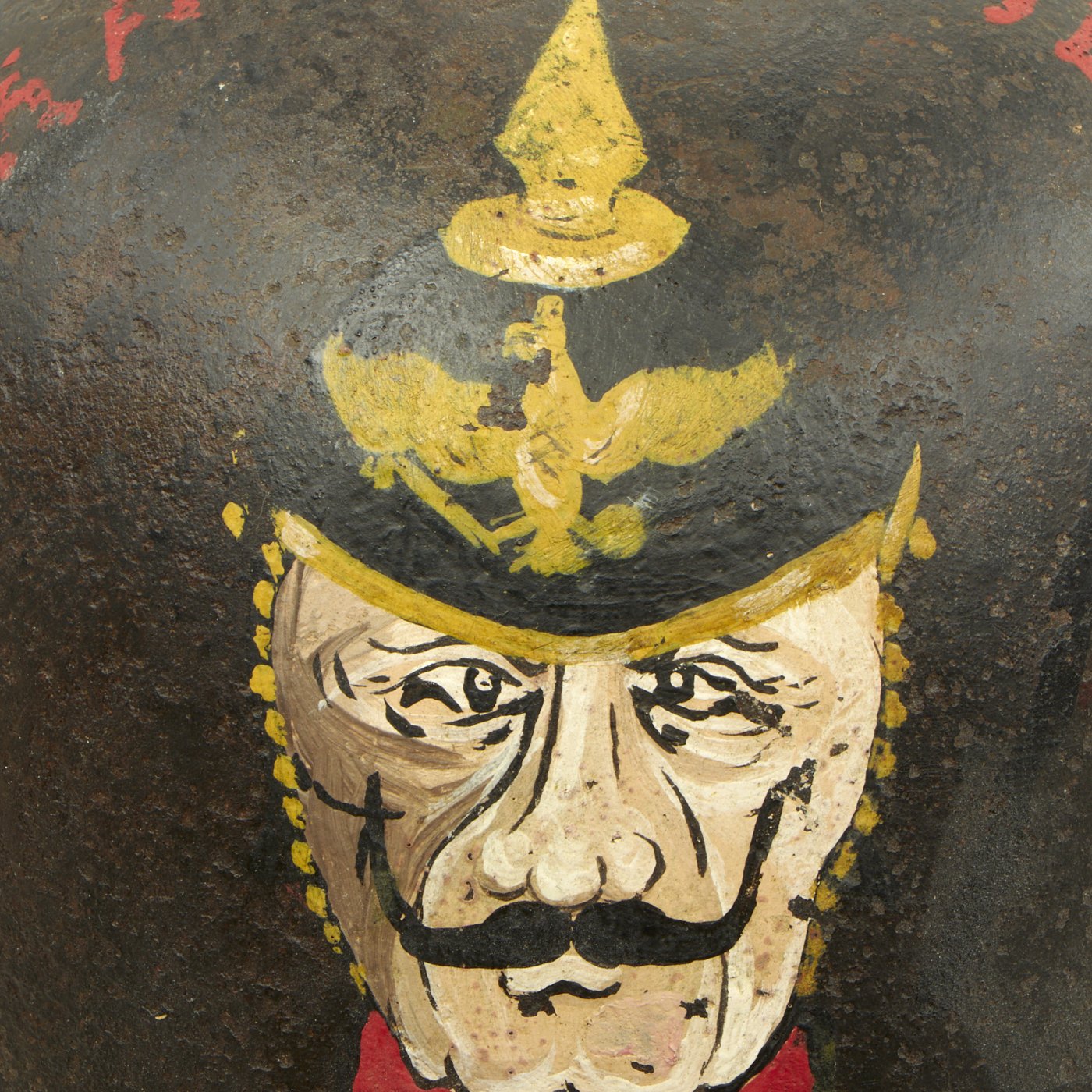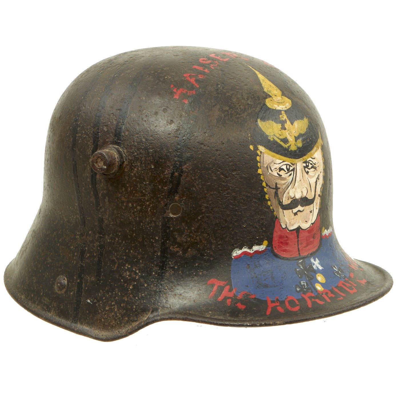 Original Item: Only One Available. This is an eye catching example of an original WWI German M16 Helmet shell. The stamped, sheet steel constructed helmet appears to have been repainted post war. The helmet itself is in relic condition, with a simulated German camouflage pattern applied, and a caricature of Kaiser Wilhelm painted on the front, with Kaiser Bill / The Horrible Hun. Most likely this helmet was a battlefield pickup after the war, with the added paint likely added by a veteran sometime in the 1940’s-1960’s.