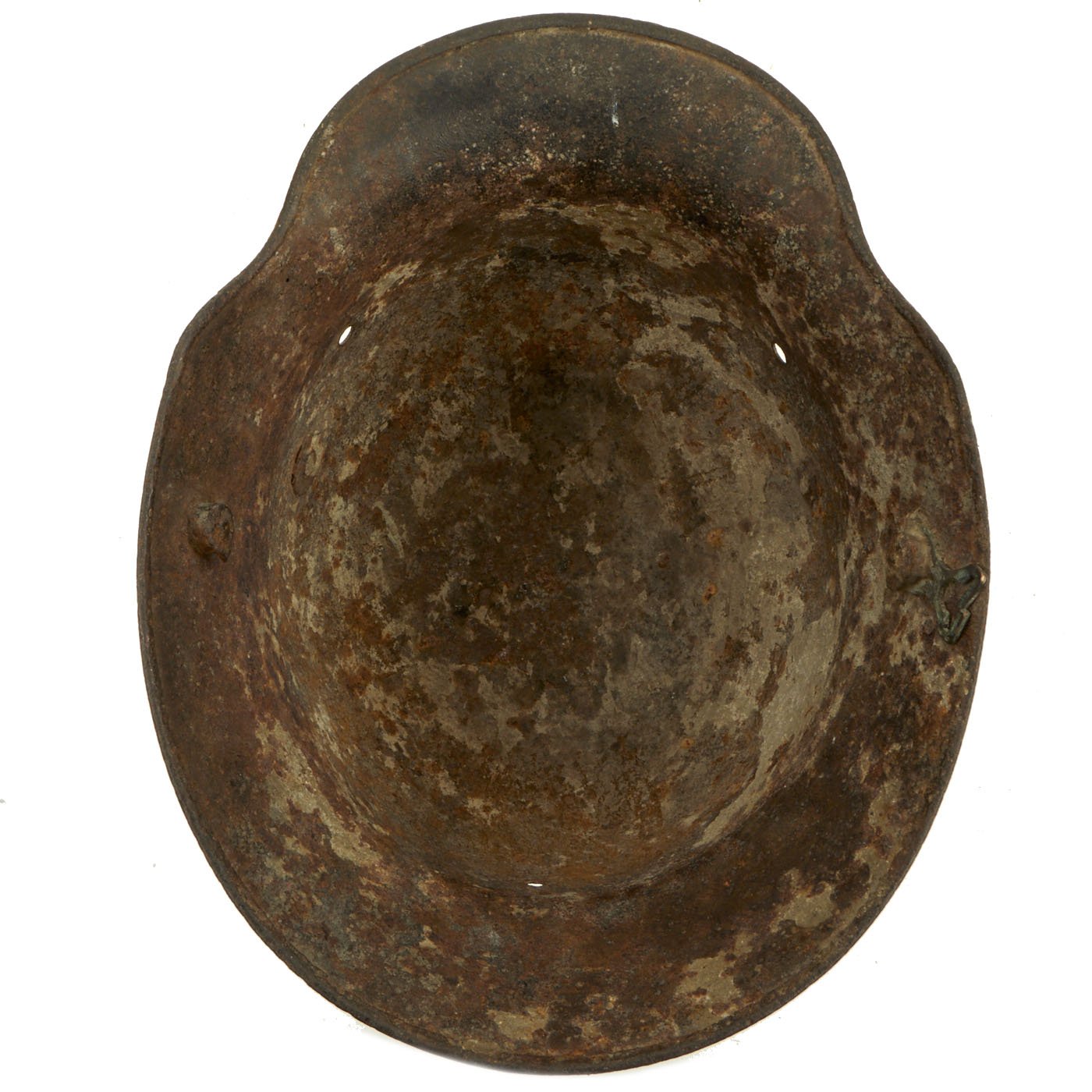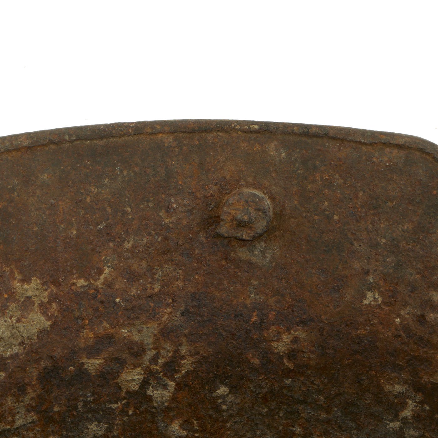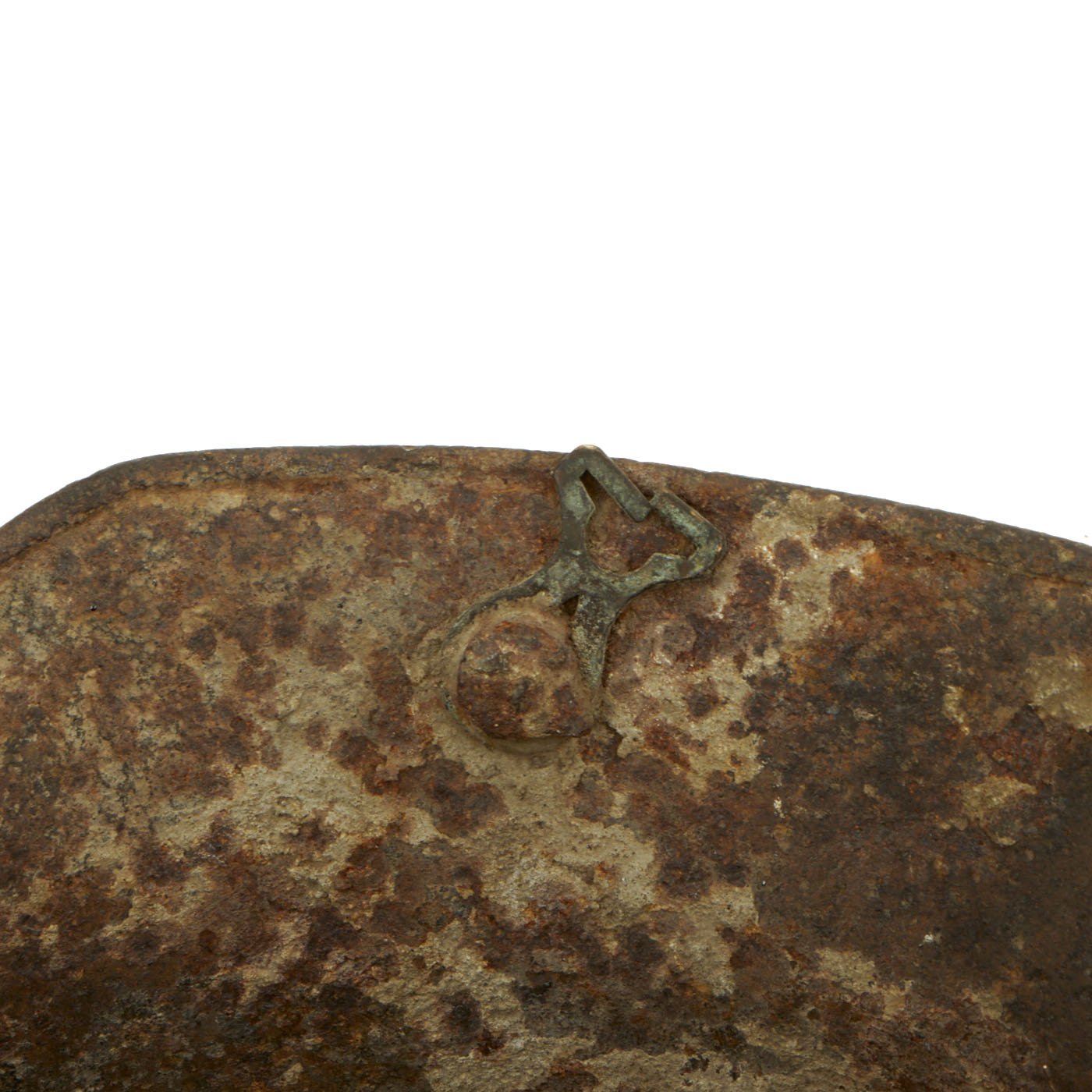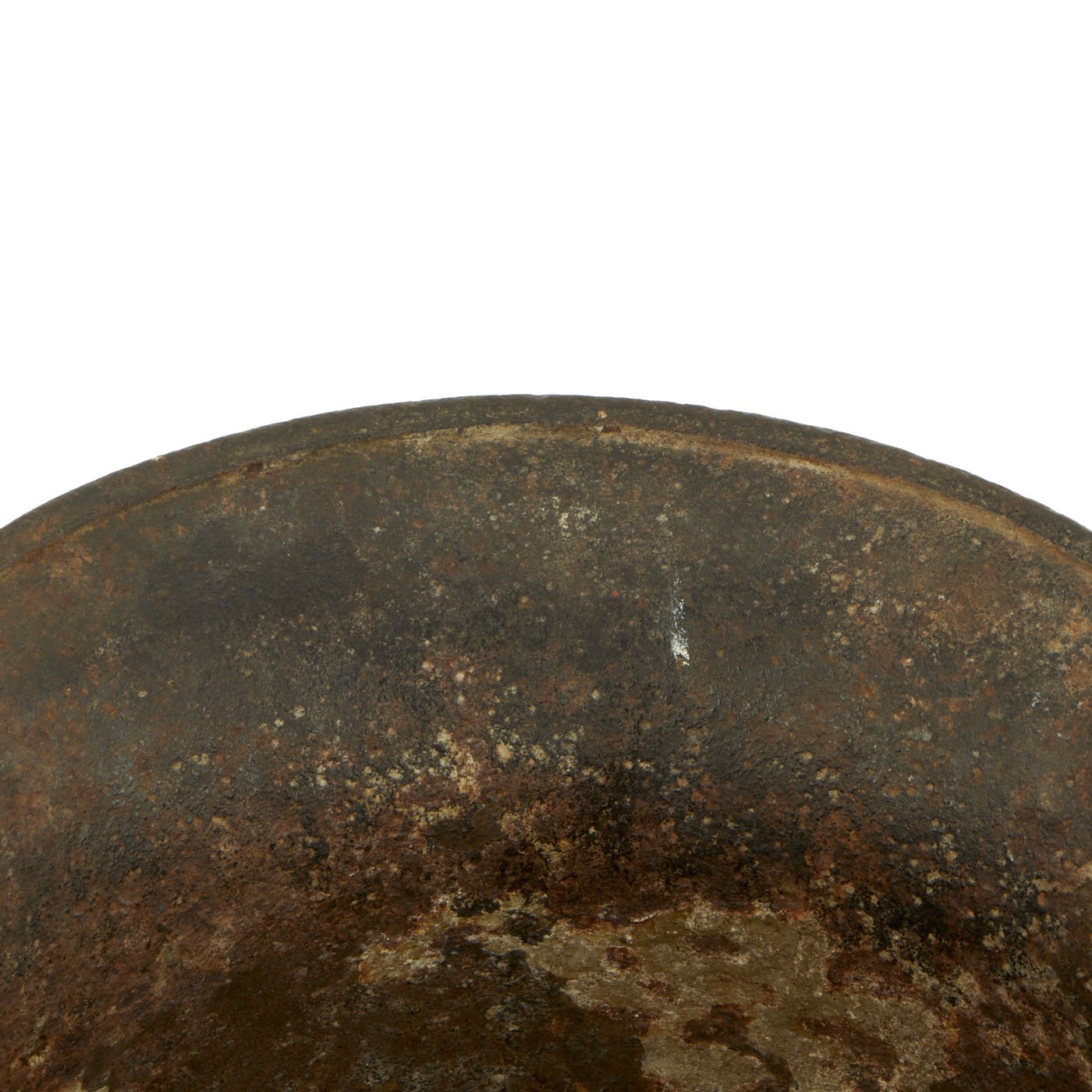 The helmet has both the dome headed chinstrap retaining rivets and both of the extended ventilation side lugs. The liner, liner pins and chinstrap are absent. Certainly done post war as a souvenir or memento of the soldier's time in service.