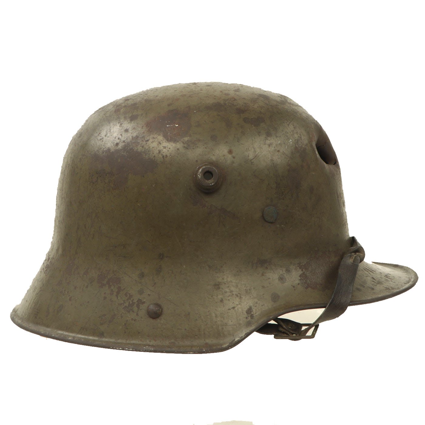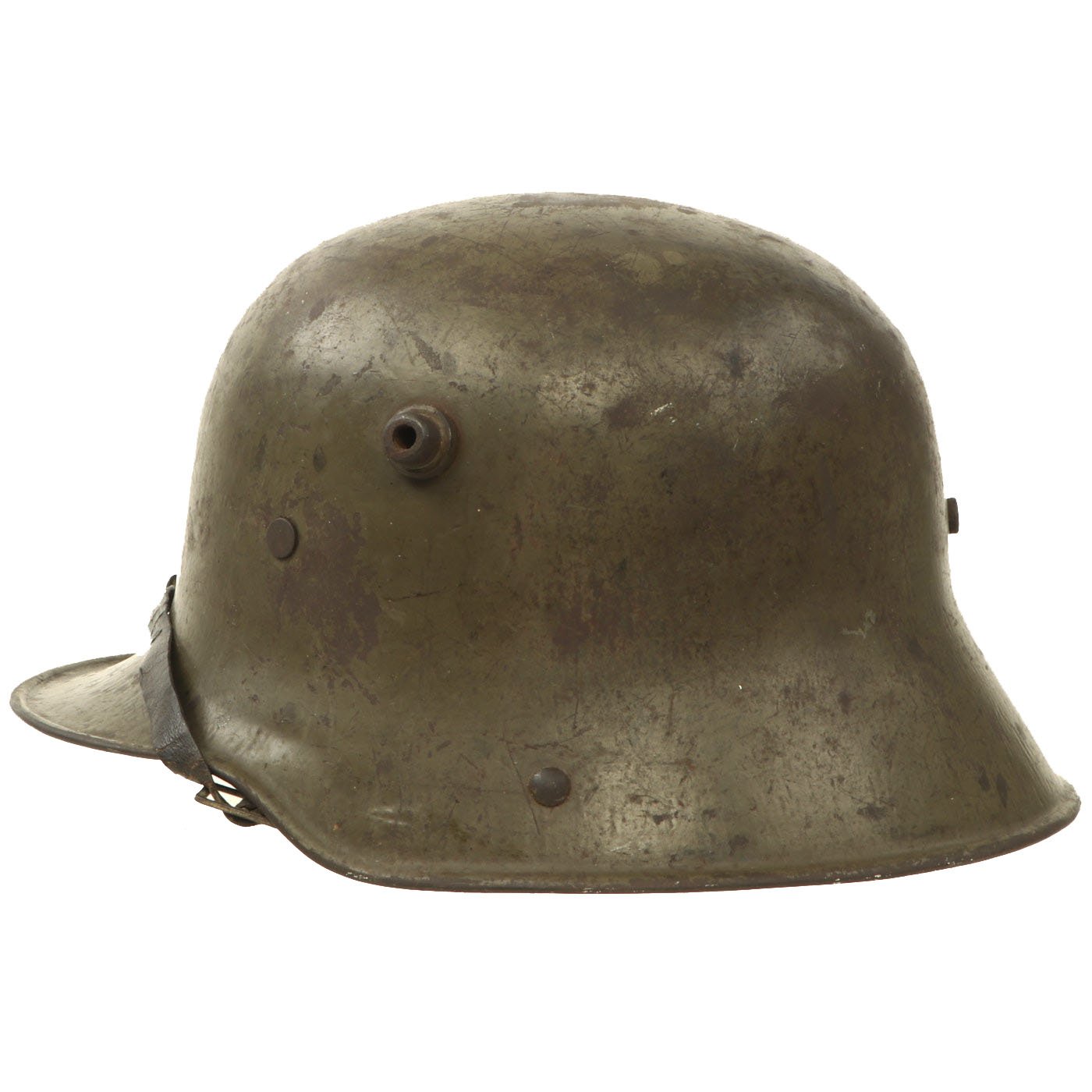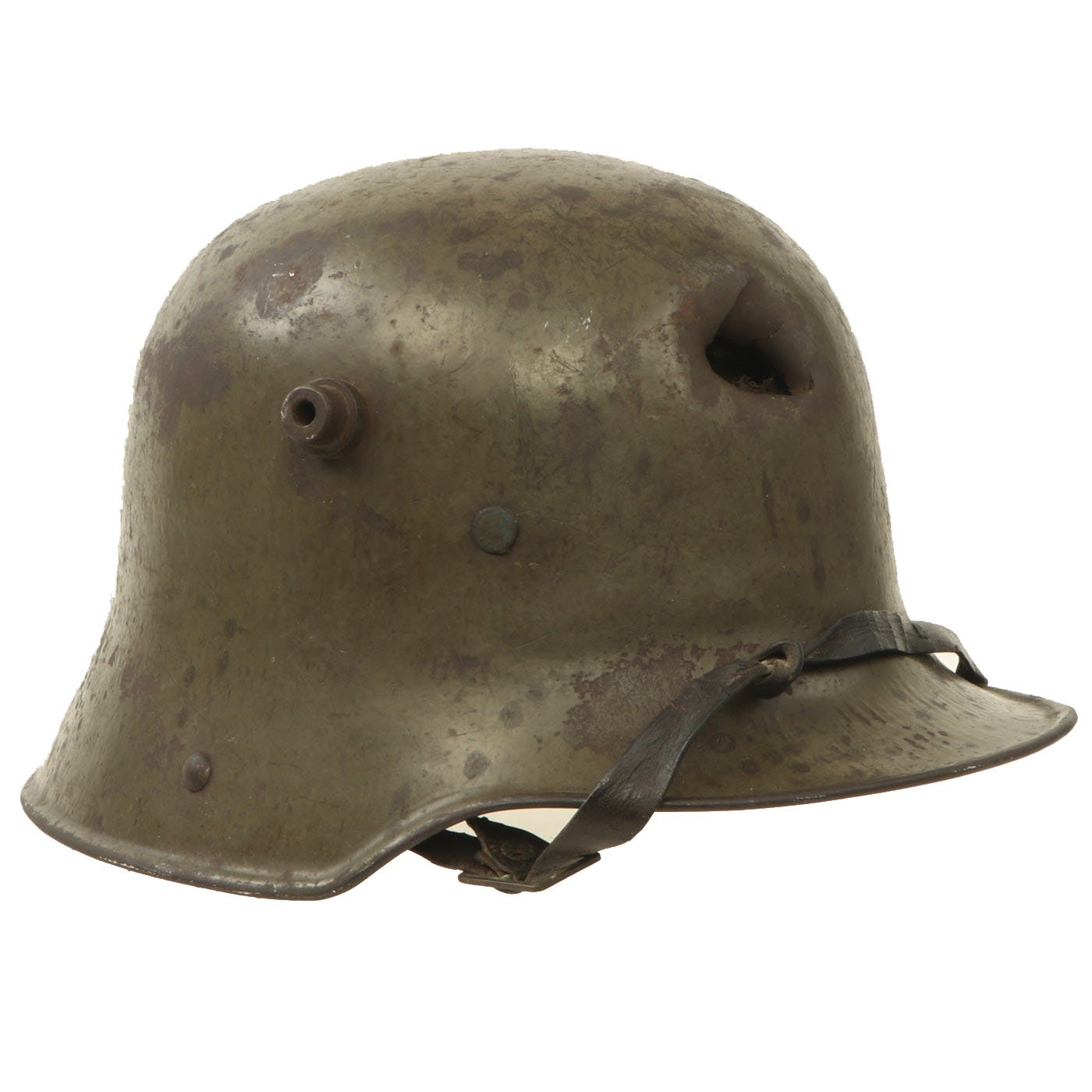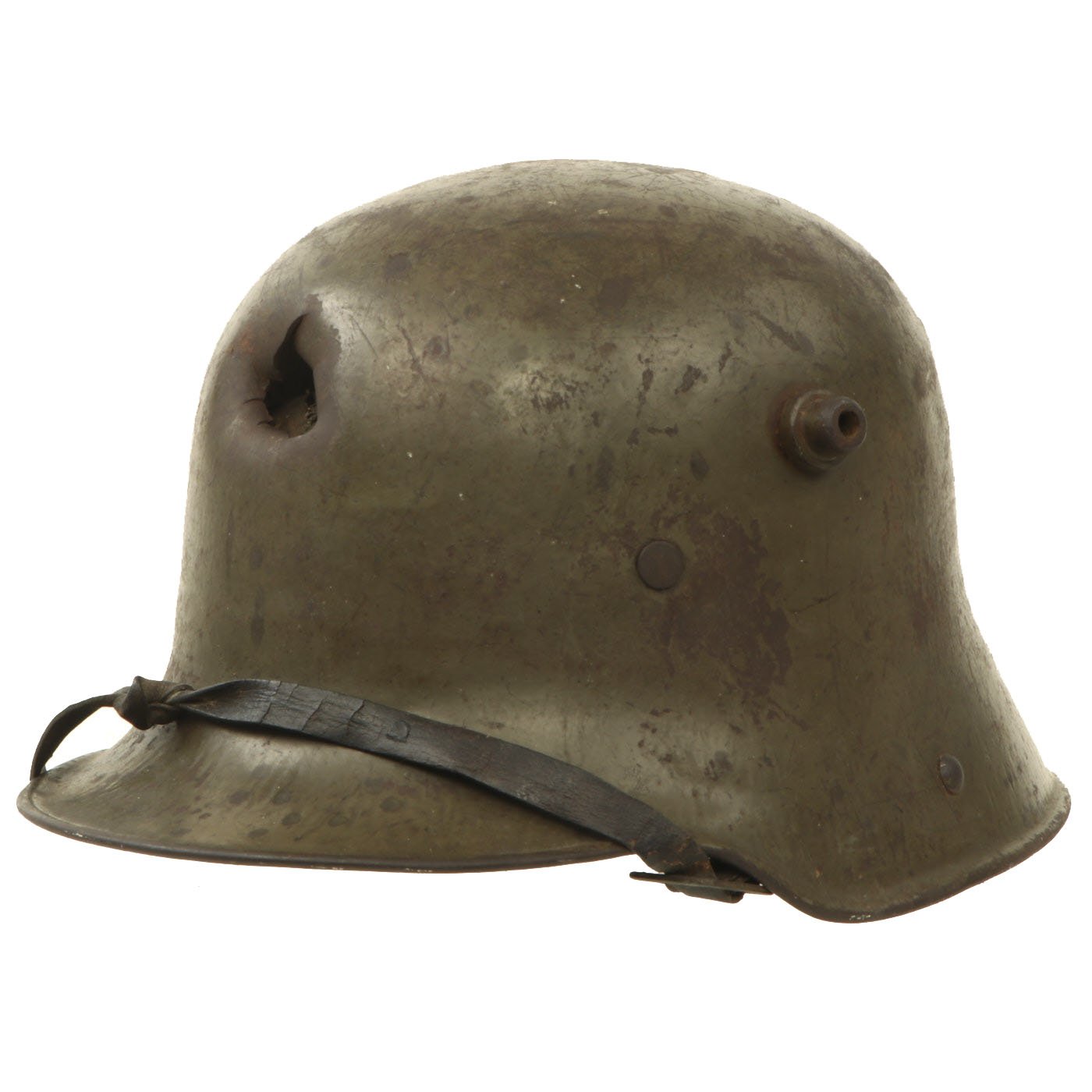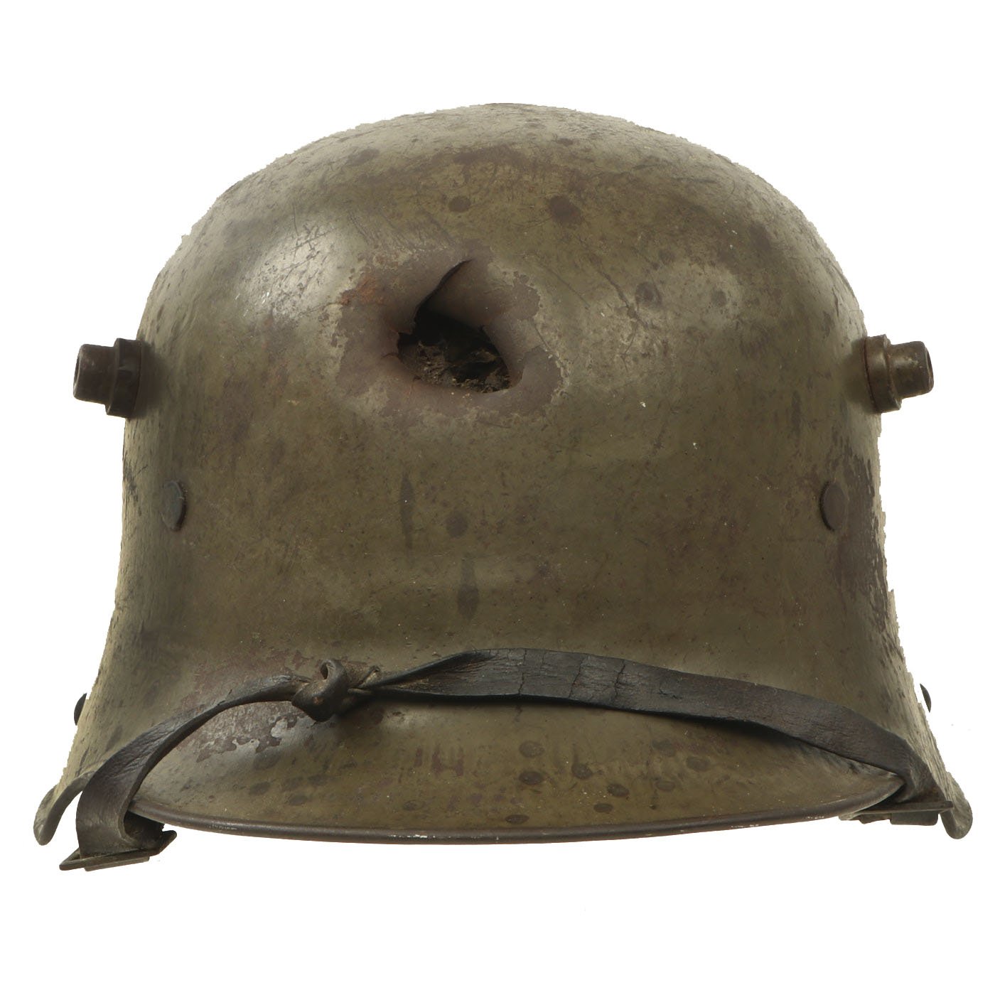 Original Item: Only One Available. This is an amazing example of a totally original WWI German M16 Helmet, which was "Shot Through" long ago, almost certainly killing the wearer if it was on their head at the time. It was then left on the battlefield for a while, which resulted in some deterioration of the liner and staining on the inside. It was not left there for long, which is why we can offer it in such wonderful condition.